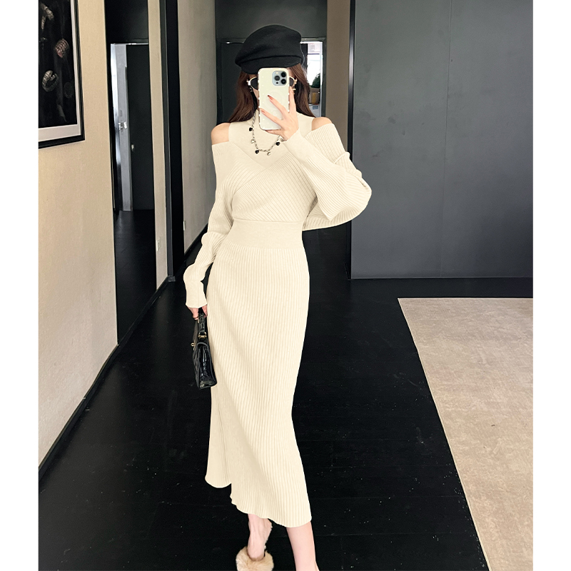 FA46610# 法式小资气质灰色假两件露肩高领针织连衣裙女修身慵懒松弛感长裙