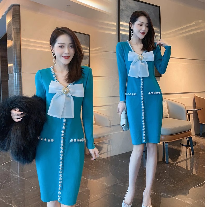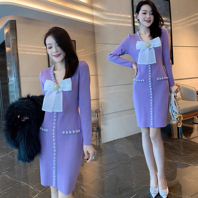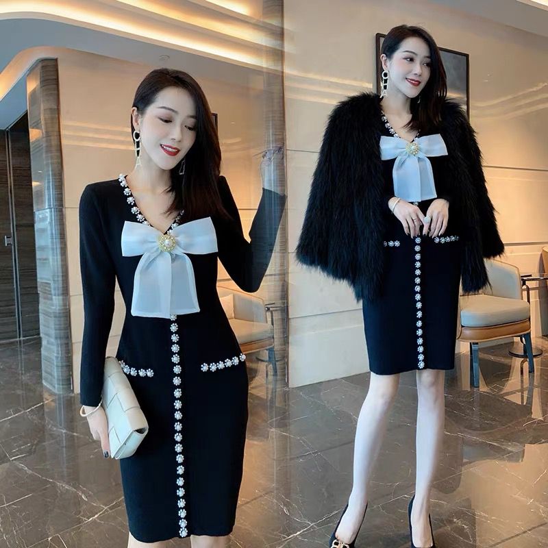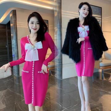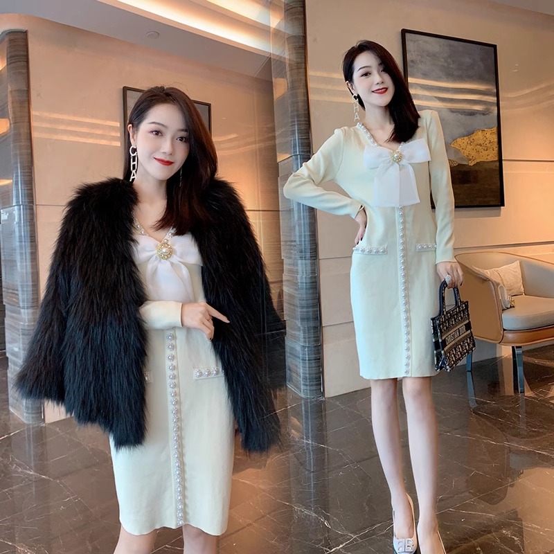FA46629# 韩国气质钉珠蝴蝶结长袖针织毛衣针织连衣裙秋冬小香风内搭打底裙