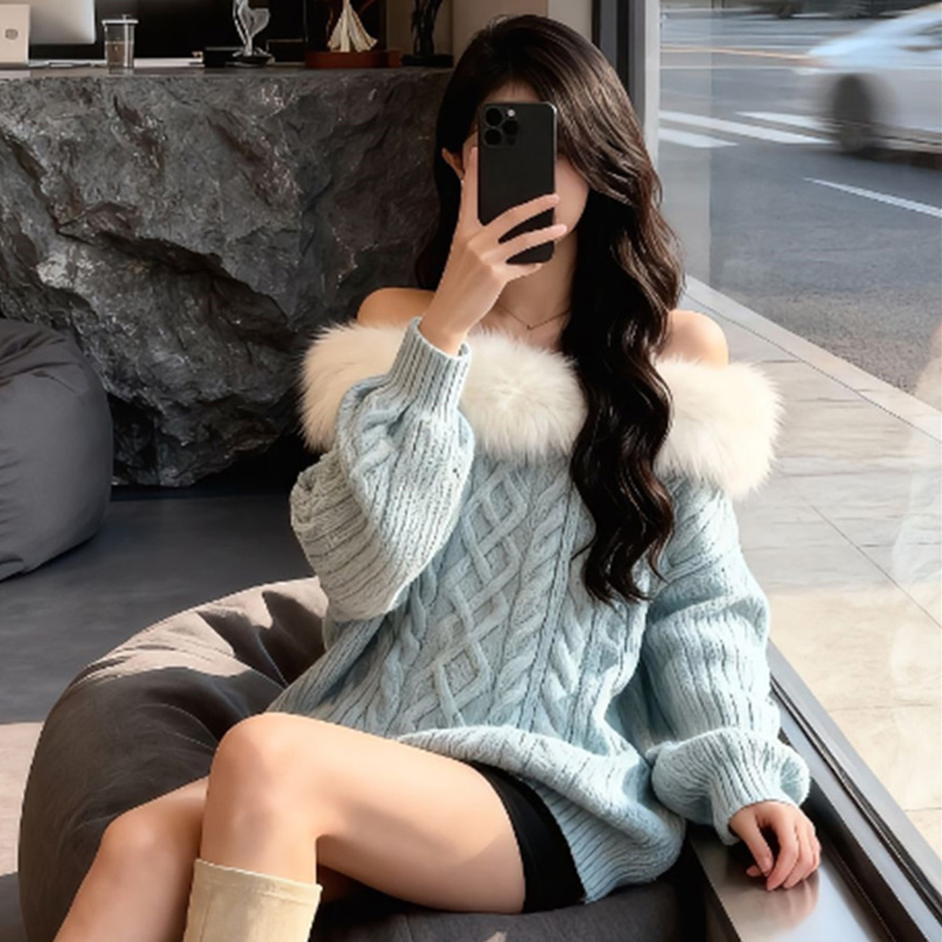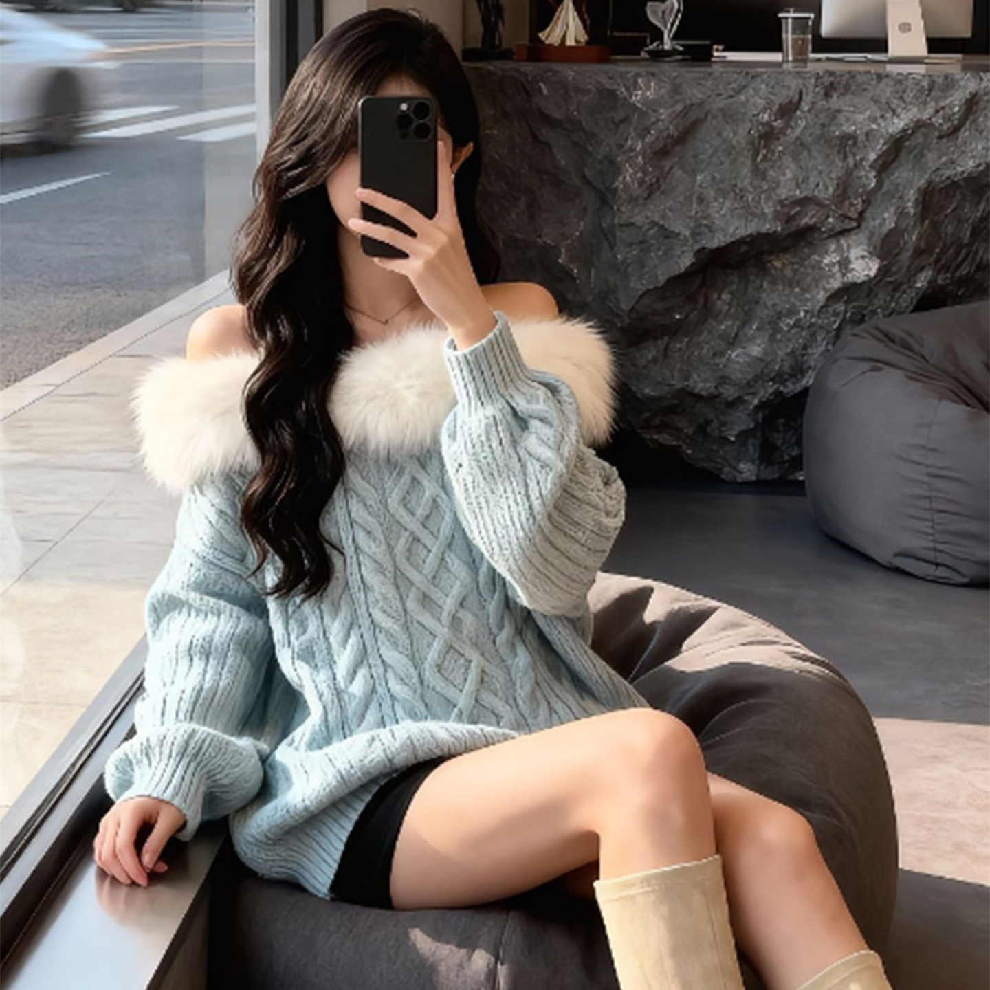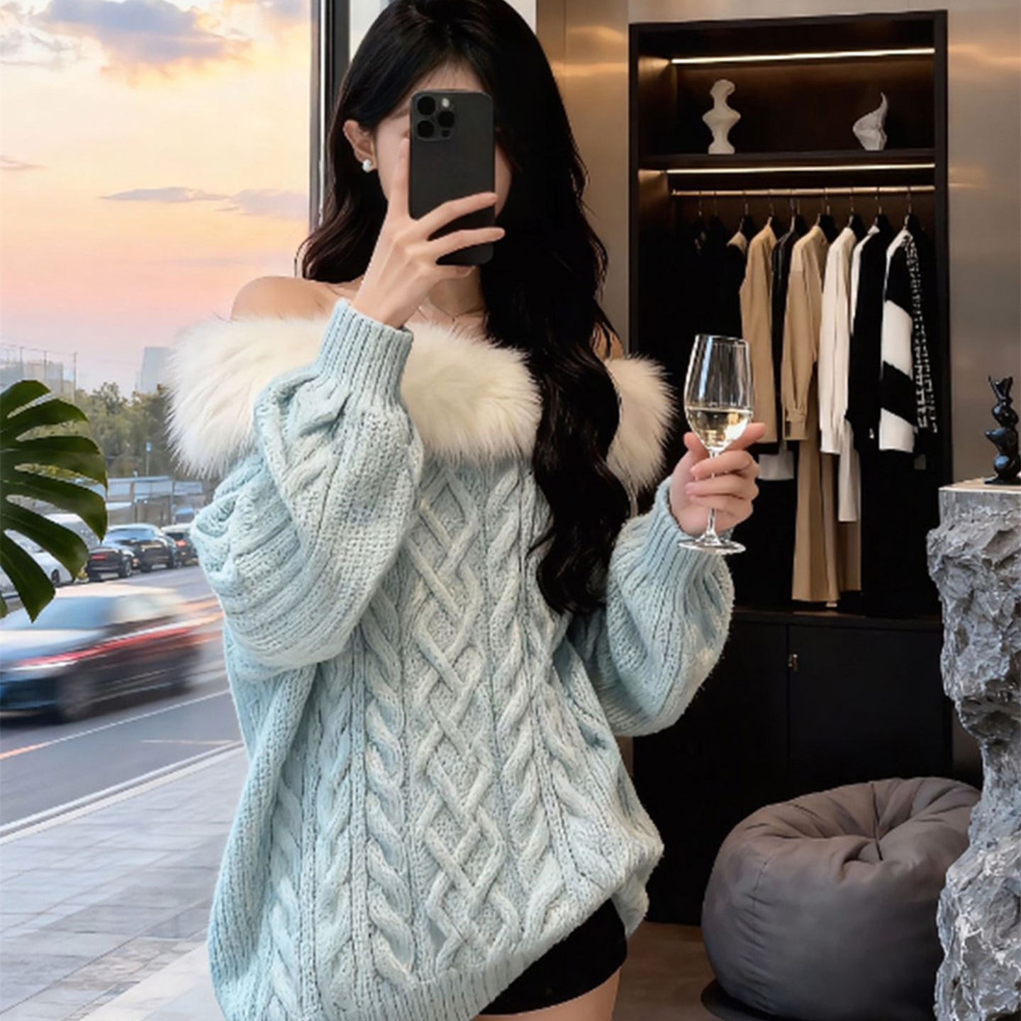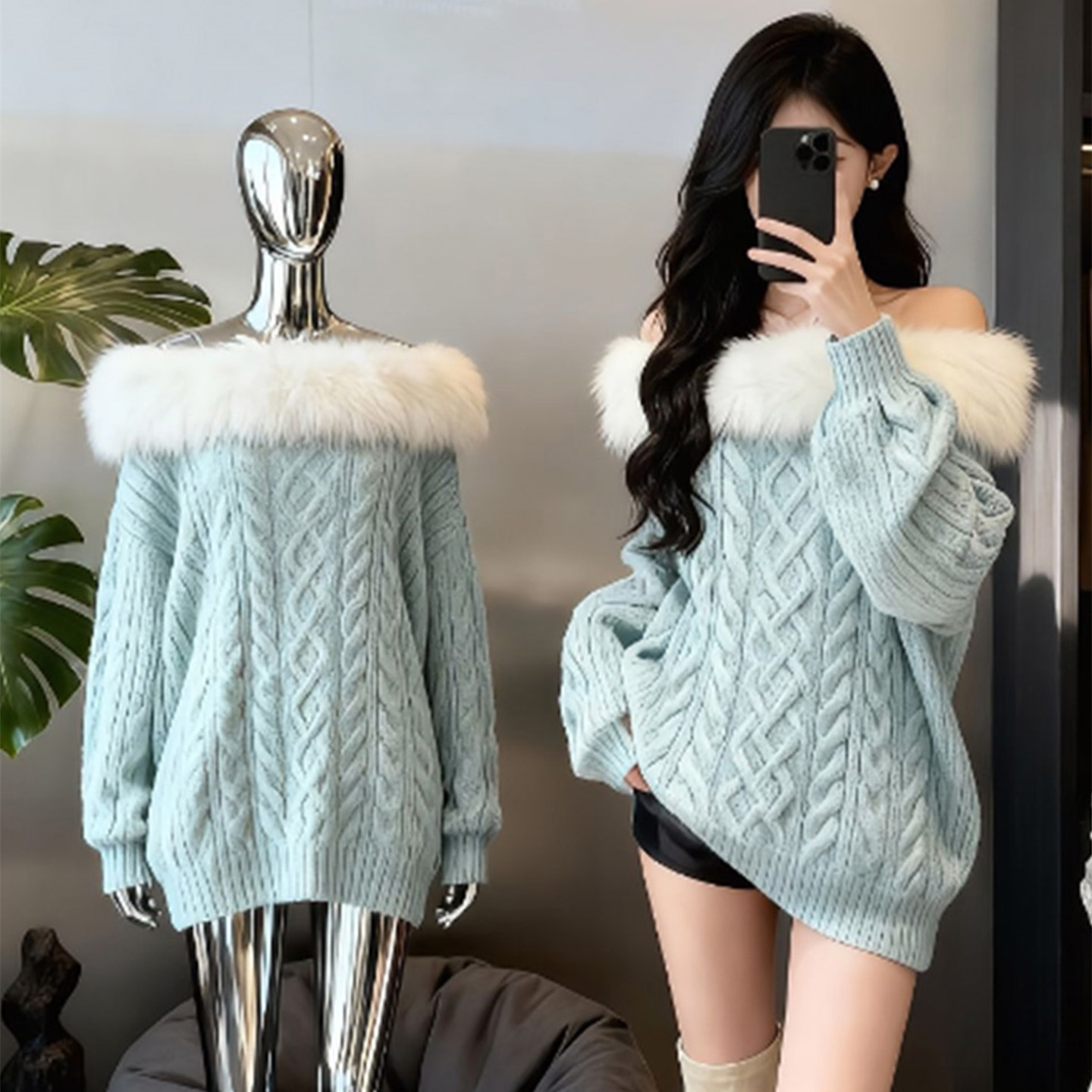 FA51469# 慵懒风一字肩气质毛毛领针织上衣女装秋冬新款加厚巨好看毛衣 服裝批發女裝批發服飾貨源