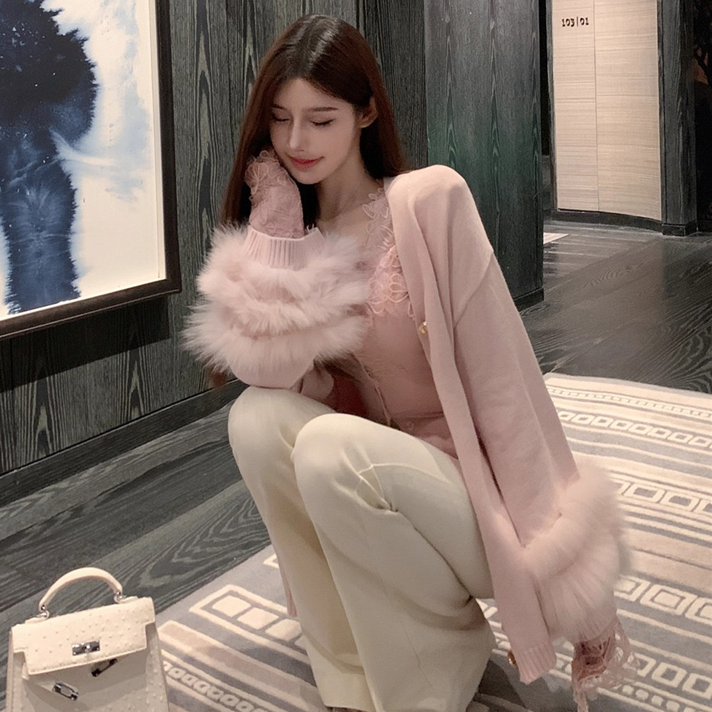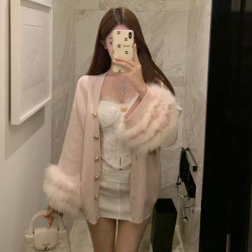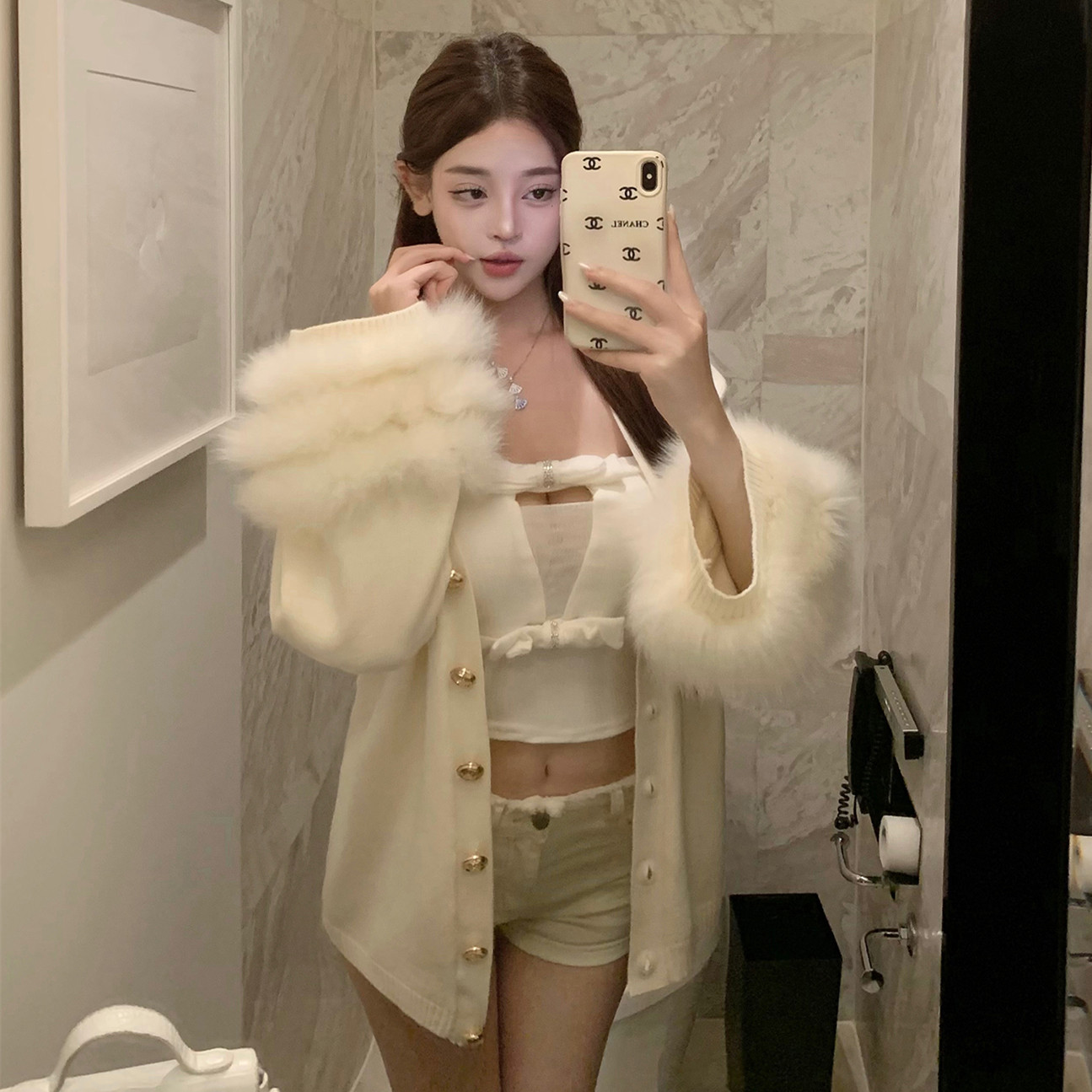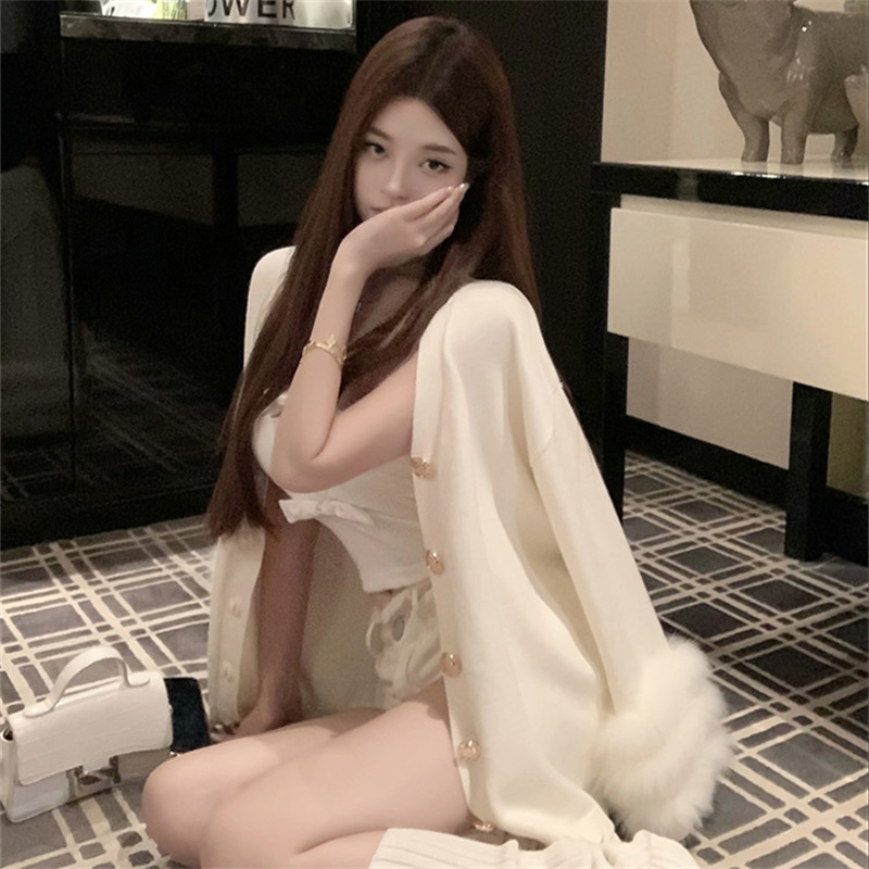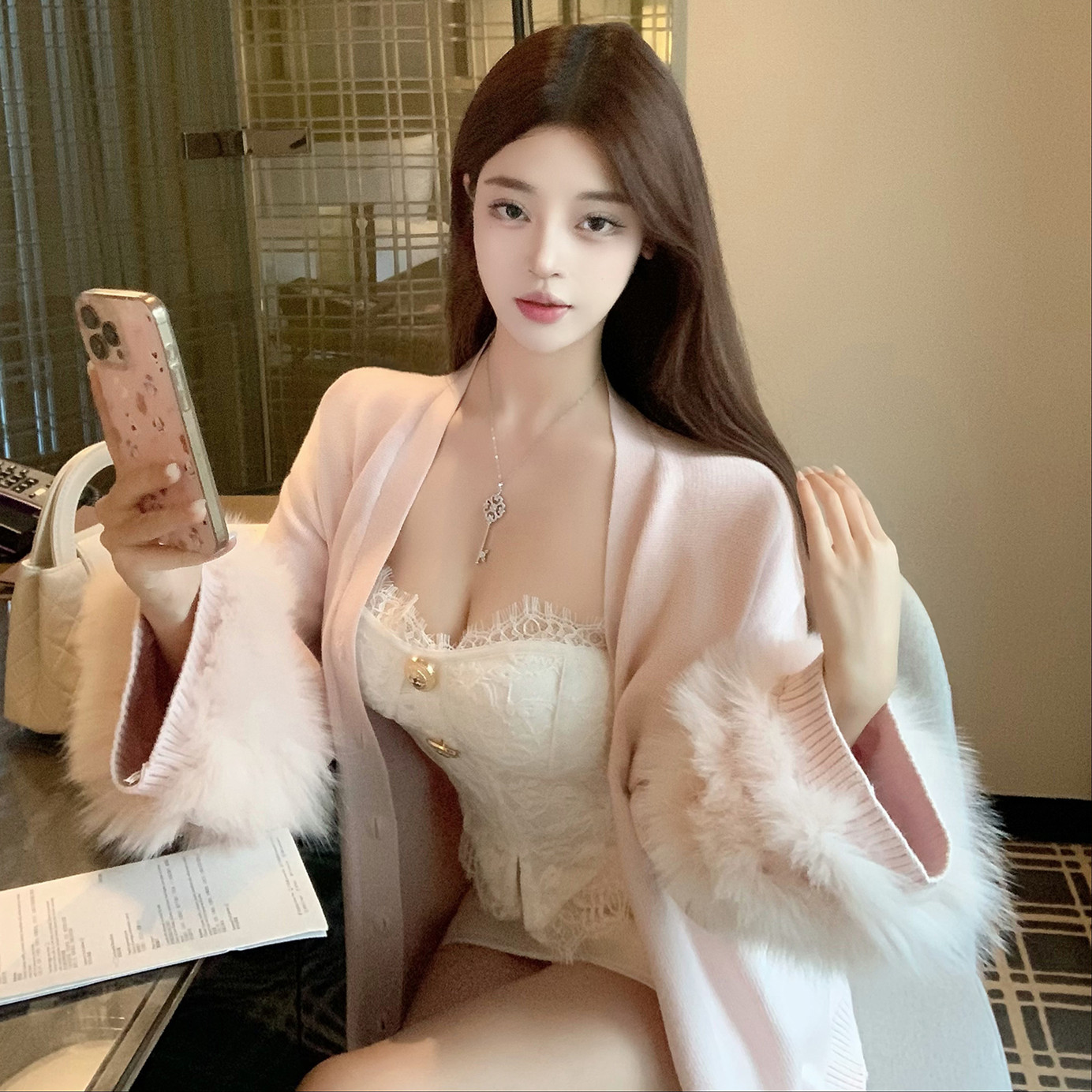 FA51470# 法式轻奢狐狸毛V领中长款针织开衫女秋冬显瘦气质白色毛衣外套 服裝批發女裝批發服飾貨源