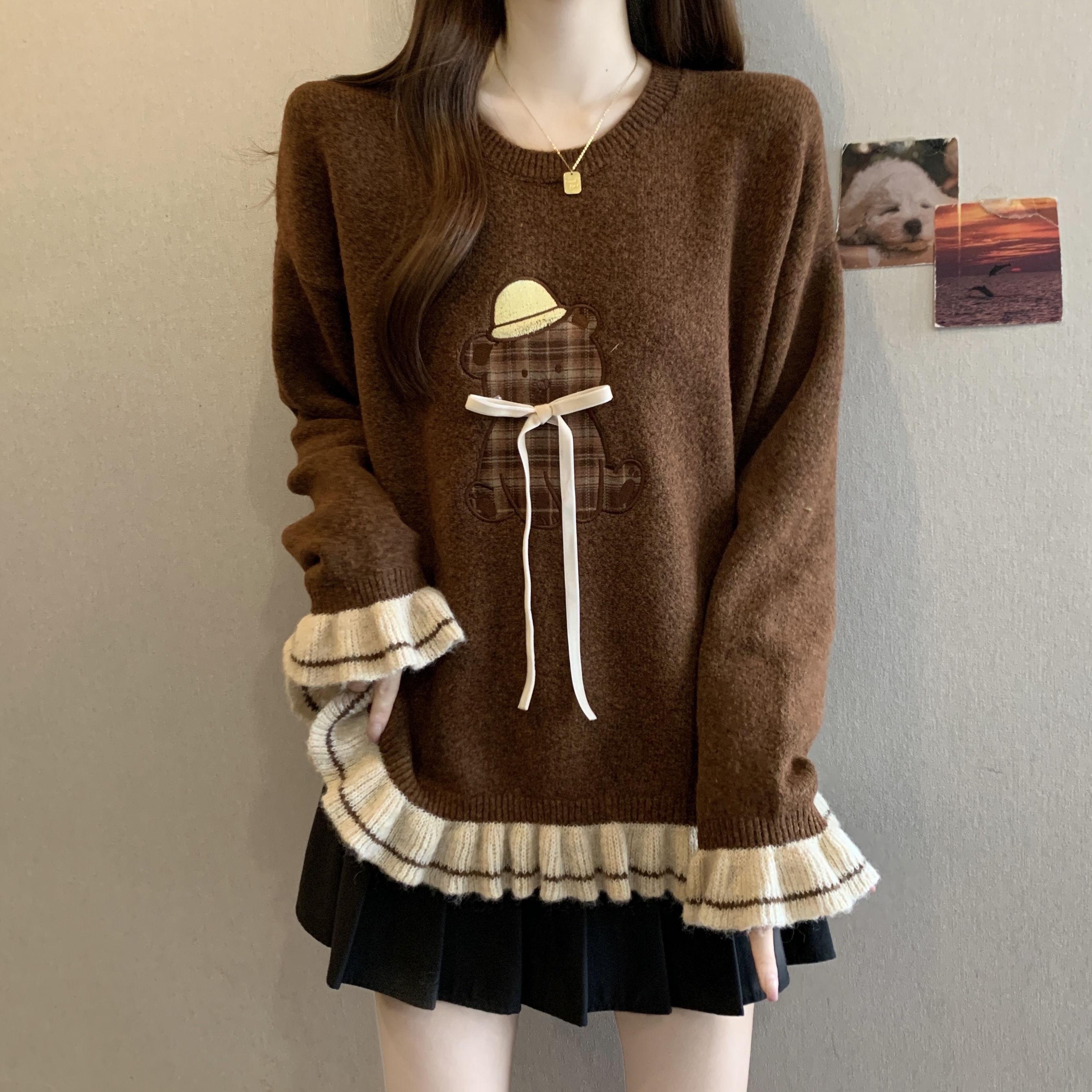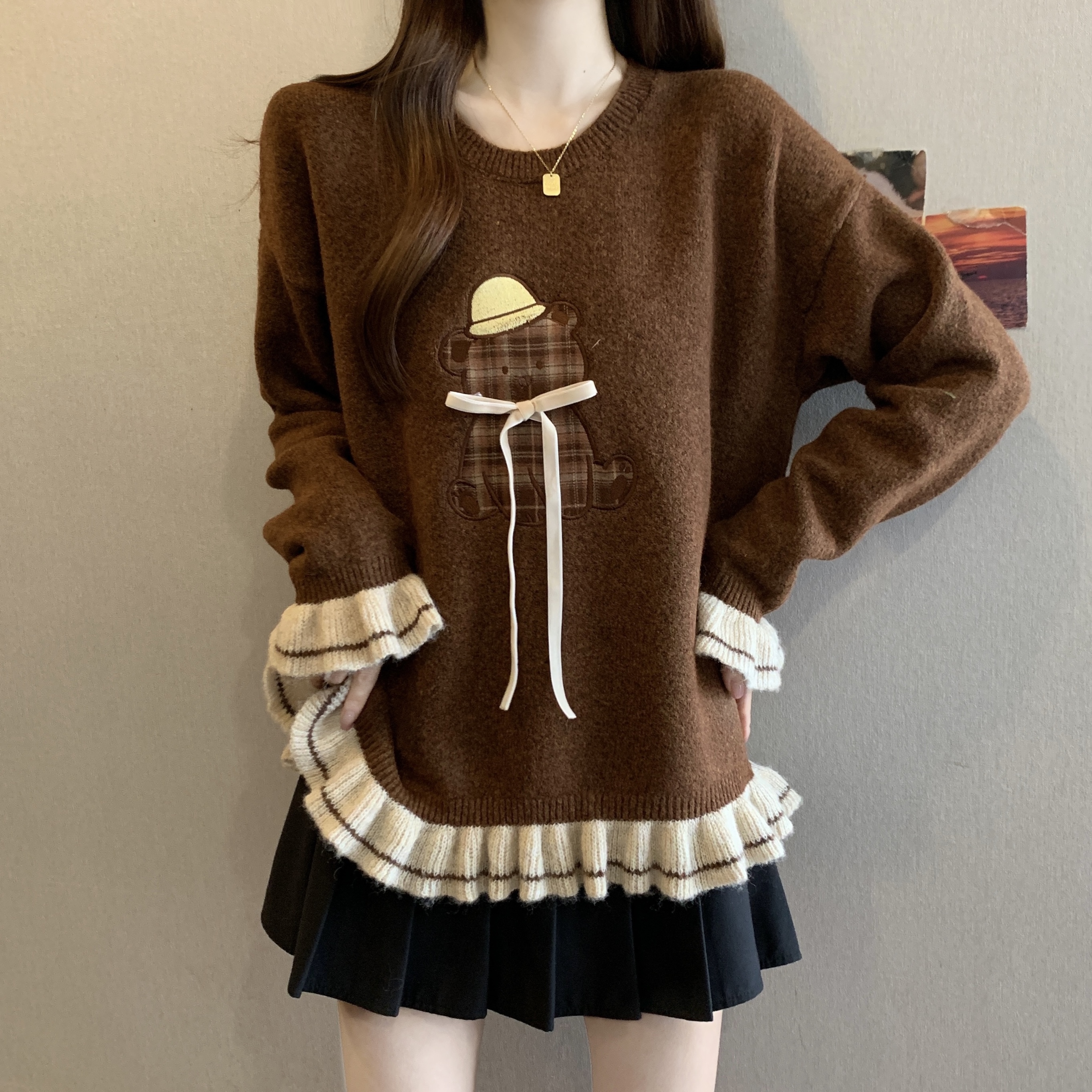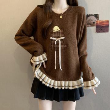 FA51621# 大码胖mm刺绣小熊图案毛衣棕色上衣秋冬新款显瘦遮肉针织衫 服裝批發女裝批發服飾貨源