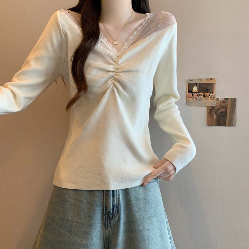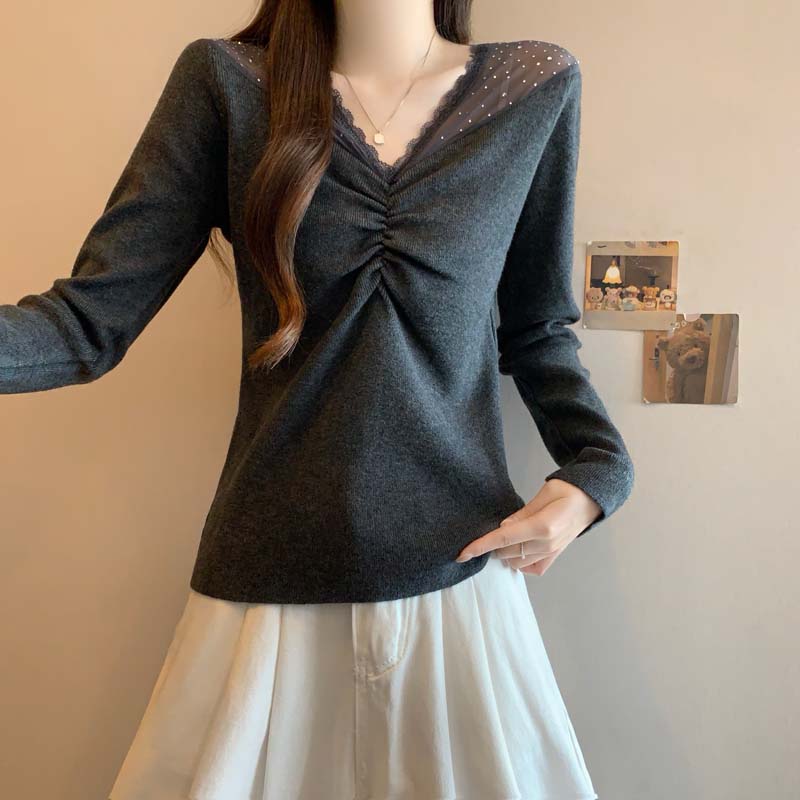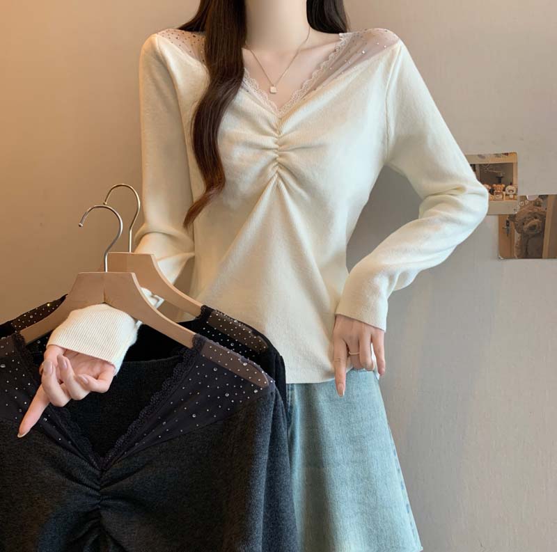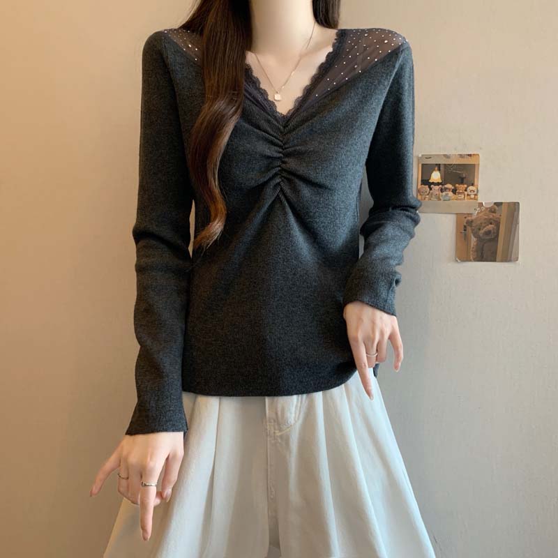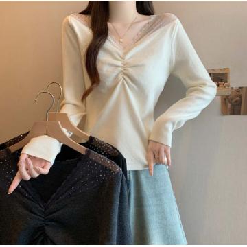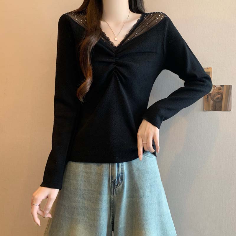 FA51638# 秋冬新款网纱拼接烫钻V领针织打底衫大码百搭减龄单上衣 服裝批發女裝批發服飾貨源