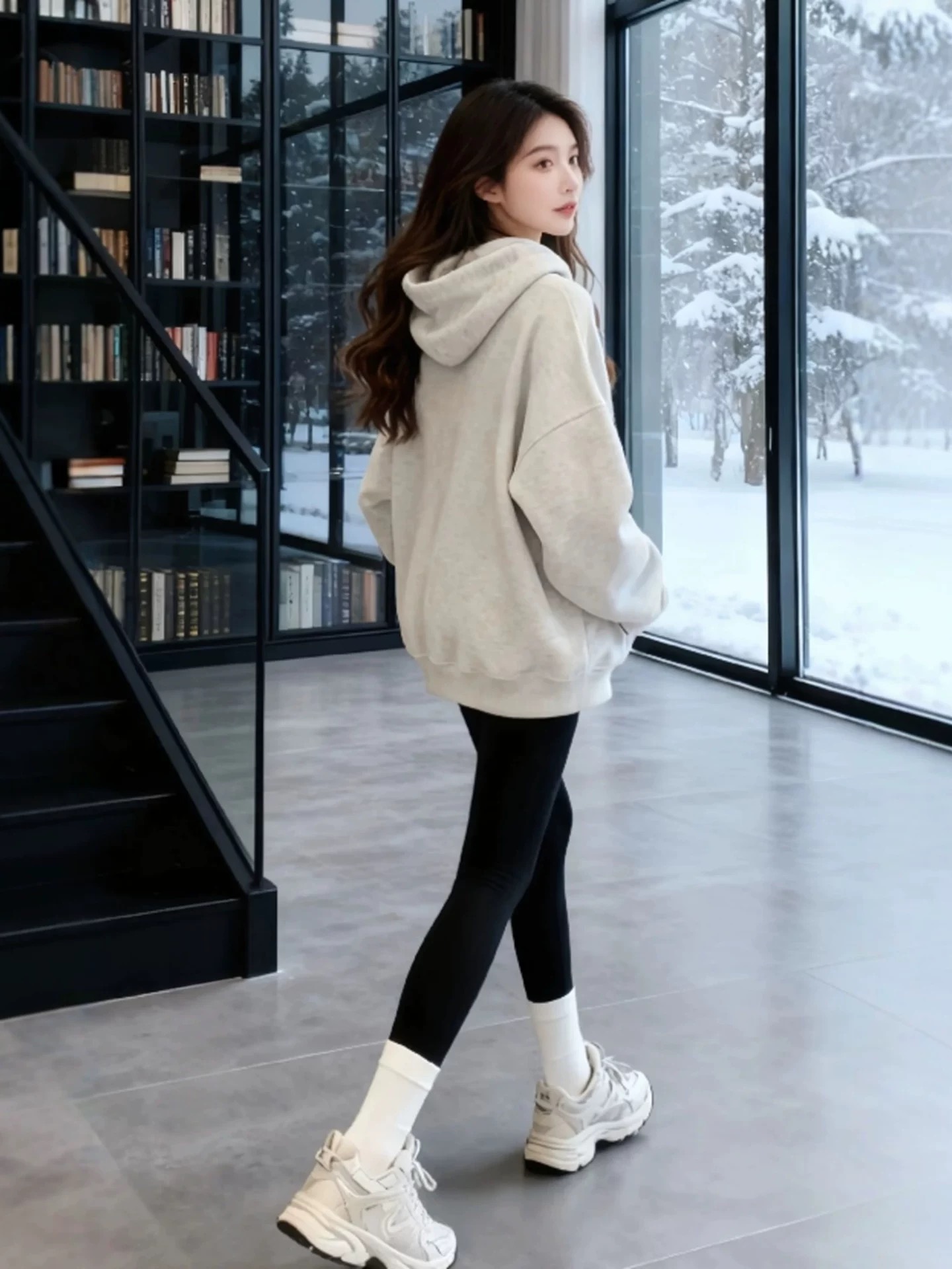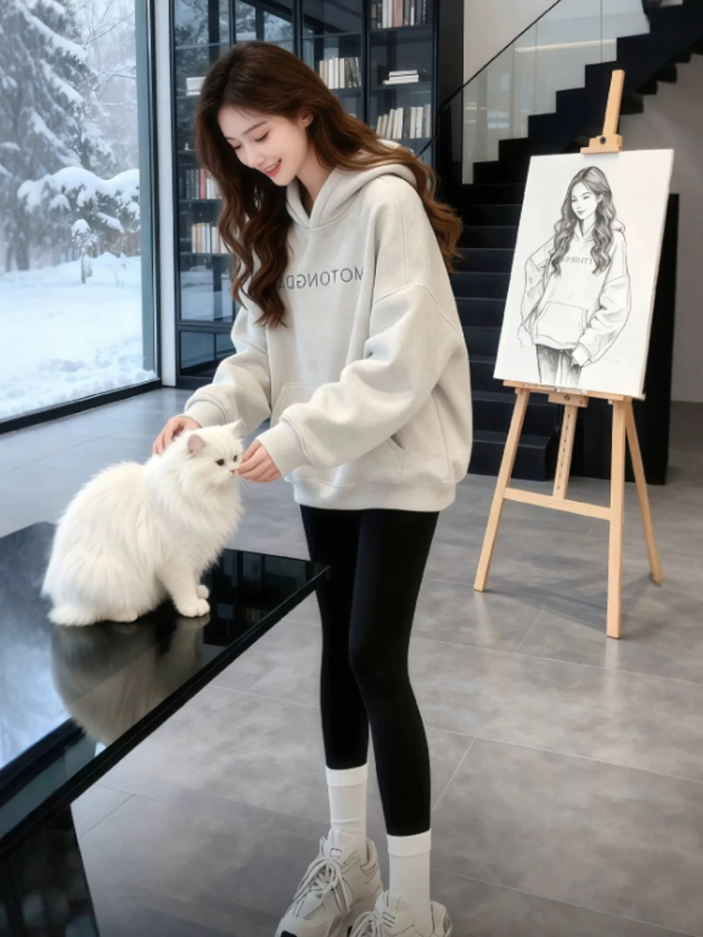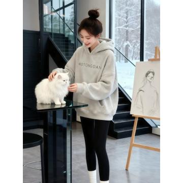 FA51644# 巨好看灰色字母印花连帽加绒卫衣秋装新款女款宽松慵懒风上衣 服裝批發女裝批發服飾貨源
