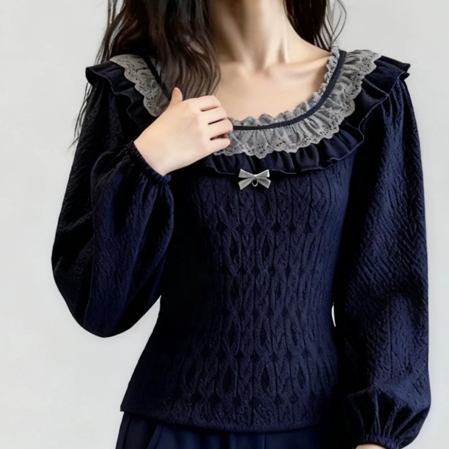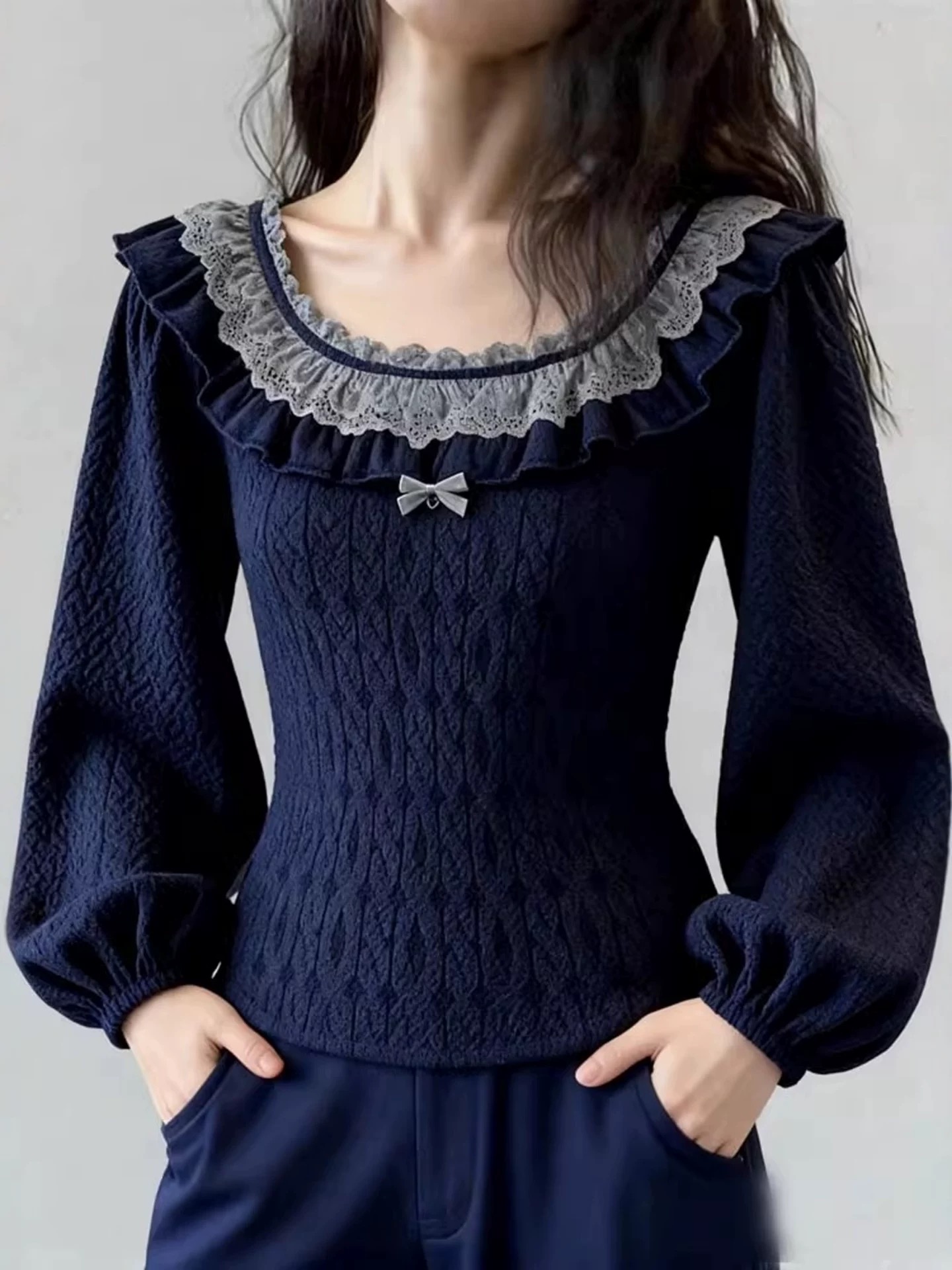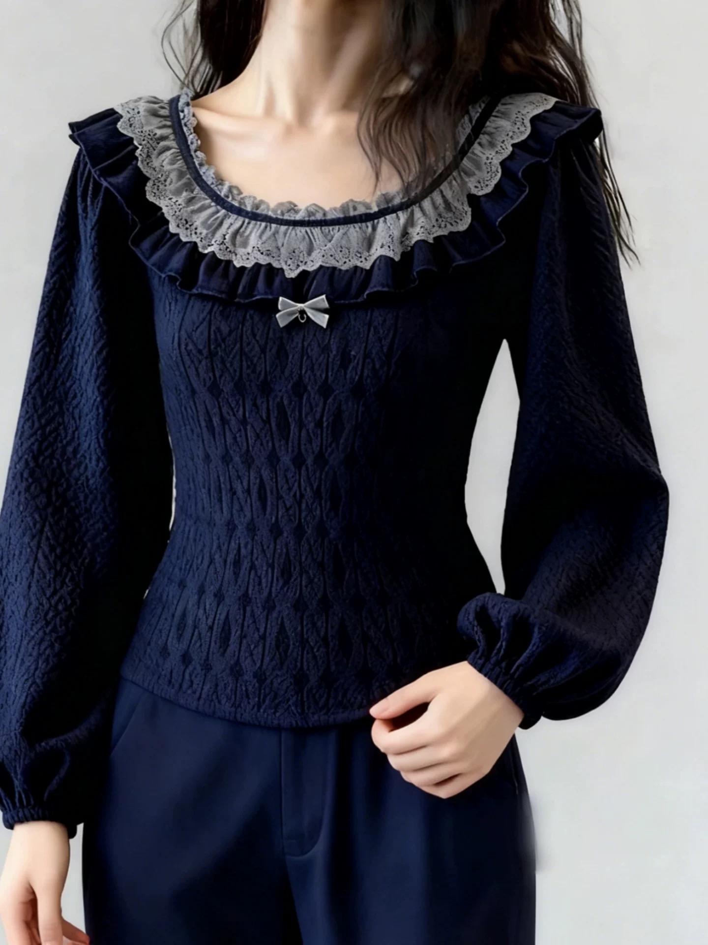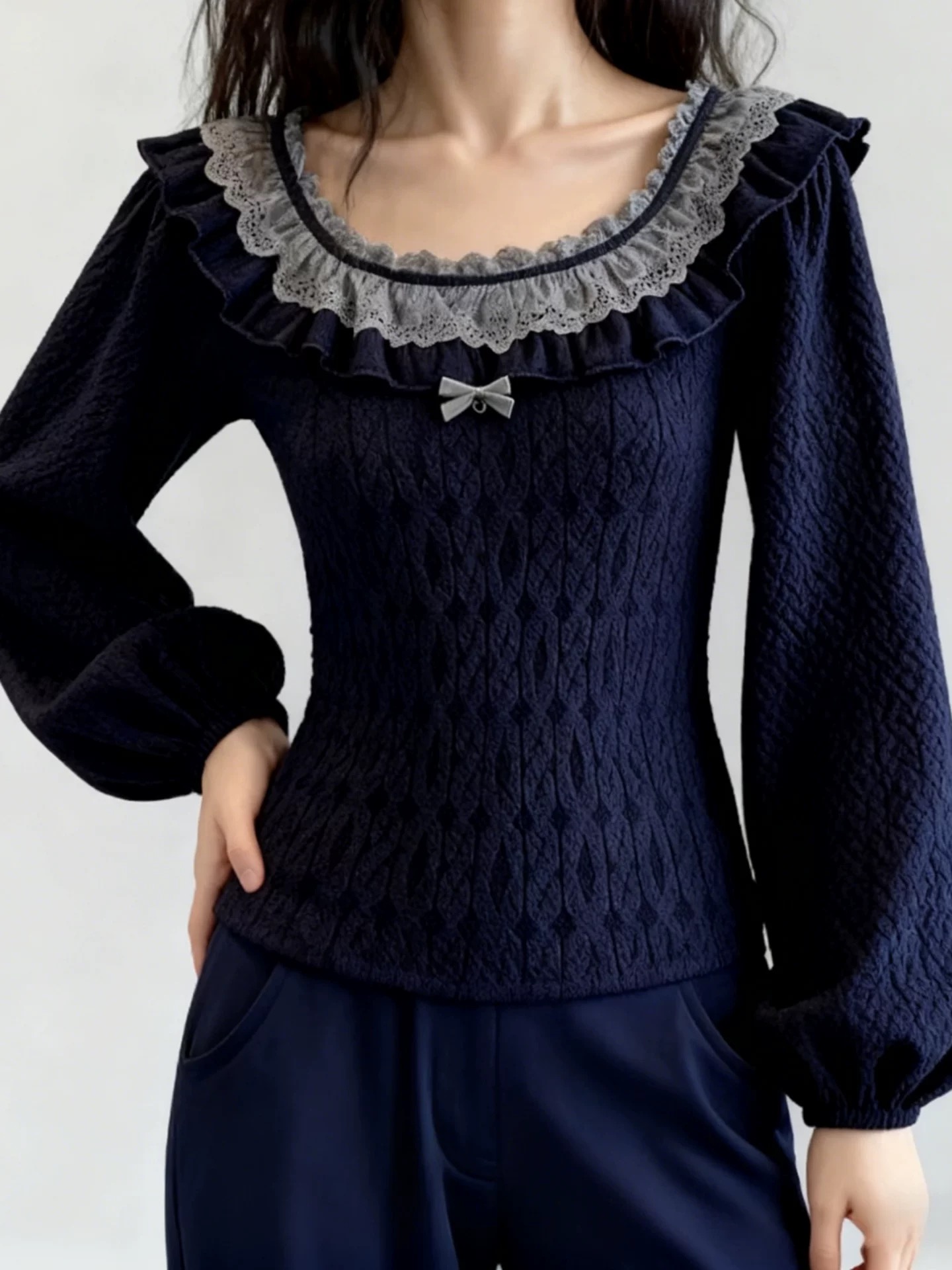FA51645# 藏青色花边设计感毛衣女新款冬可外穿内搭超好看针织厚款上衣 服裝批發女裝批發服飾貨源