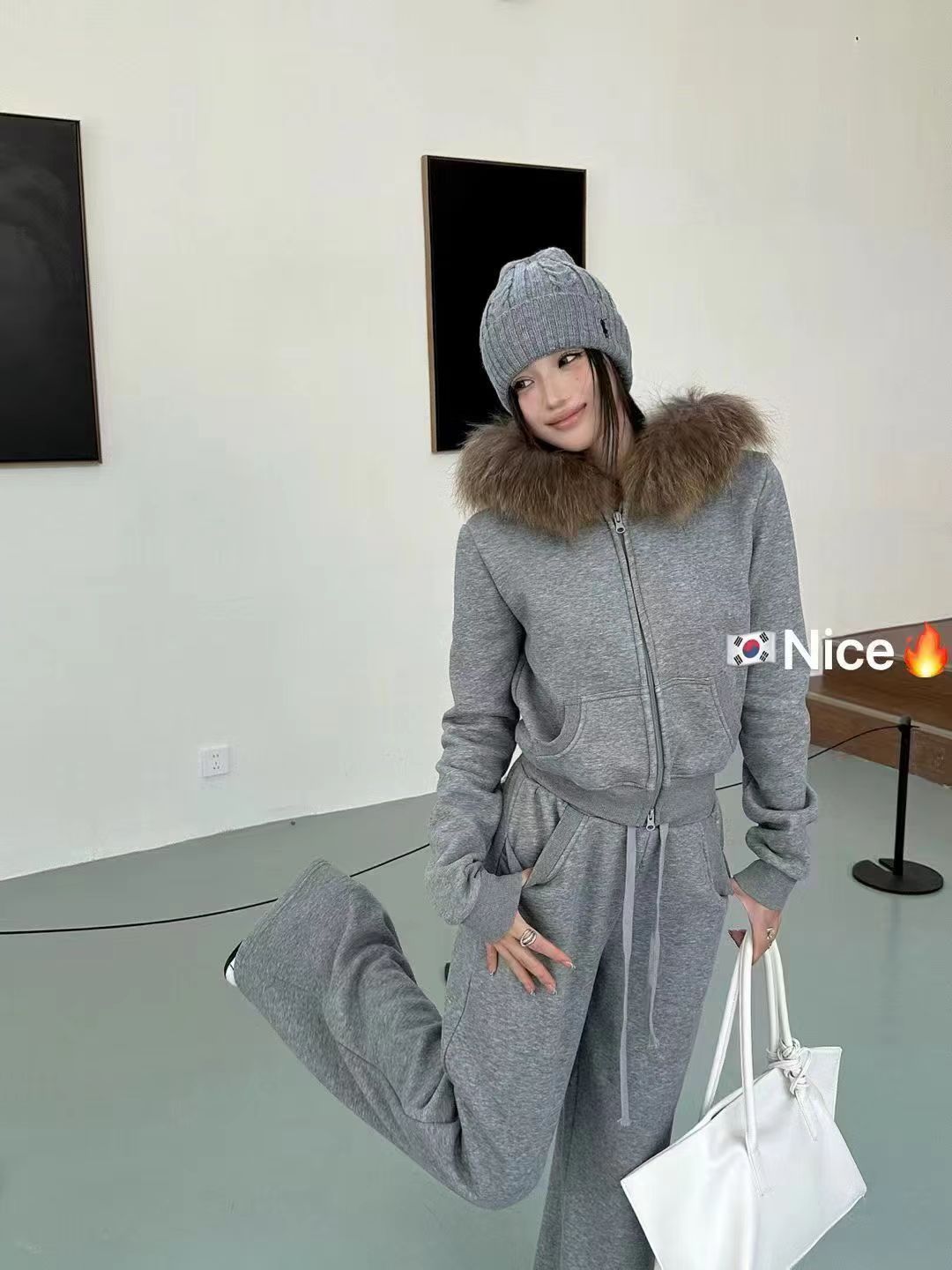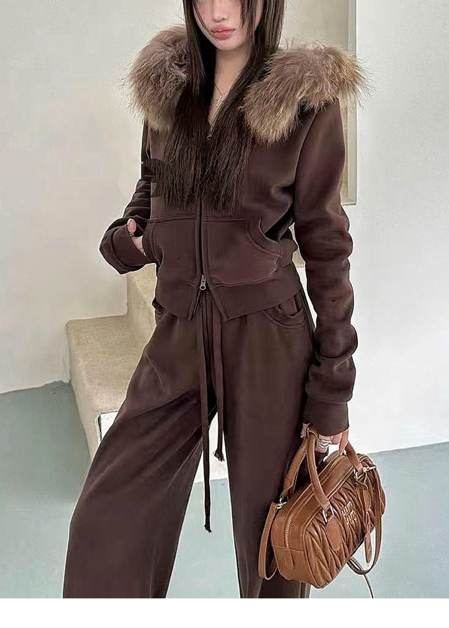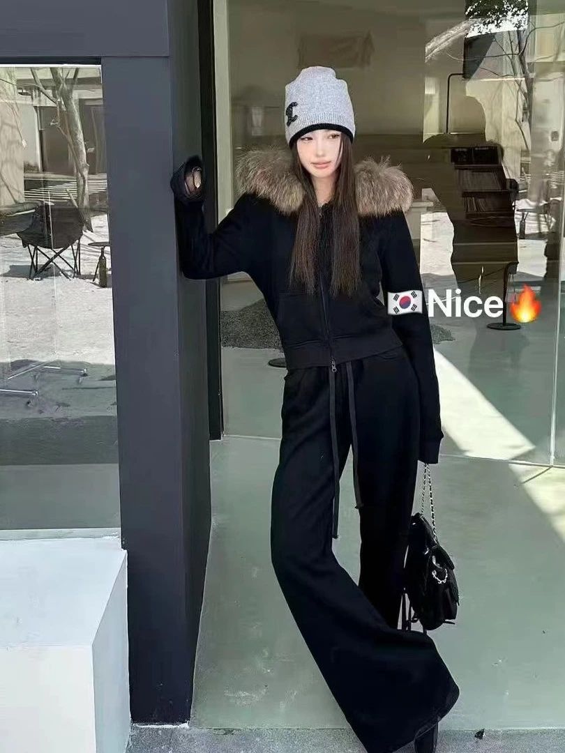 FA51661# 新款韩版时尚大毛领连帽加绒加厚卫衣+松紧腰加绒休闲裤套装 服裝批發女裝批發服飾貨源
