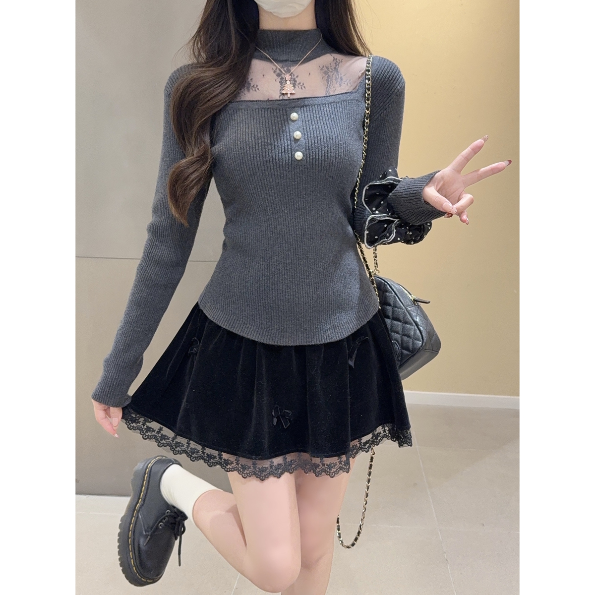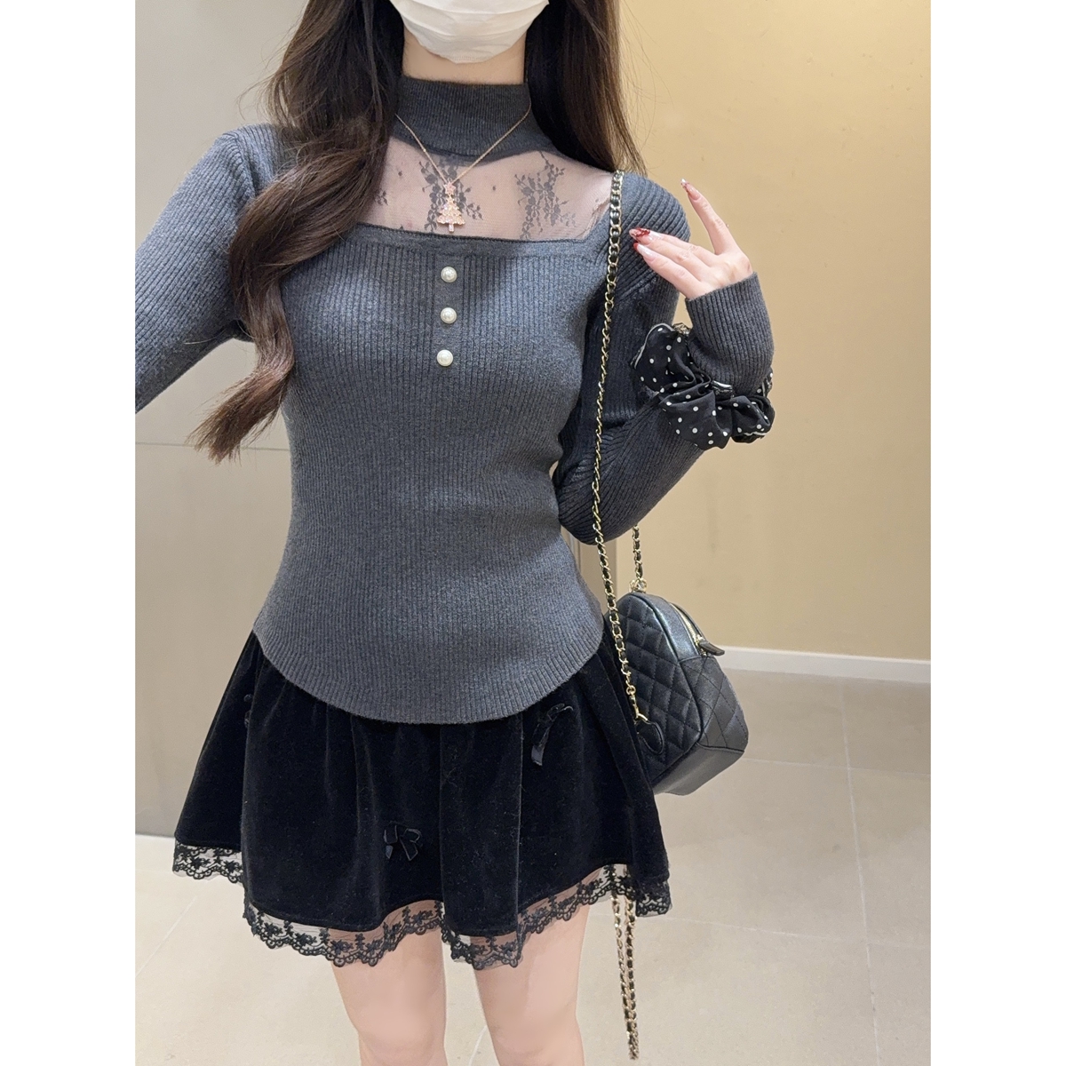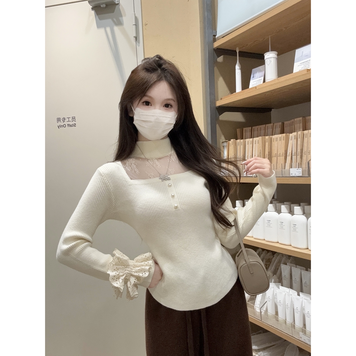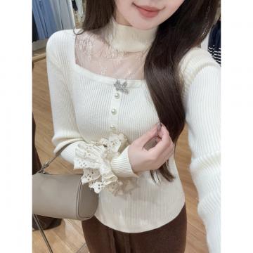 首页 > 毛衣、针织衫 > FA51678# 秋冬韩版纯欲方领蕾丝拼接镂空挂脖安迪绒针织衫上衣女 服裝批發女裝批發服飾貨源