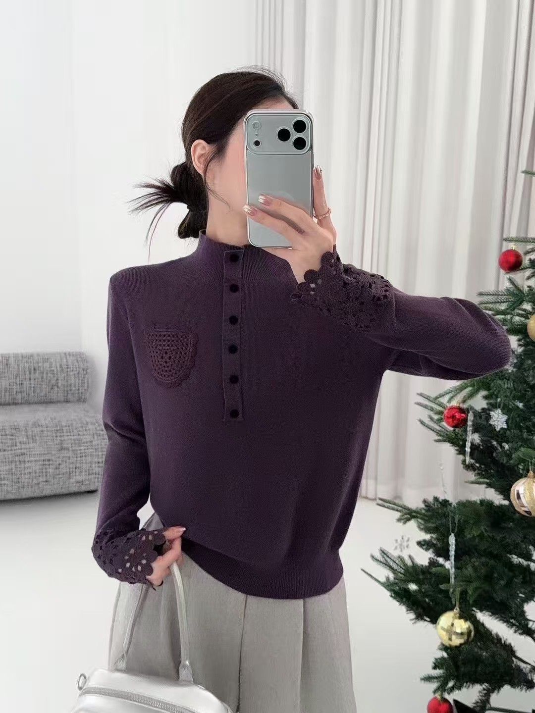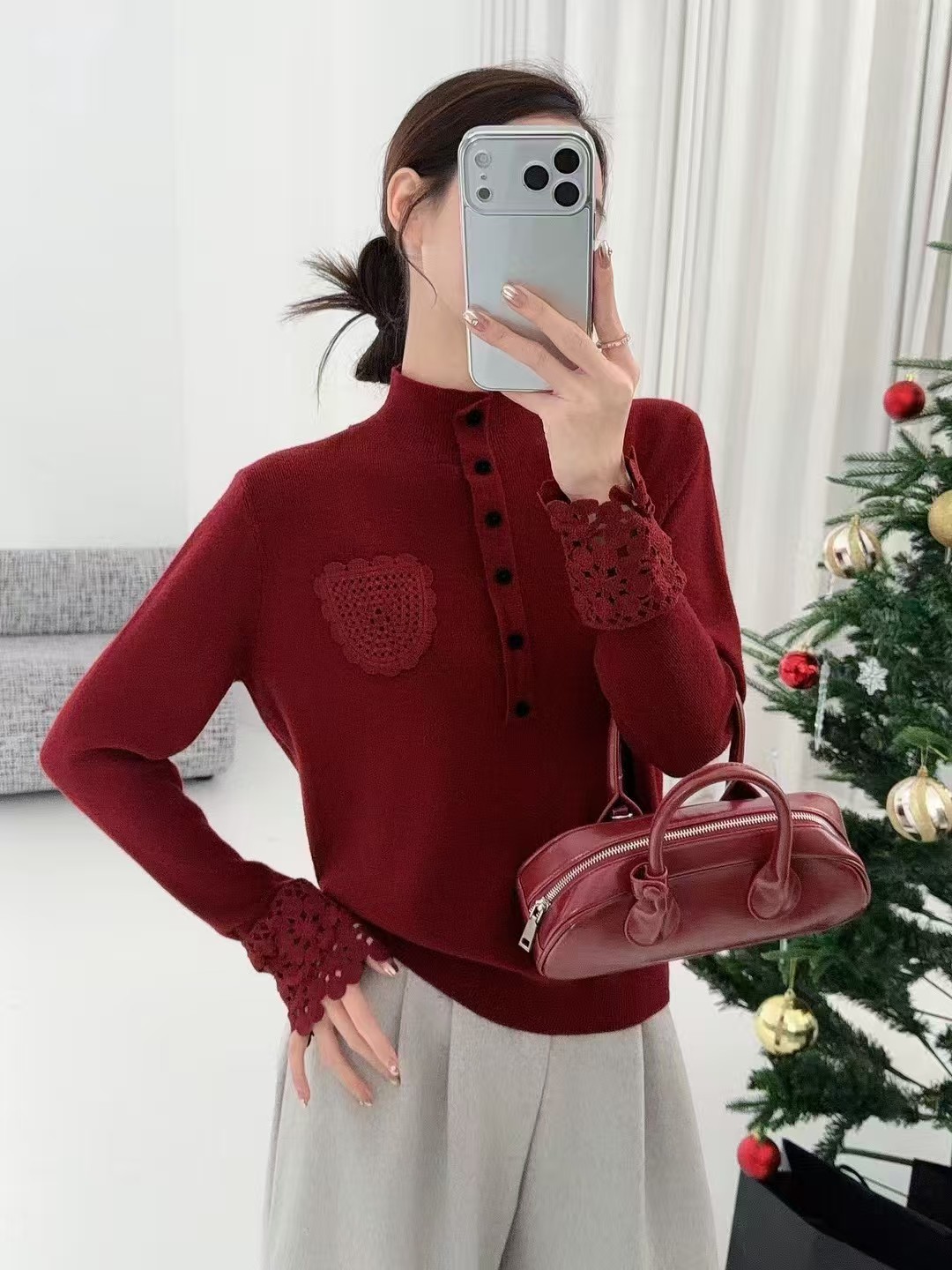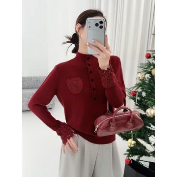 FA51683# 高级感勾花口袋灯笼袖羊毛针织衫气质显瘦纽扣半高领打底毛衣女冬 服裝批發女裝批發服飾貨源