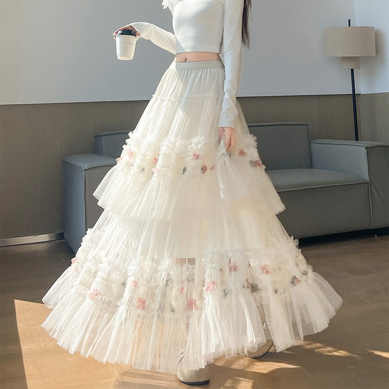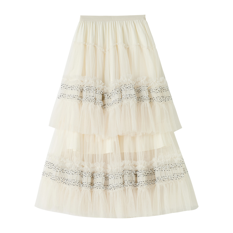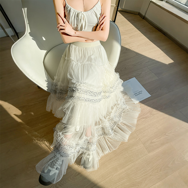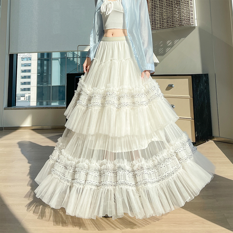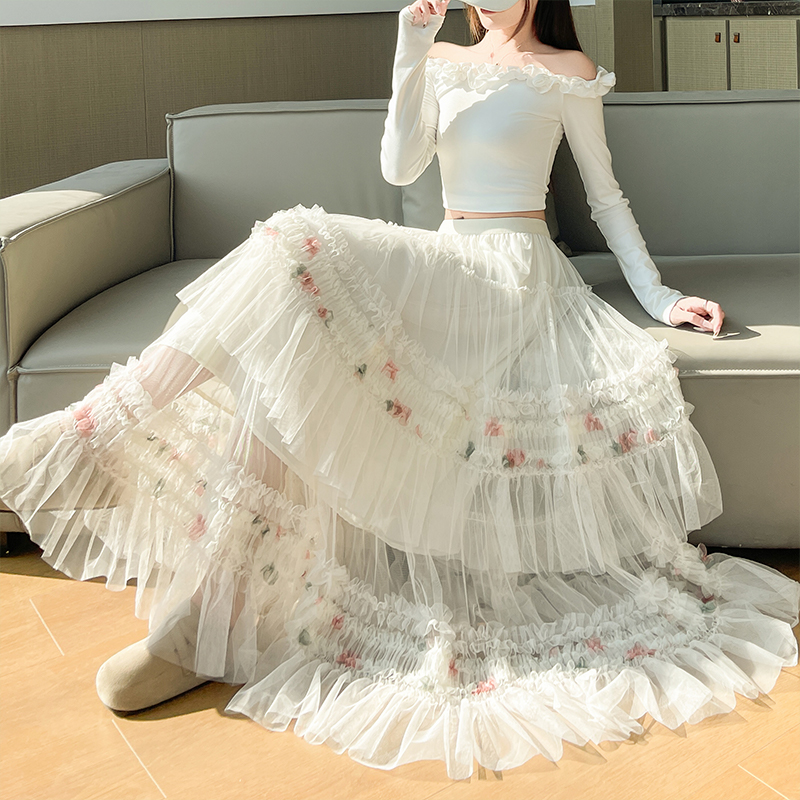 FA55909# 木耳边网纱百褶蛋糕裙半身裙女春季高腰显瘦a字大摆长裙 服裝批發女裝批發服飾貨源