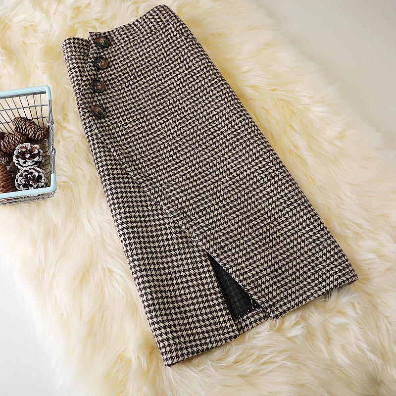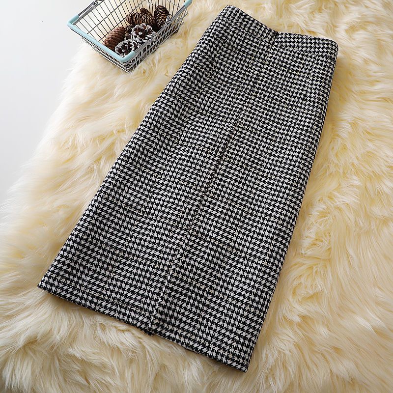 FA56017# 设计感千鸟格中长裙半身裙女秋冬装毛呢不规则高腰百搭a字包臀裙 服裝批發女裝批發服飾貨源