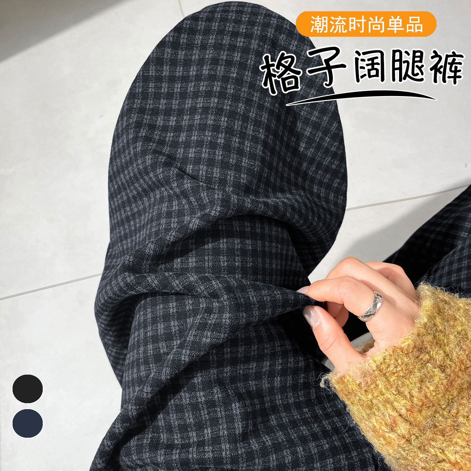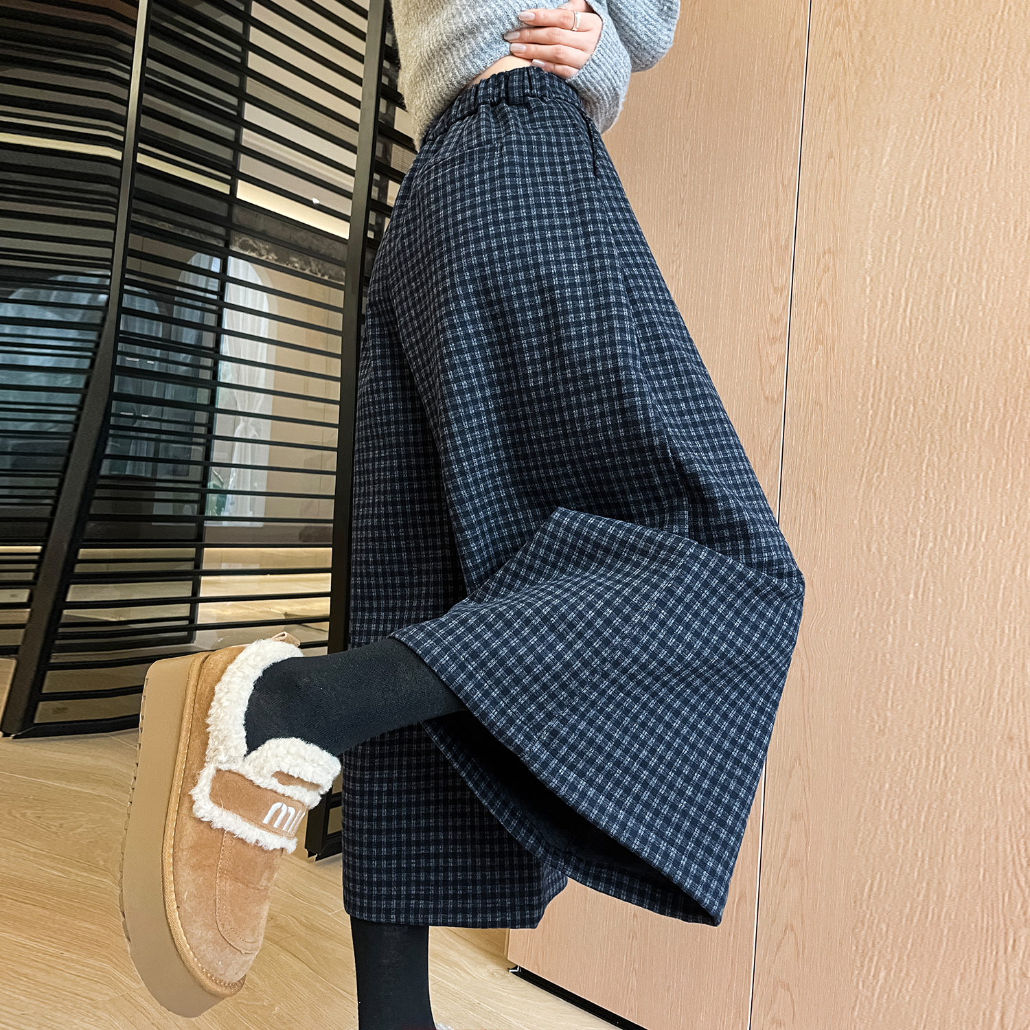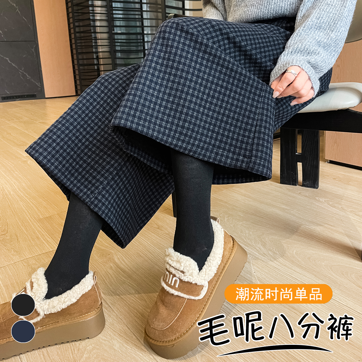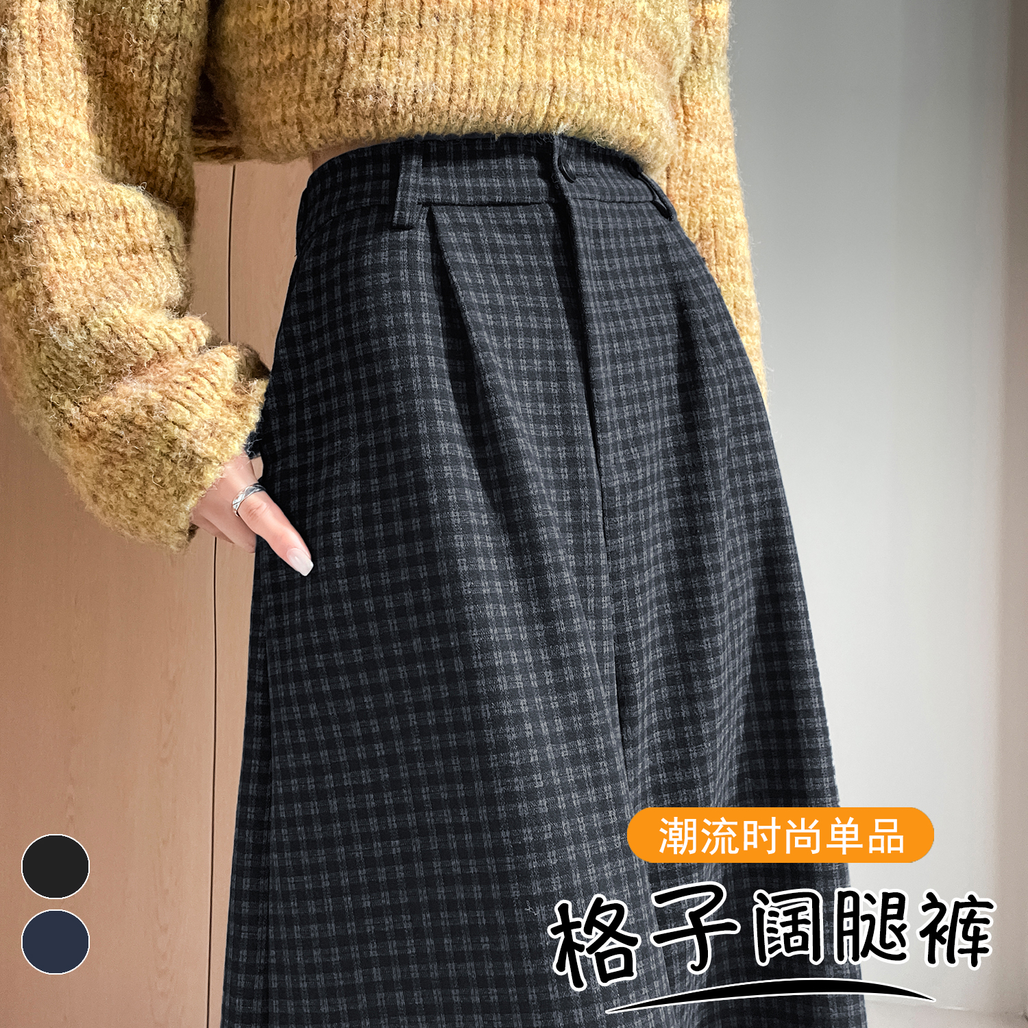 FA43849# 加厚格子毛呢八分阔腿裤秋冬新款宽松百搭显瘦休闲裤 服裝批發女裝批發服飾貨源