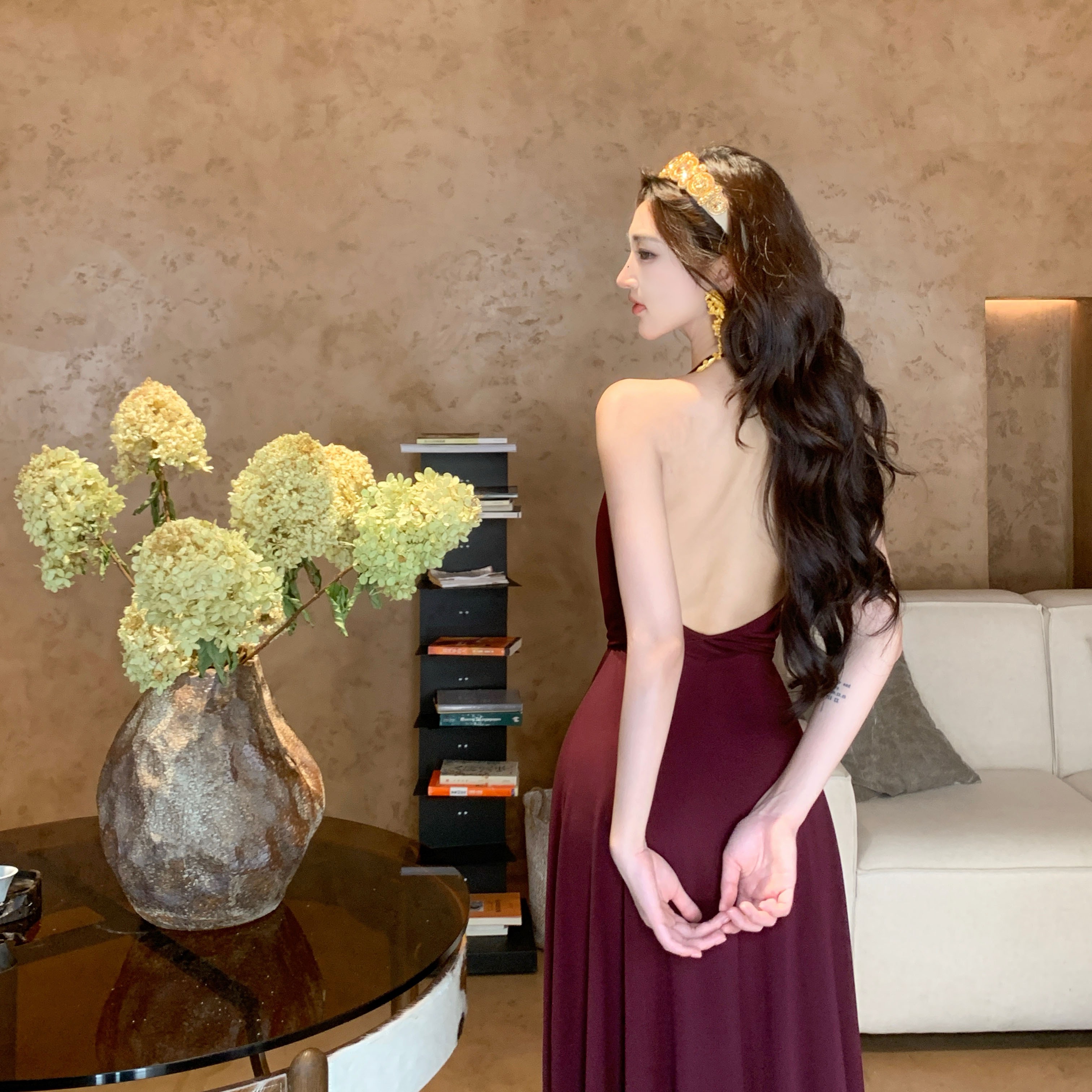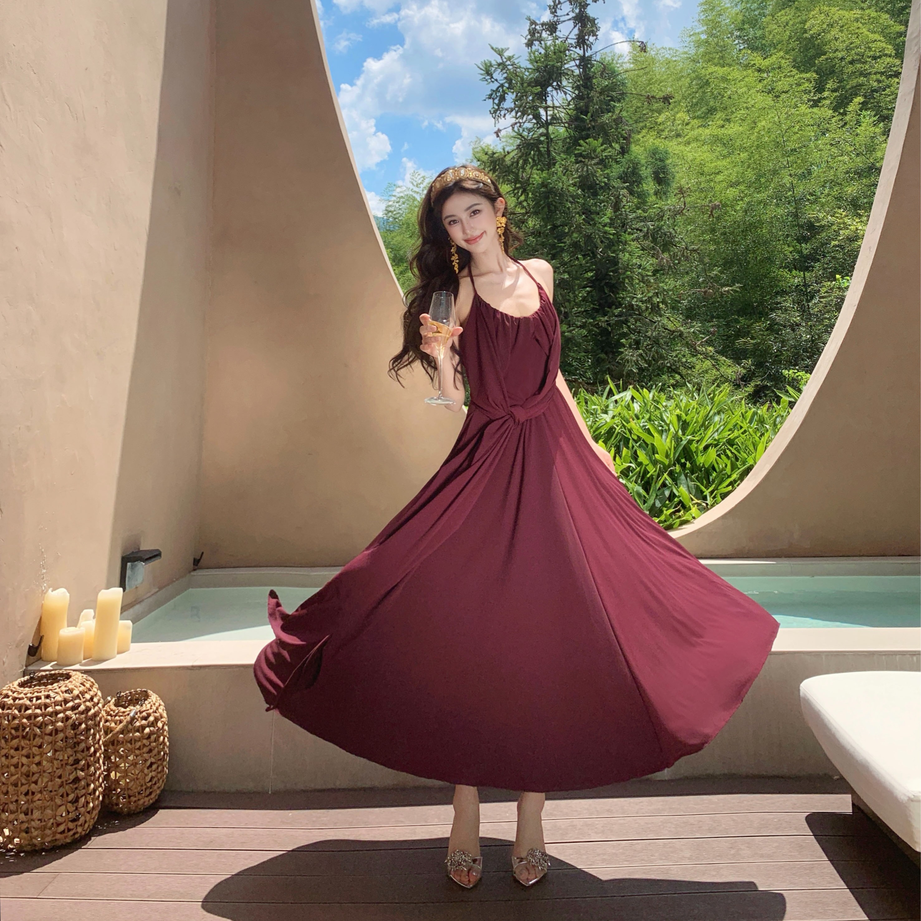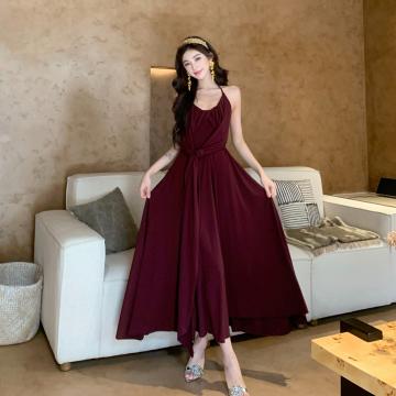 FA43852# 法式慵懒感U领设计连衣裙气质高级感收腰露背挂脖吊带裙 服裝批發女裝批發服飾貨源