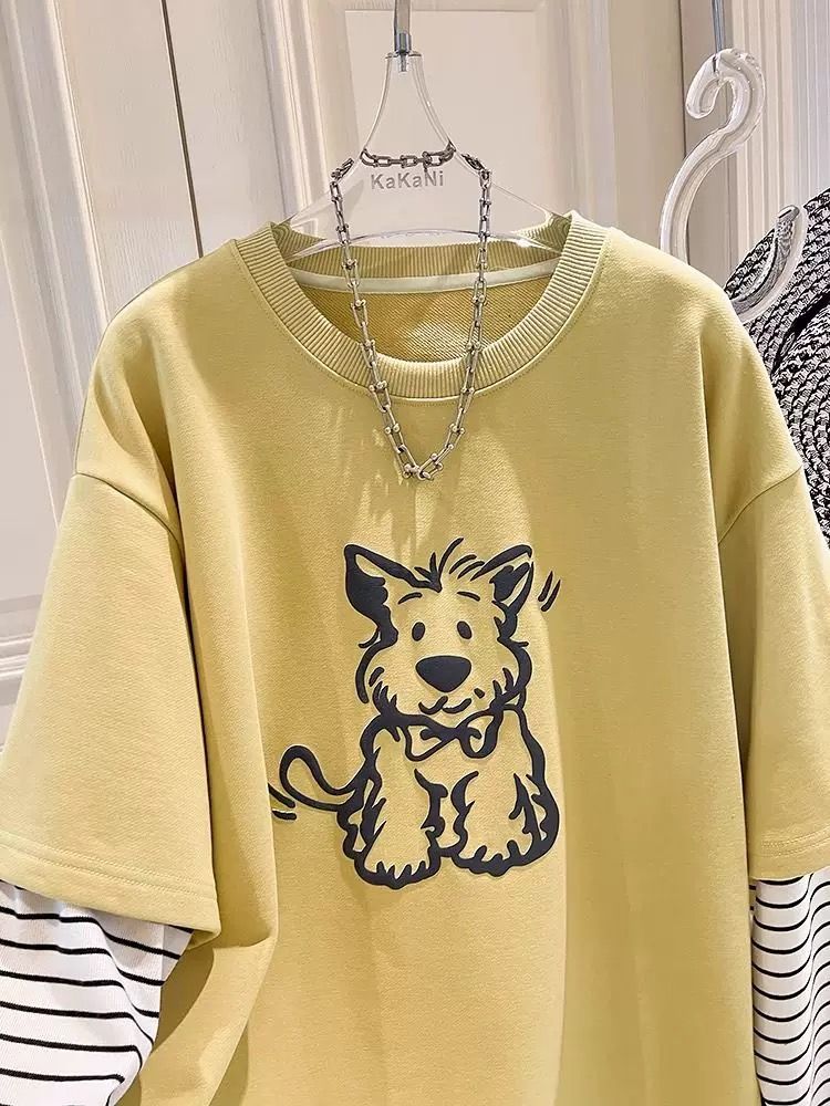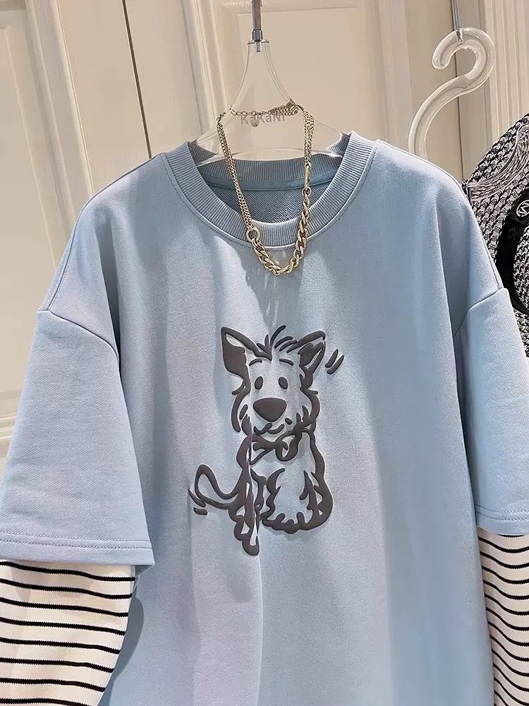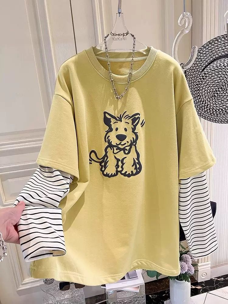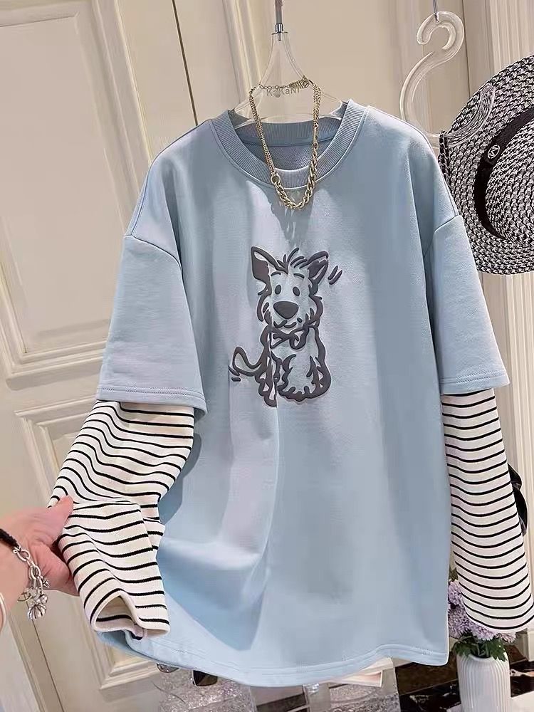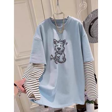 FA44067# 特大码300斤条纹长袖假两件女宽松T恤上衣 服裝批發女裝批發服飾貨源