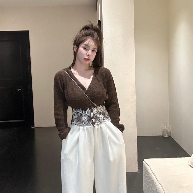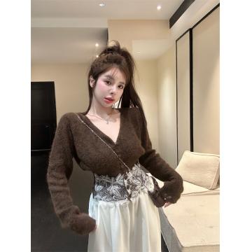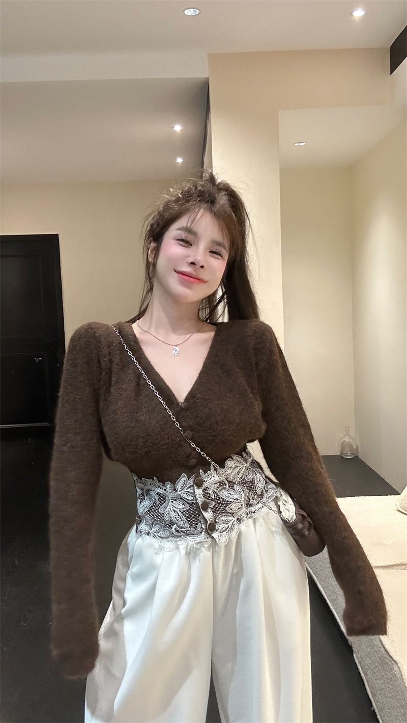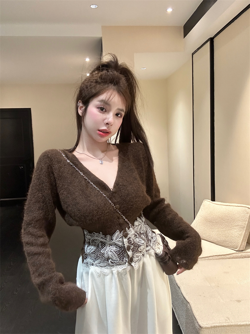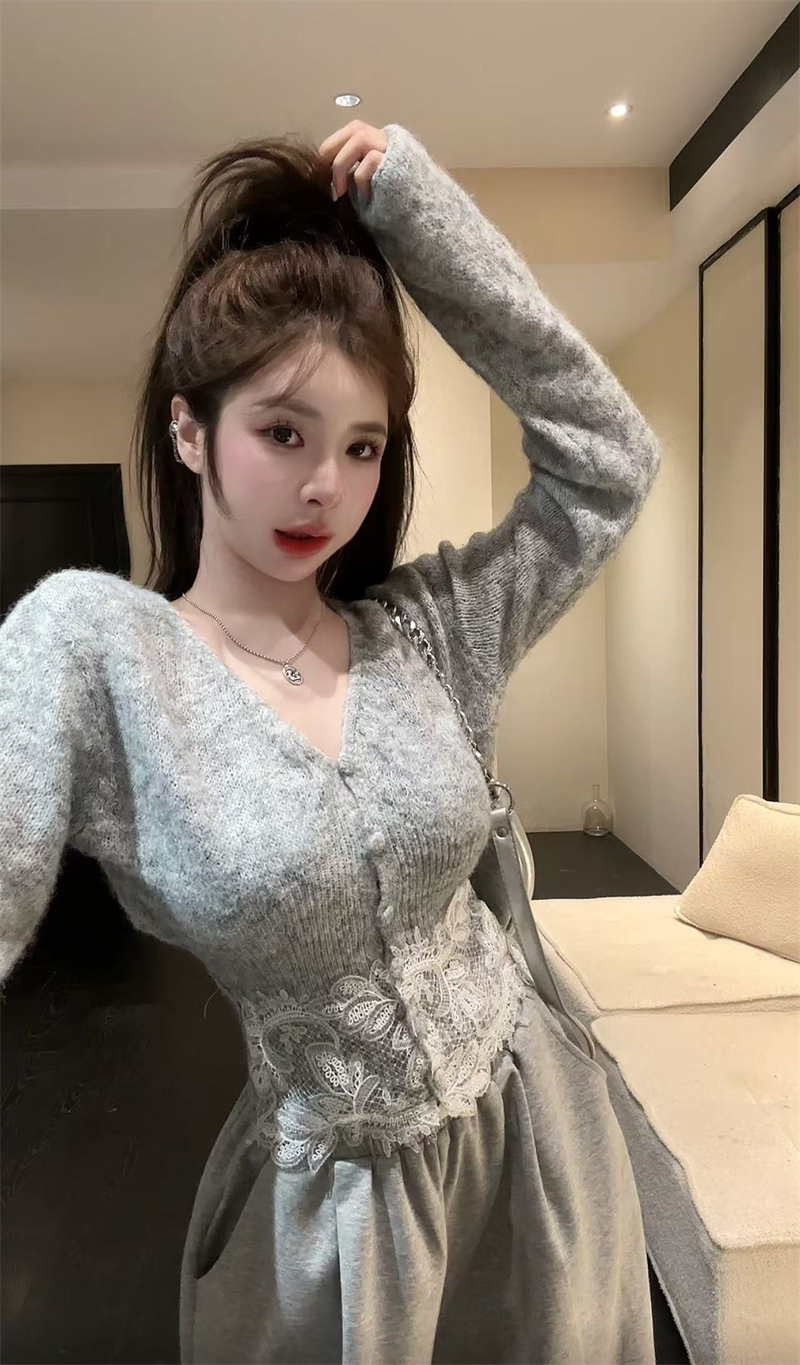 Home > 毛衣、针织衫 > FA44084# 秋冬新款纯欲收腰V领蕾丝拼接长袖修身毛针织衫上衣 服裝批發女裝批發服飾貨源