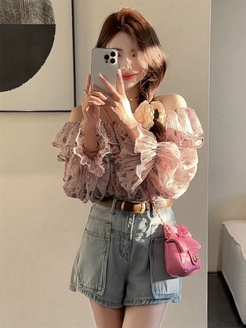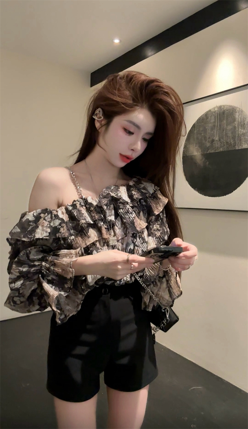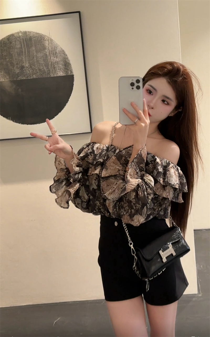 FA44085# 秋季新款甜美一字肩碎花衫女宽松喇叭袖长袖上衣 服裝批發女裝批發服飾貨源
