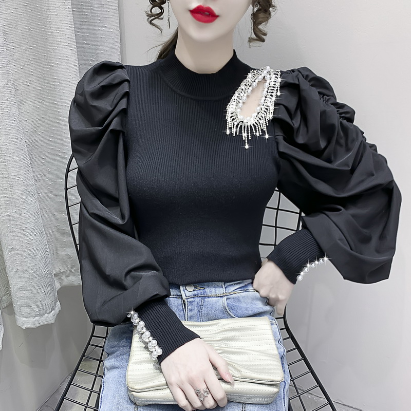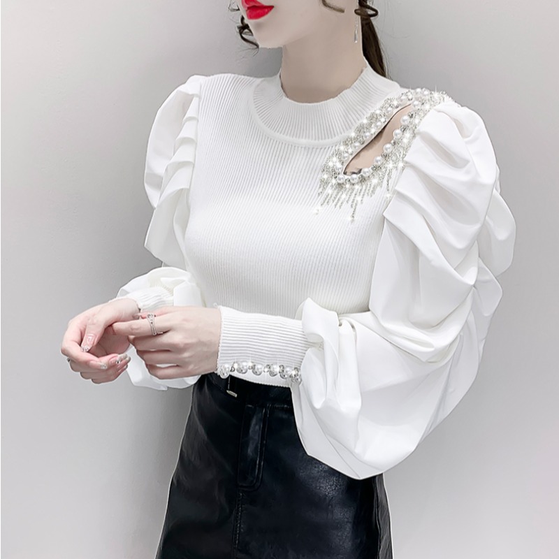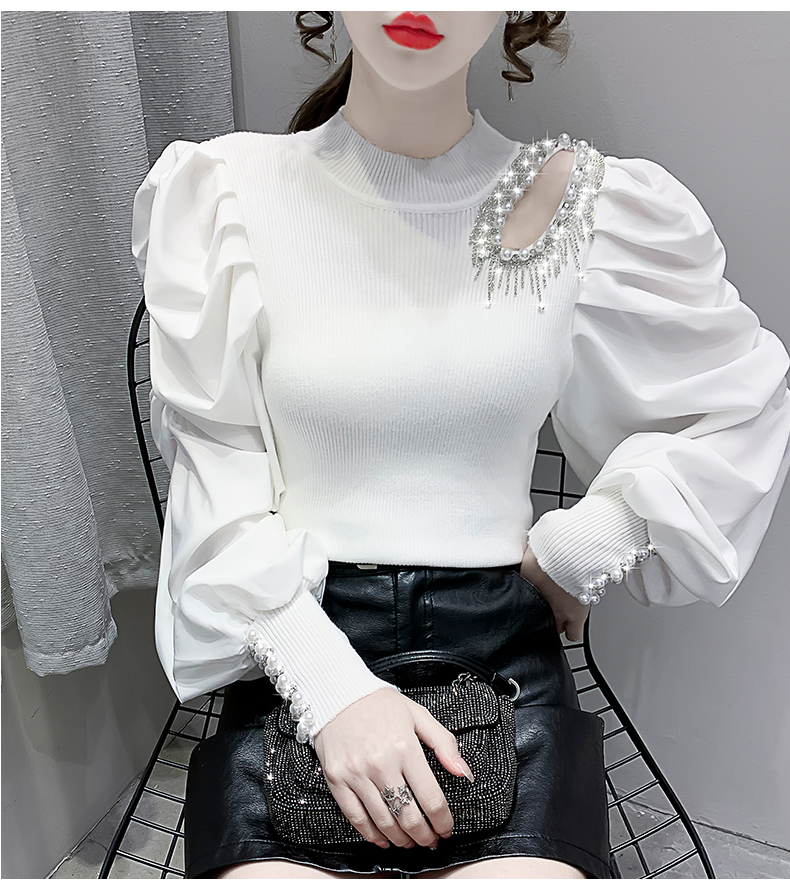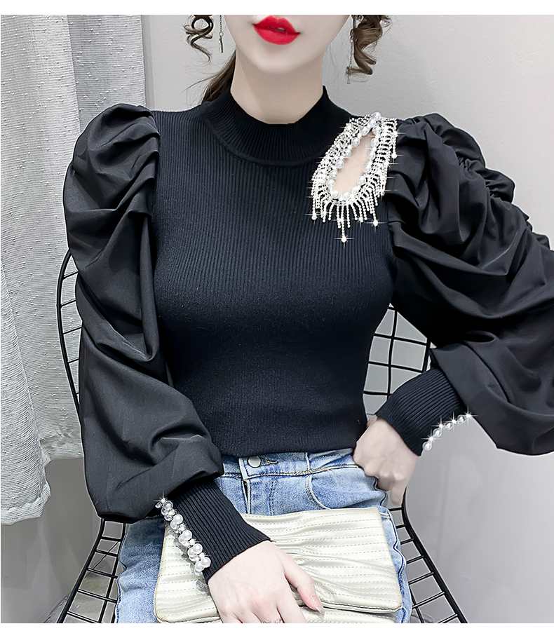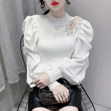Home > 毛衣、针织衫 > FA44099# 气质秋冬新款灯笼袖上衣重工钉珠小心机镂空拼接针织女 服裝批發女裝批發服飾貨源