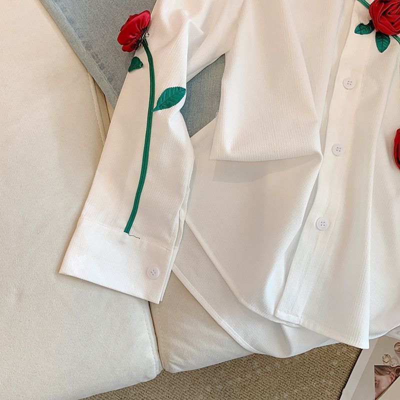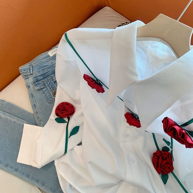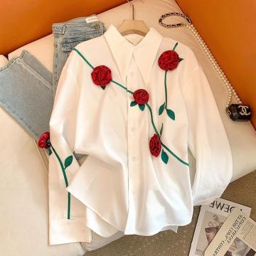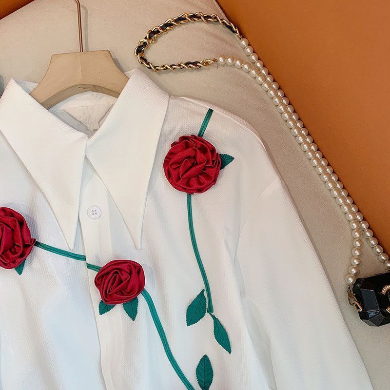 FA44352# 高级感小众立体玫瑰白色衬衫女装秋季韩系时髦薄款宽松别致上衣潮 服裝批發女裝批發服飾貨源