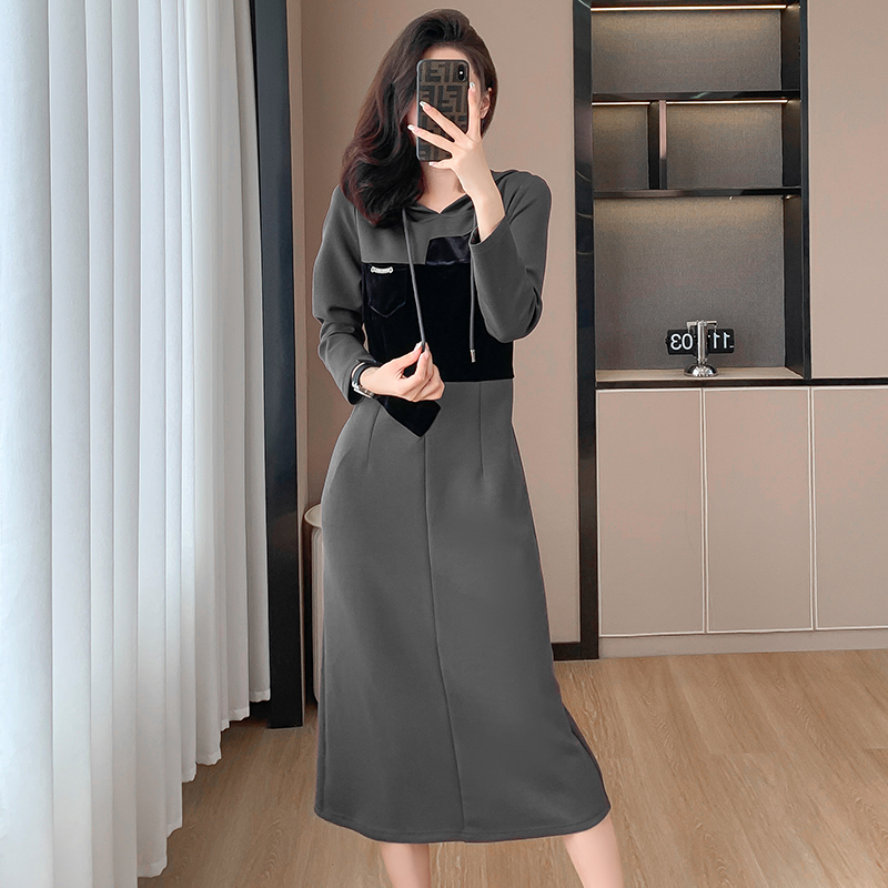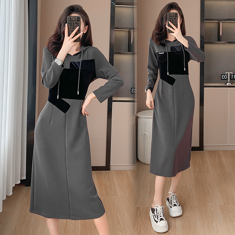 FA44702# 高级感小众连衣裙女秋冬欧货时尚百搭丝绒拼接显瘦连帽长款卫衣裙 服裝批發女裝批發服飾貨源