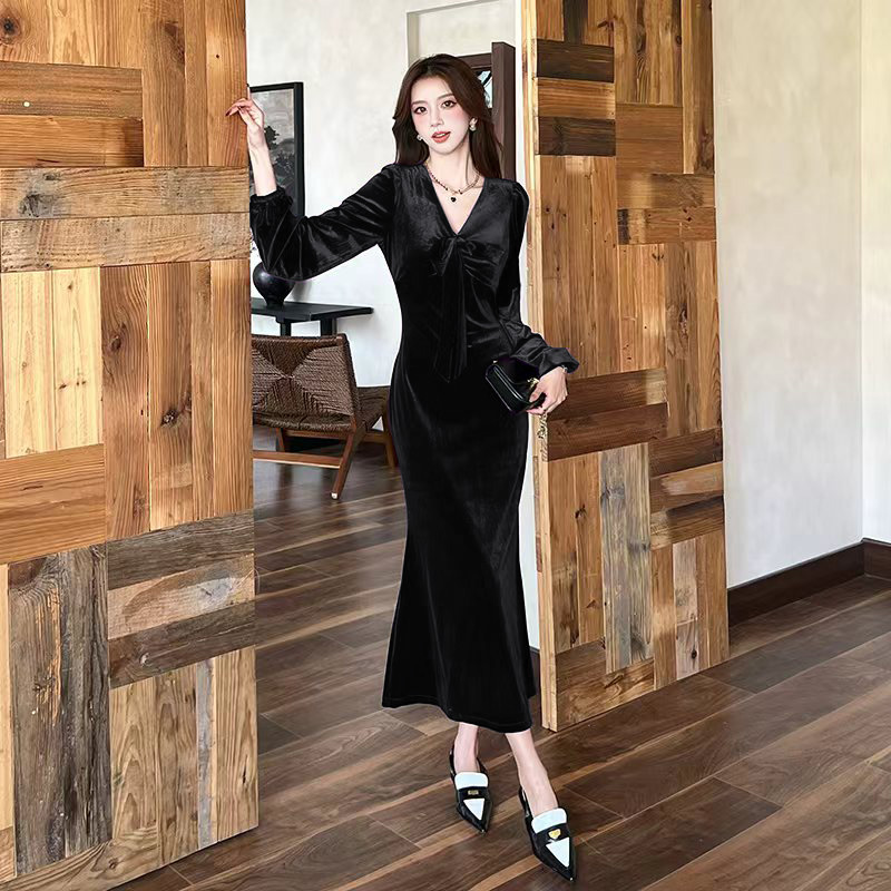 FA44703# 视频网红秋季时尚气质长裙显瘦金丝绒连衣裙 服裝批發女裝批發服飾貨源