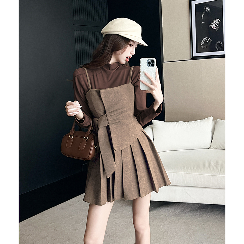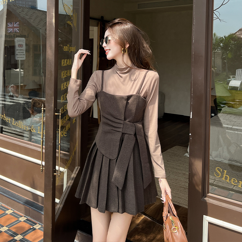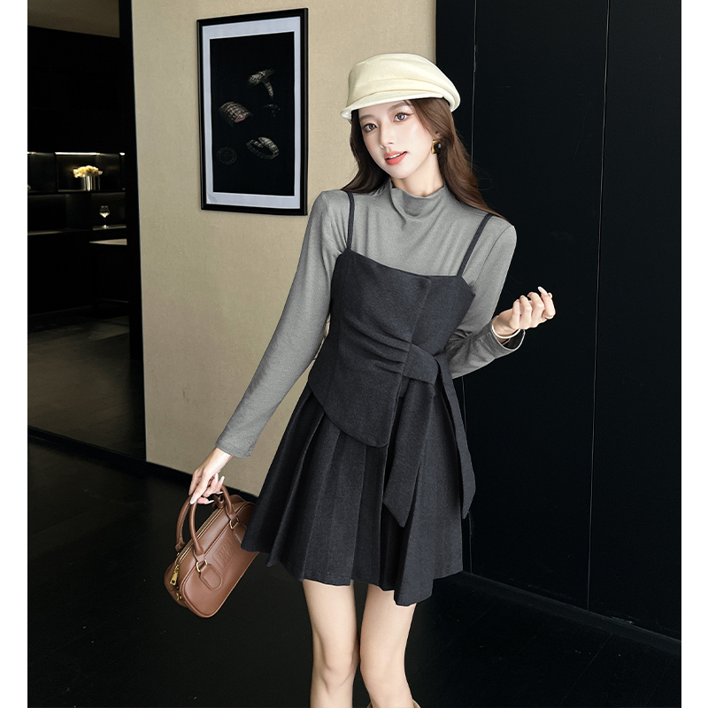 FA45437# 轻熟风优雅气质叠穿两件套女半高领打底T恤吊带百褶短裙 服裝批發女裝批發服飾貨源