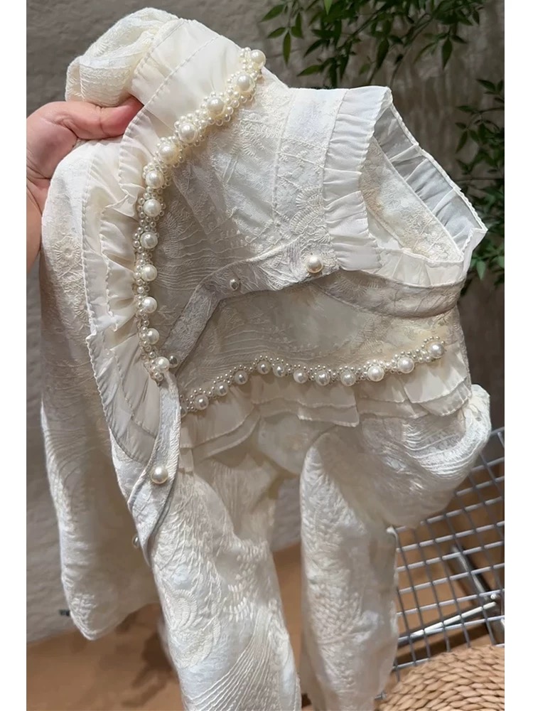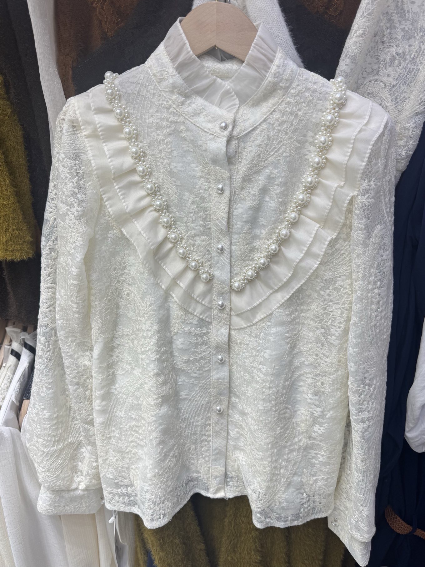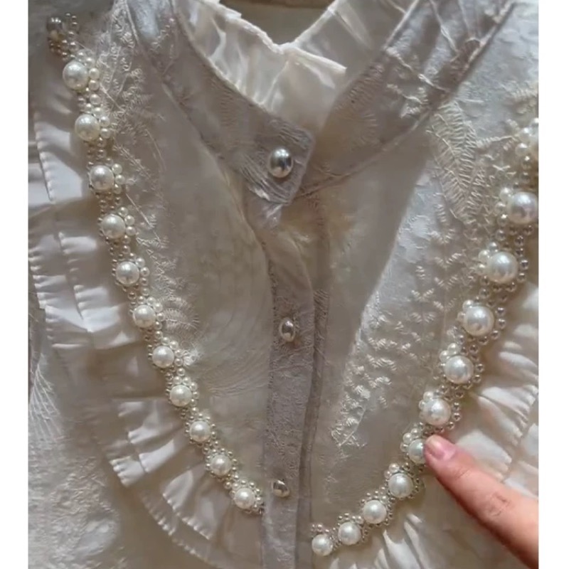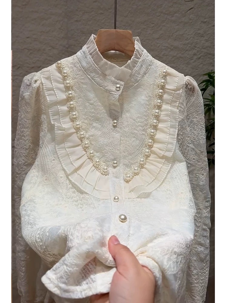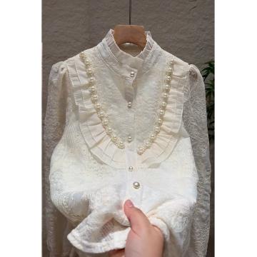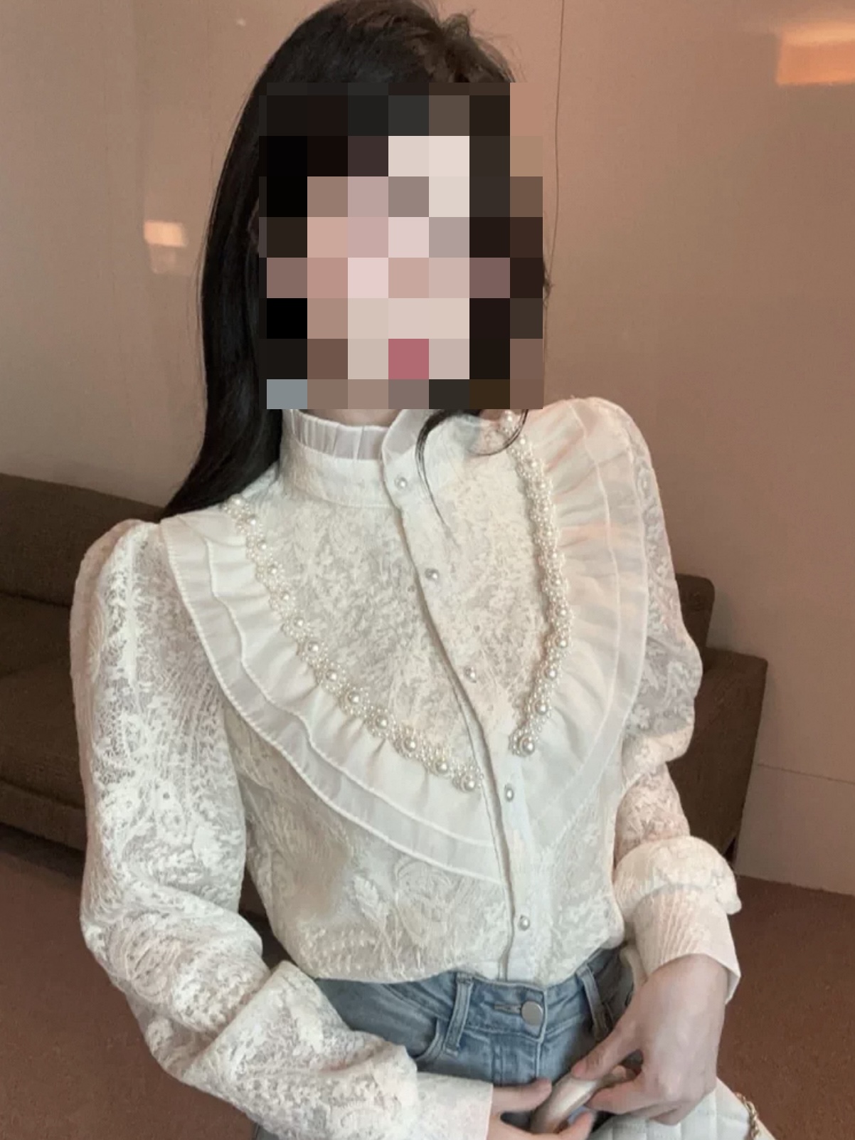 小香风荷叶边泡泡袖蕾丝衬衫女秋冬半高领宫廷上衣高级感钉珠衬衣 服裝批發女裝批發服飾貨源