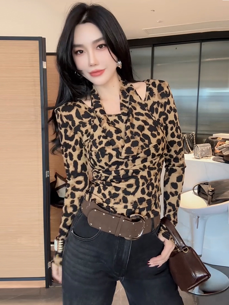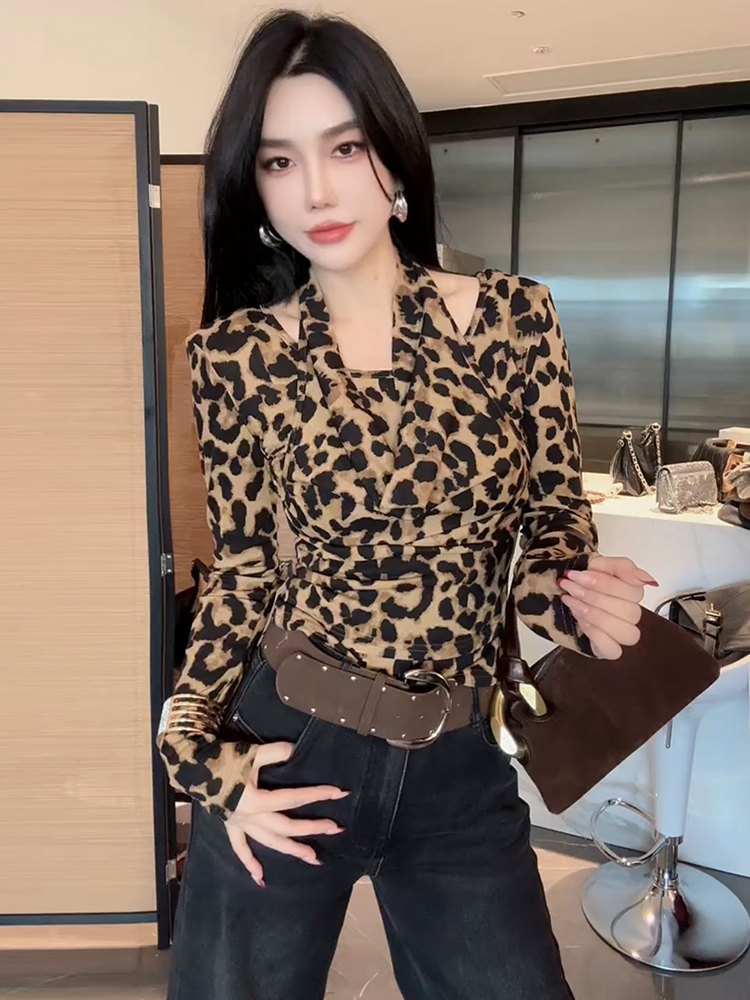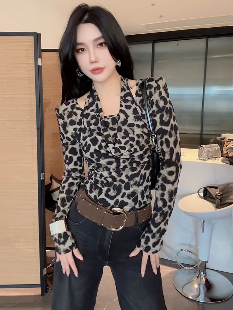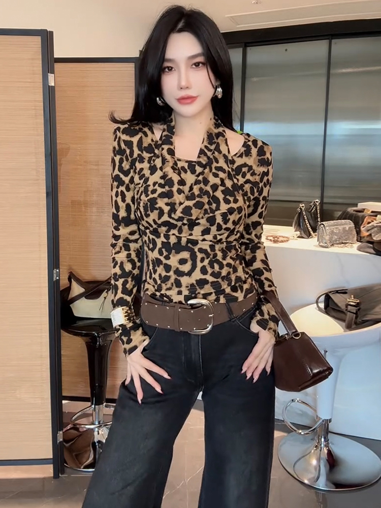 FA45693# 欧货假两件挂脖豹纹T恤女秋季新覆古设计感气质显瘦百搭长袖上衣 服裝批發女裝批發服飾貨源