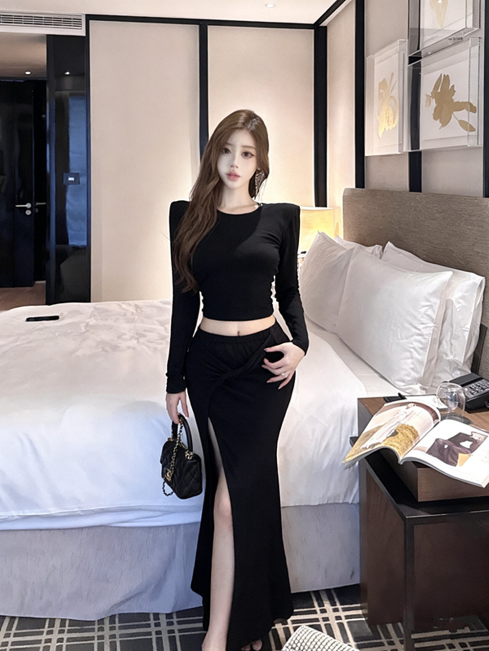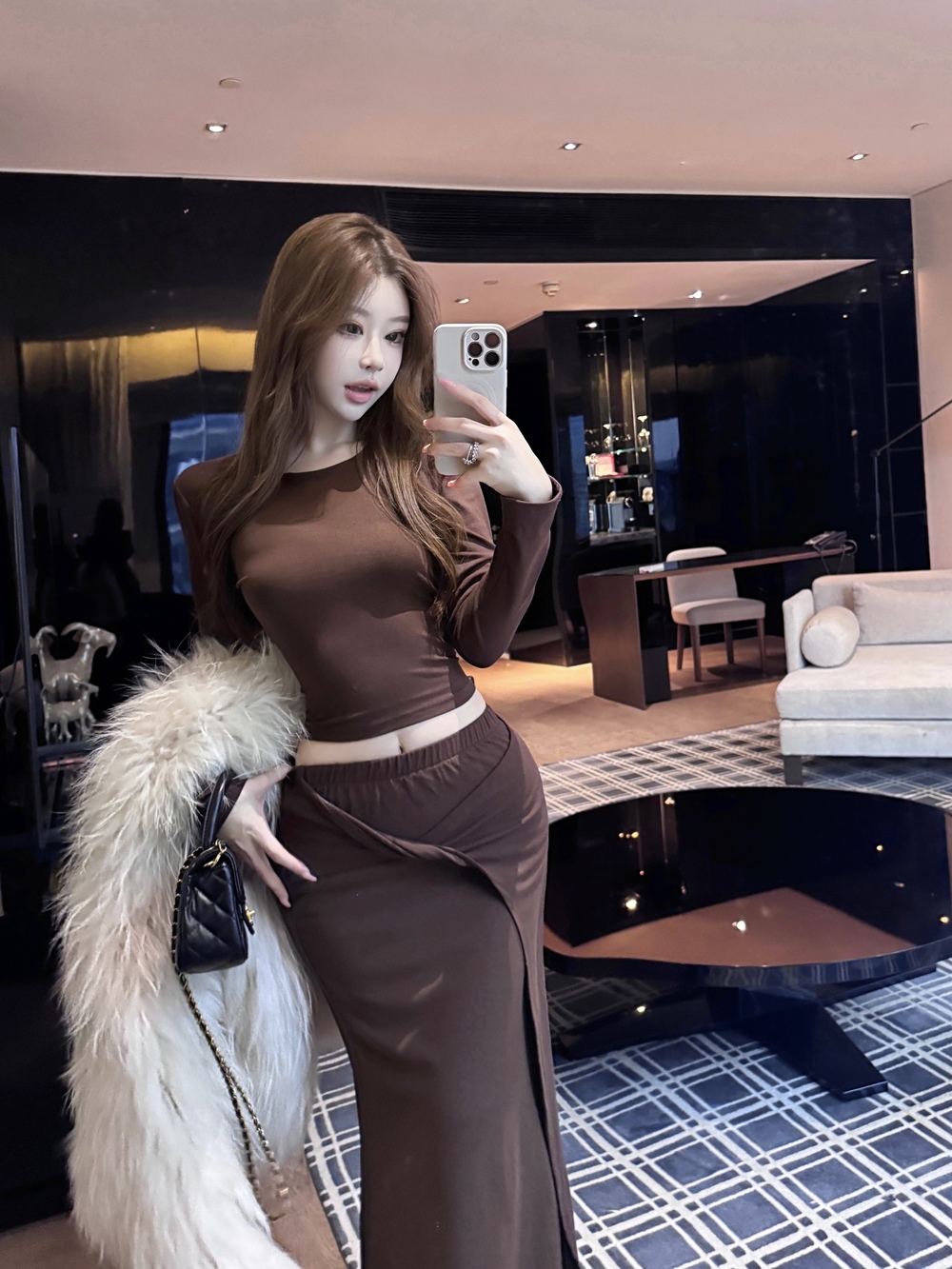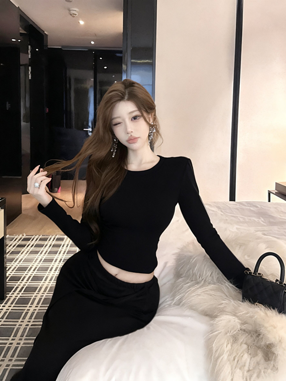 FA45694# 韩系气质镂空露背长袖T恤扭结高腰半身裙两件套套装 服裝批發女裝批發服飾貨源