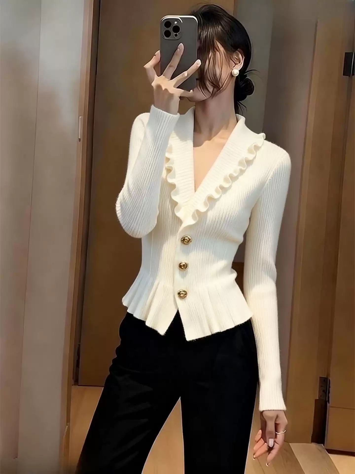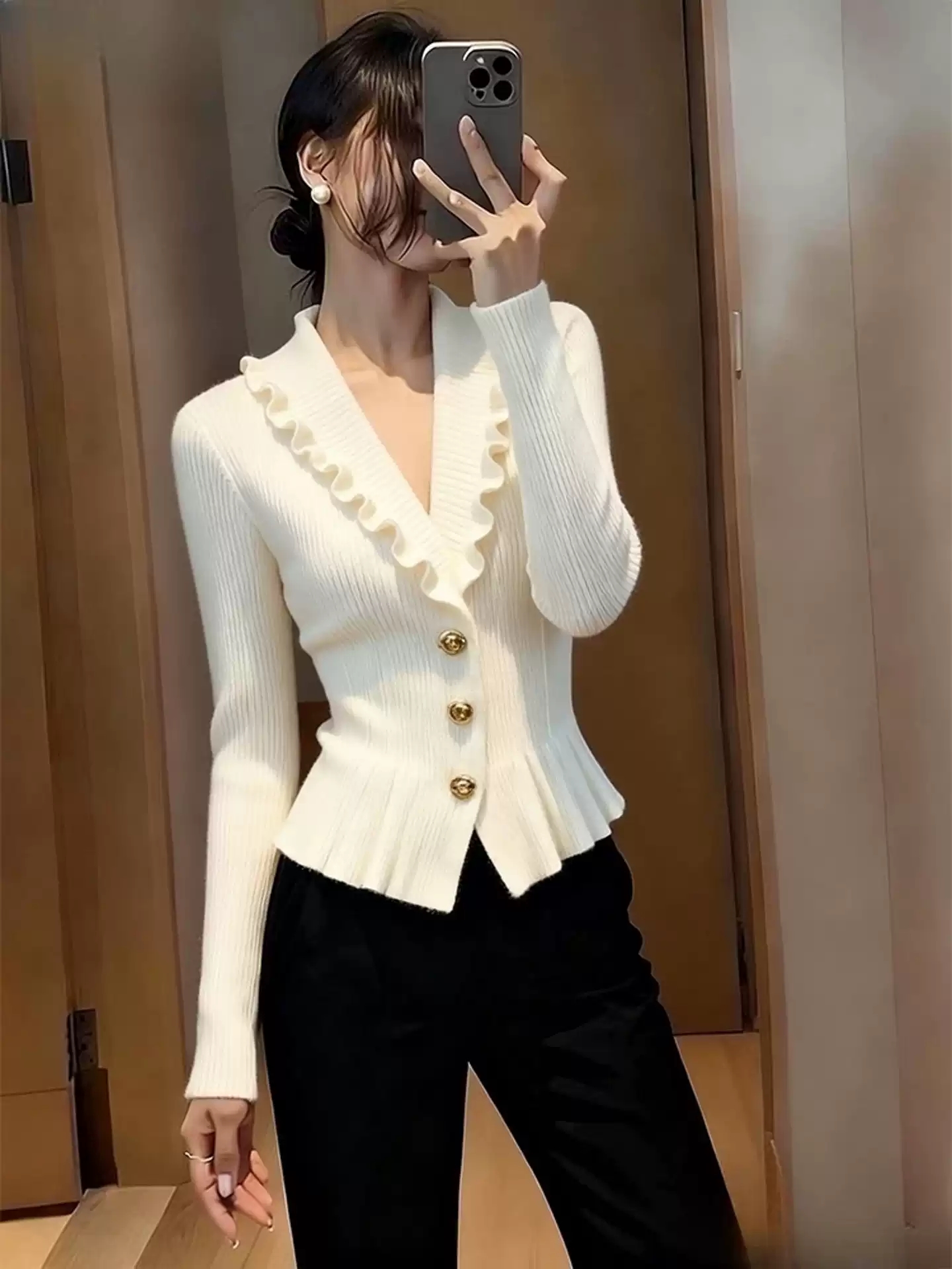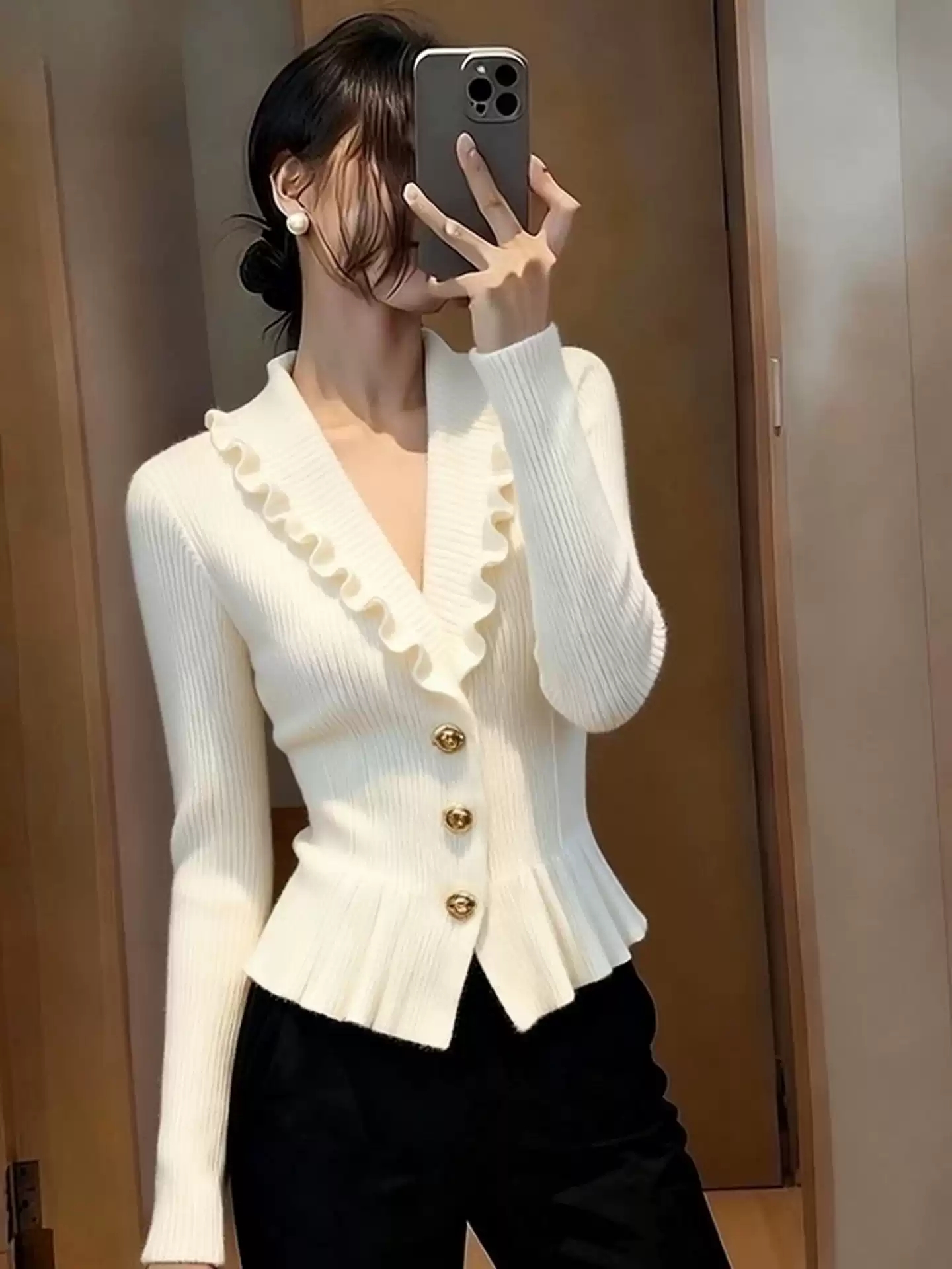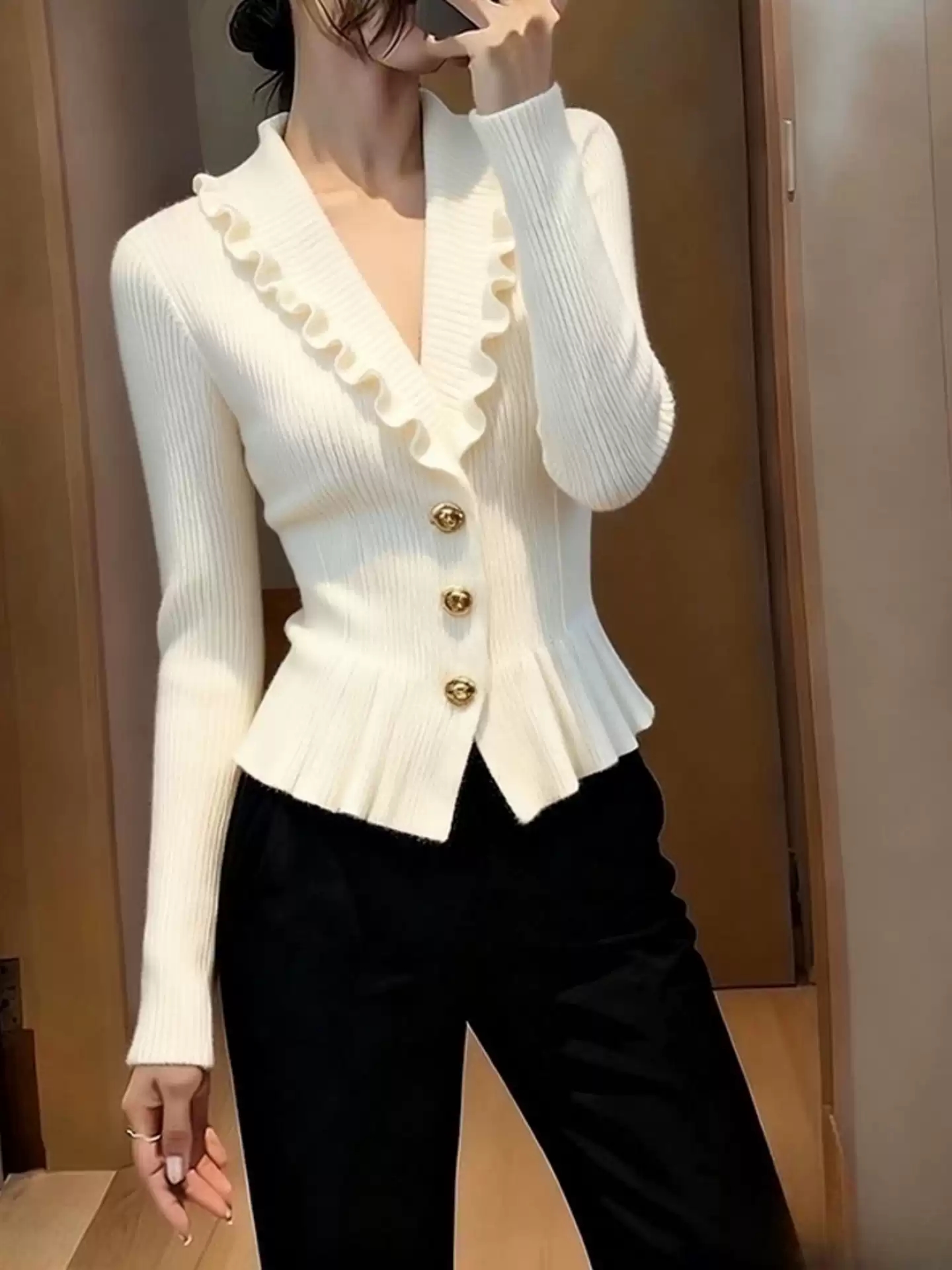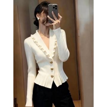 小香风荷叶边V领针织衫女秋冬高端毛衣独特漂亮气质修身白色上衣 服裝批發女裝批發服飾貨源