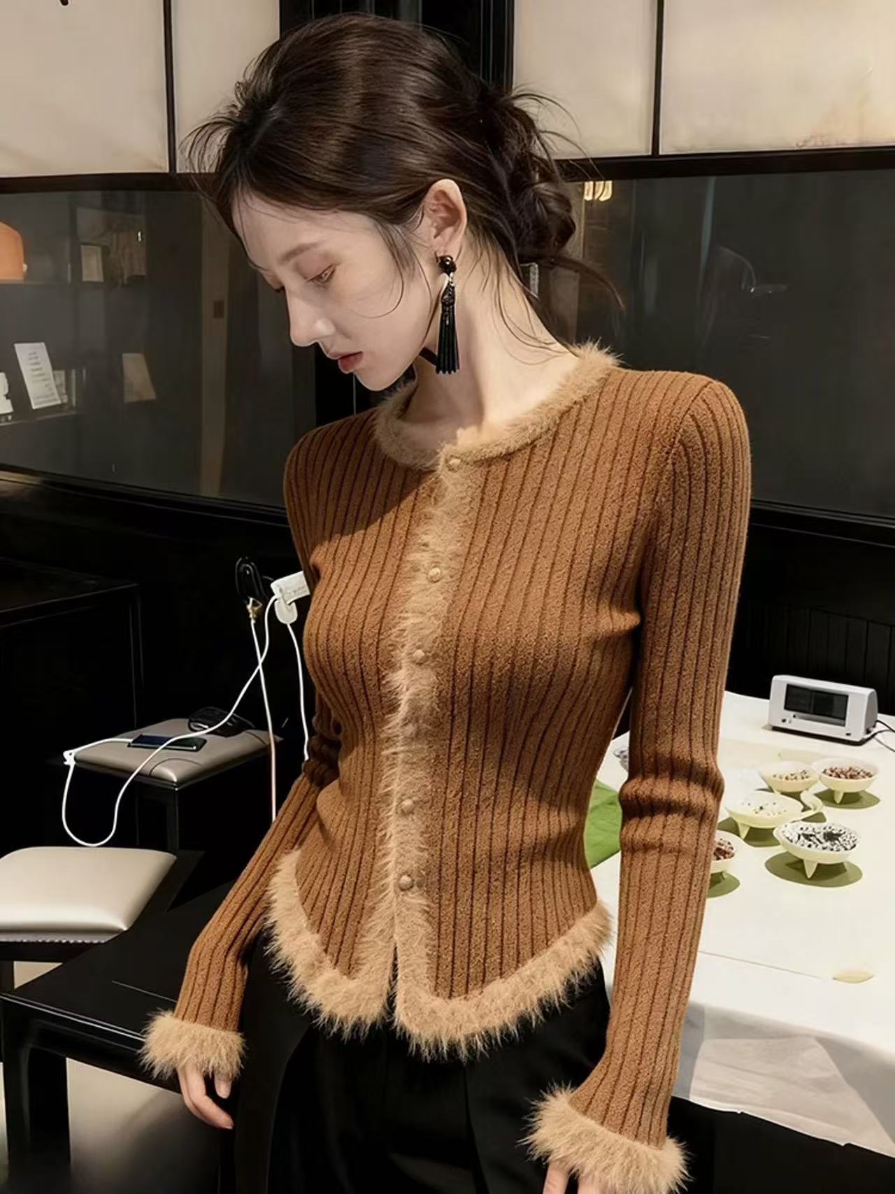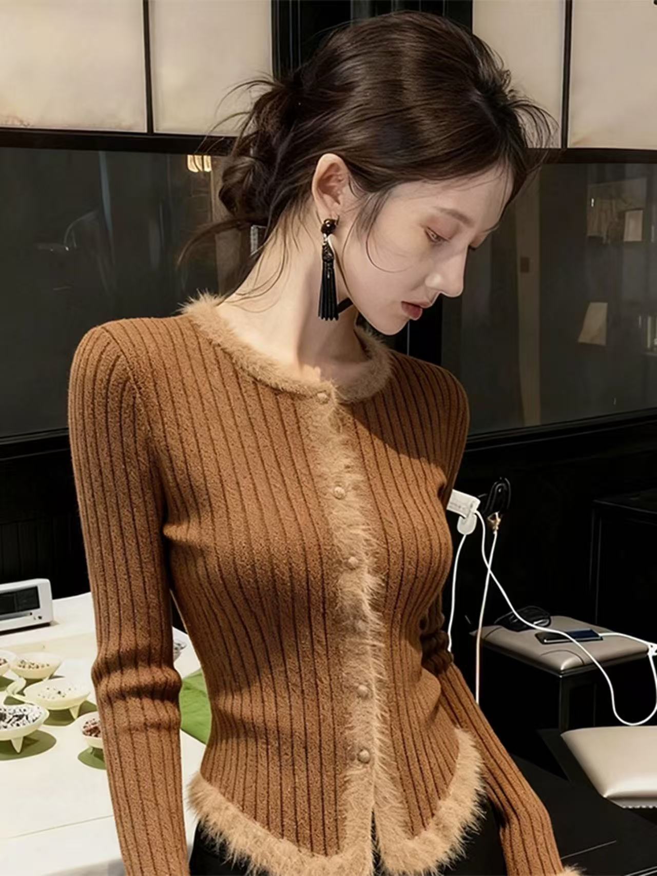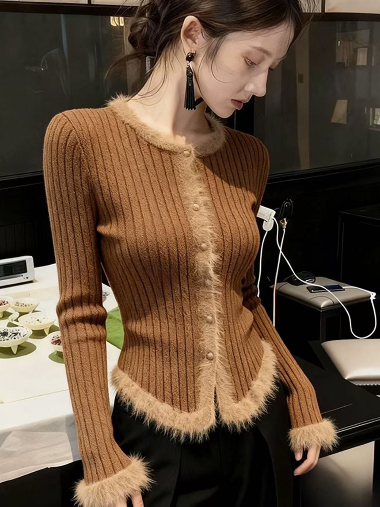 绝美巨好看早秋上衣女设计感小众气质高端掐腰小香风咖色针织毛衣 服裝批發女裝批發服飾貨源