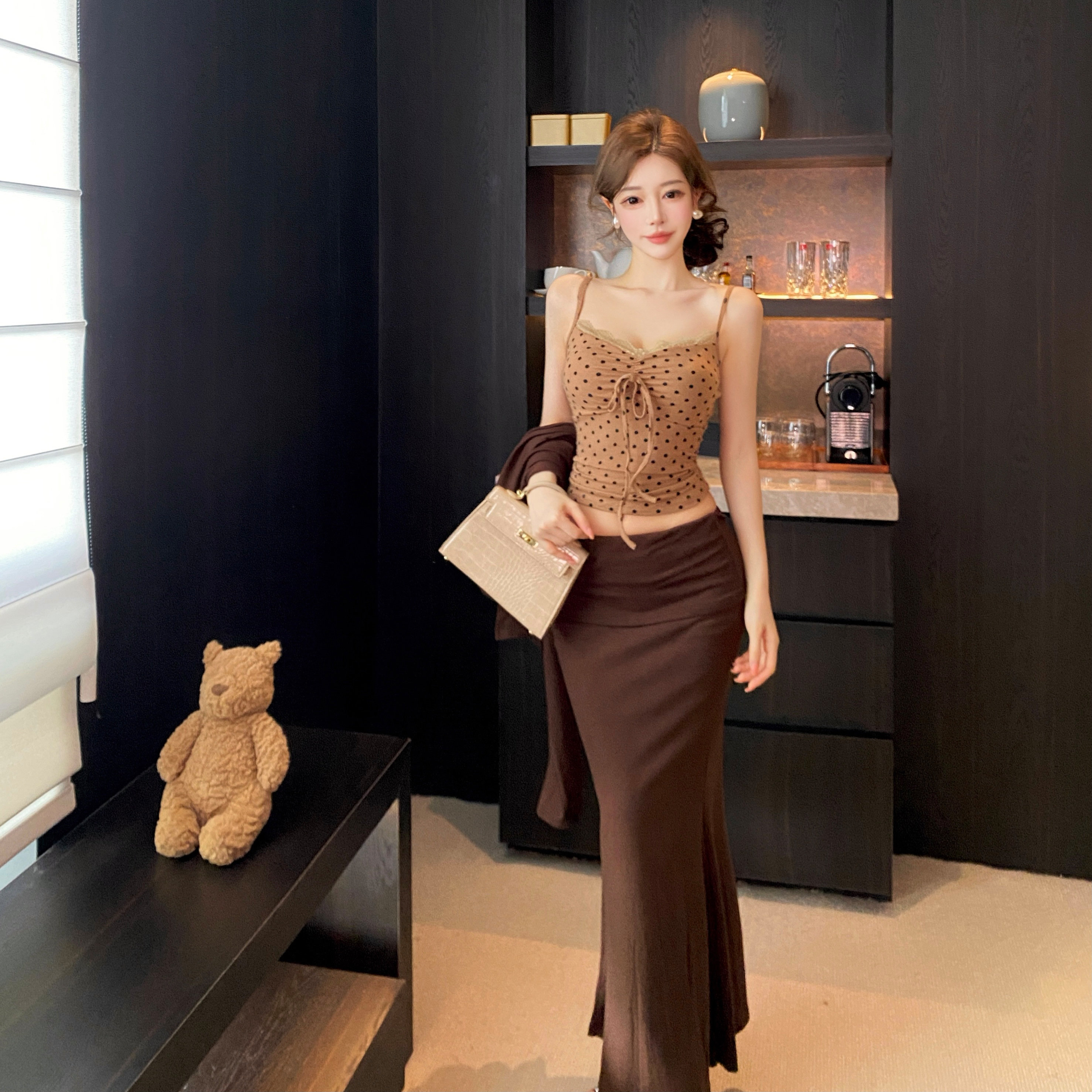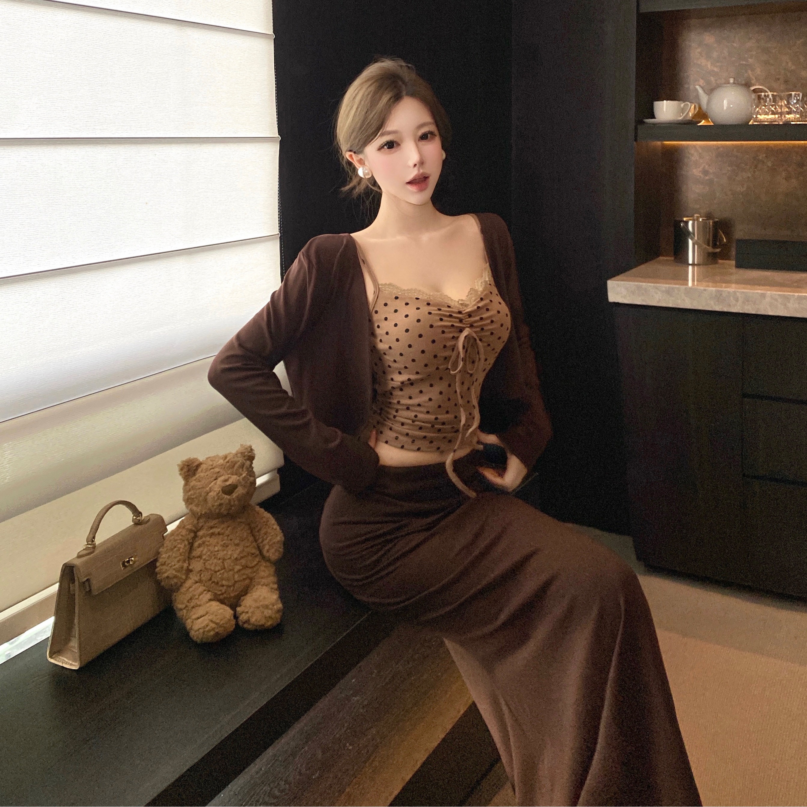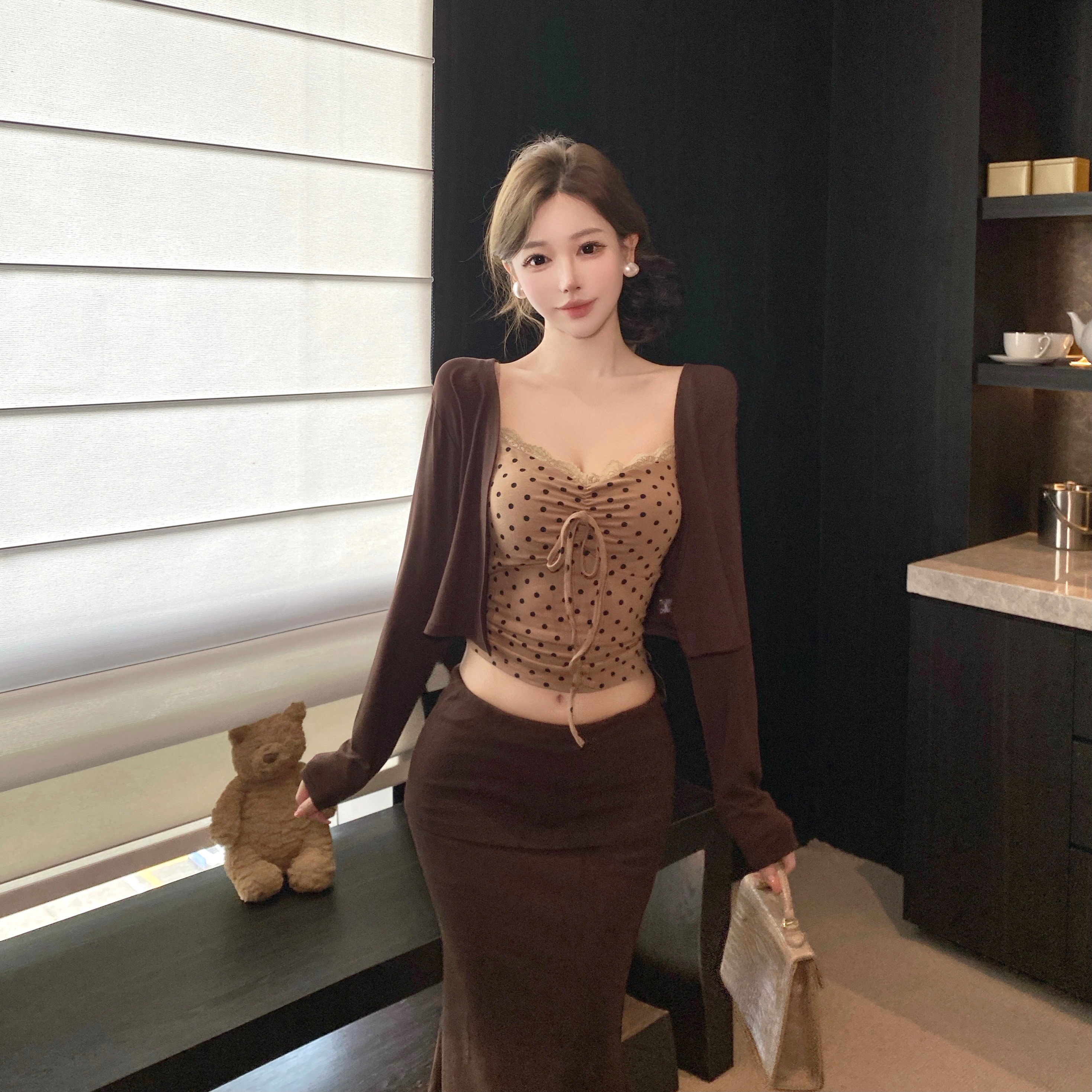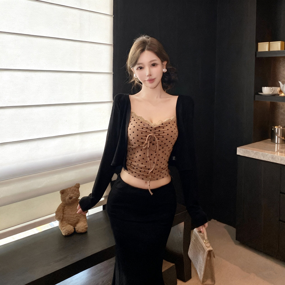 蕾丝拼接波点纯欲吊带背心长袖开衫女冬套装鱼尾裙半裙三件套 服裝批發女裝批發服飾貨源