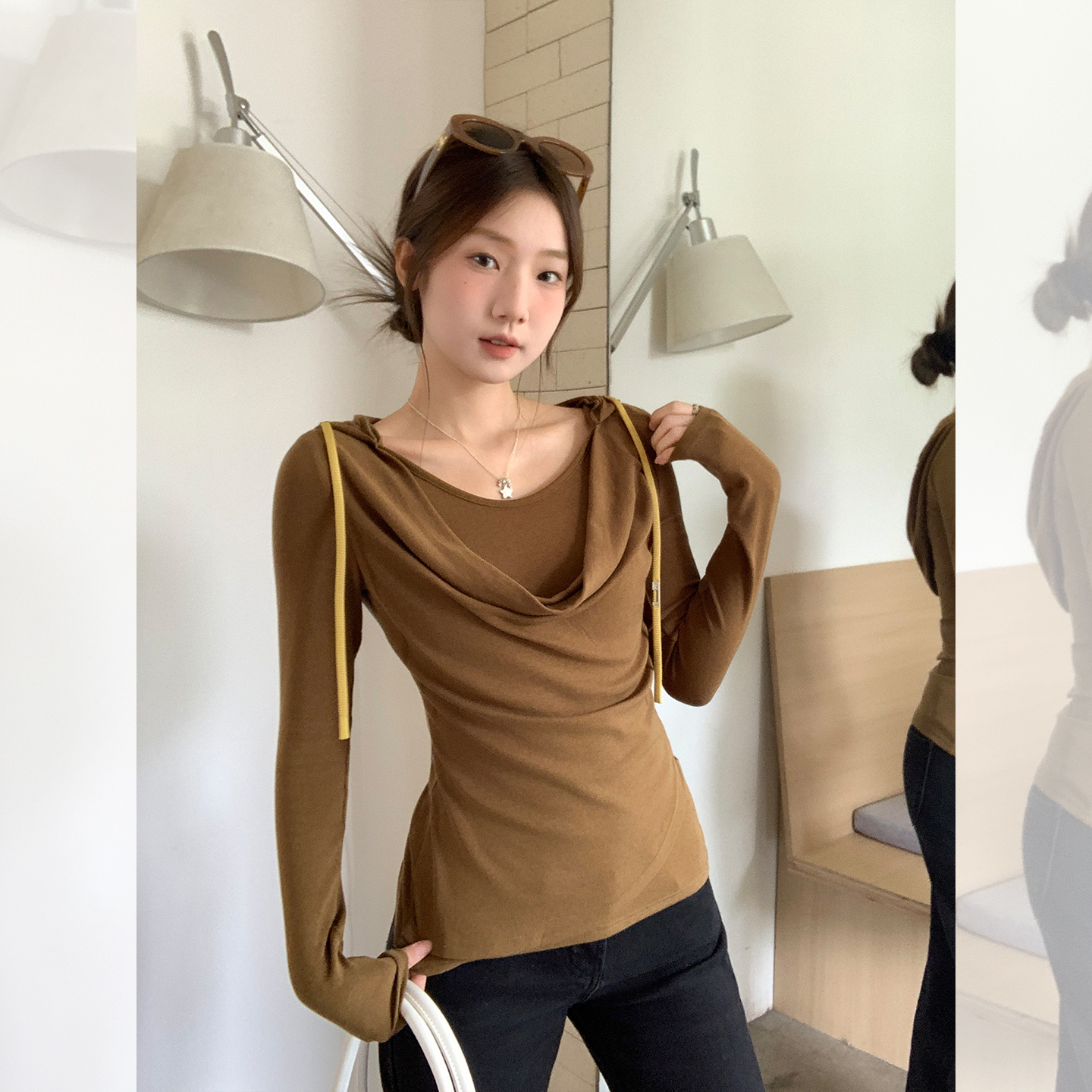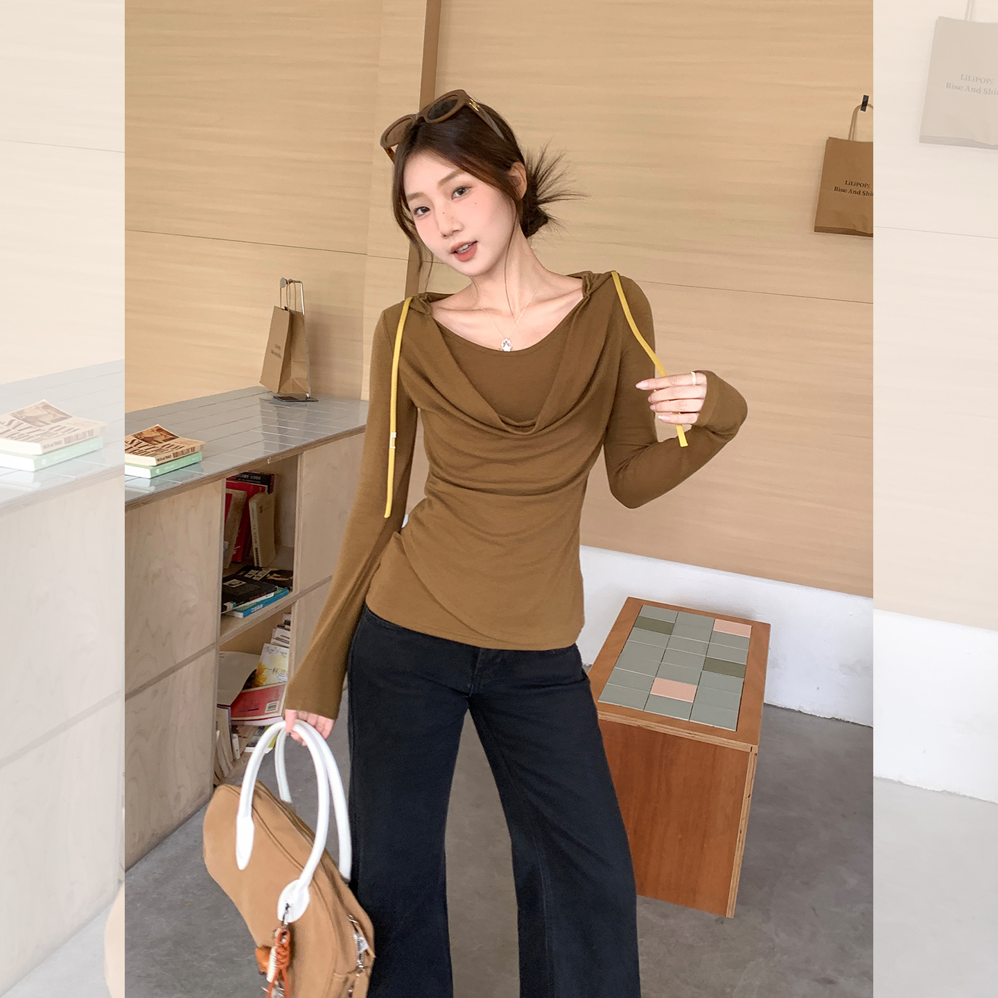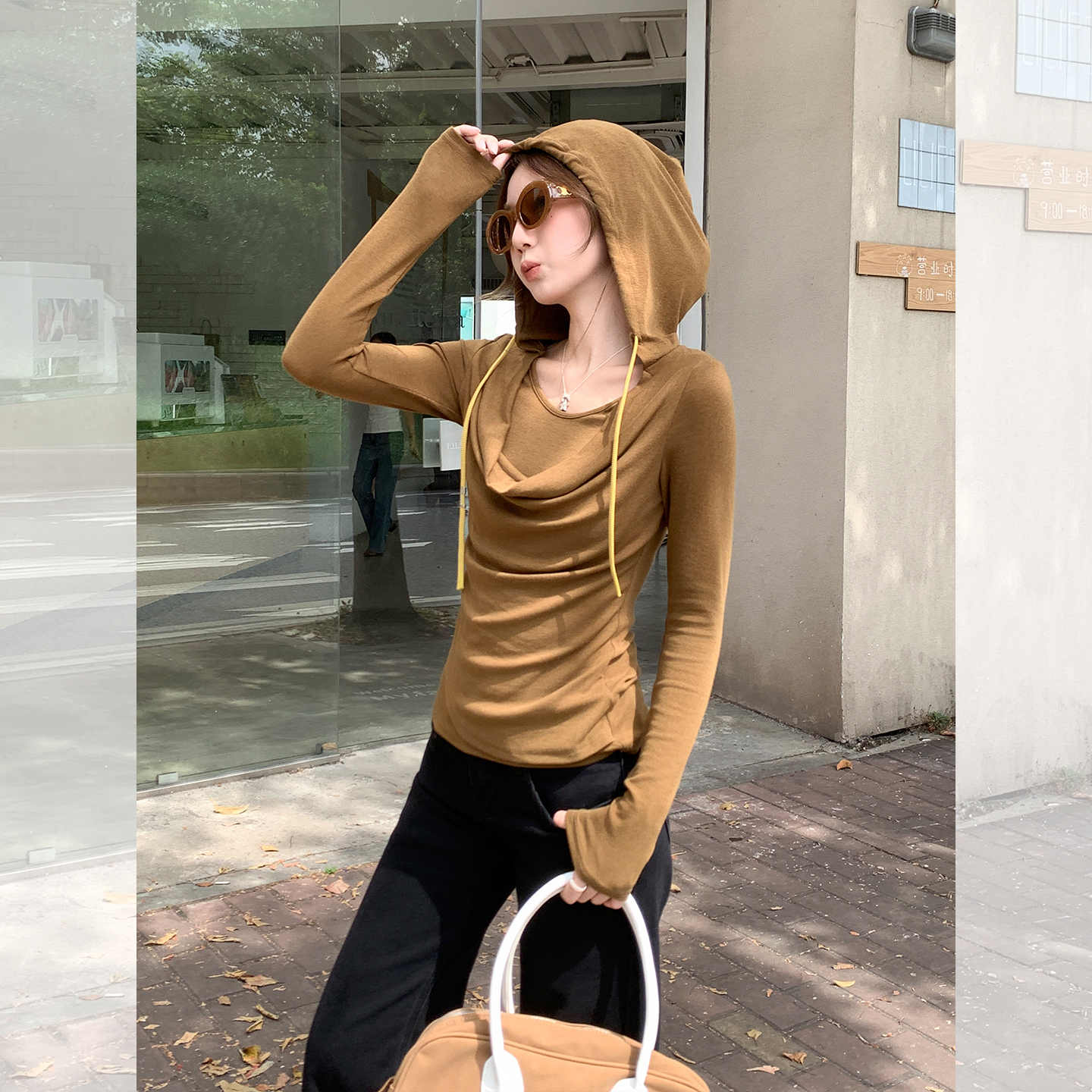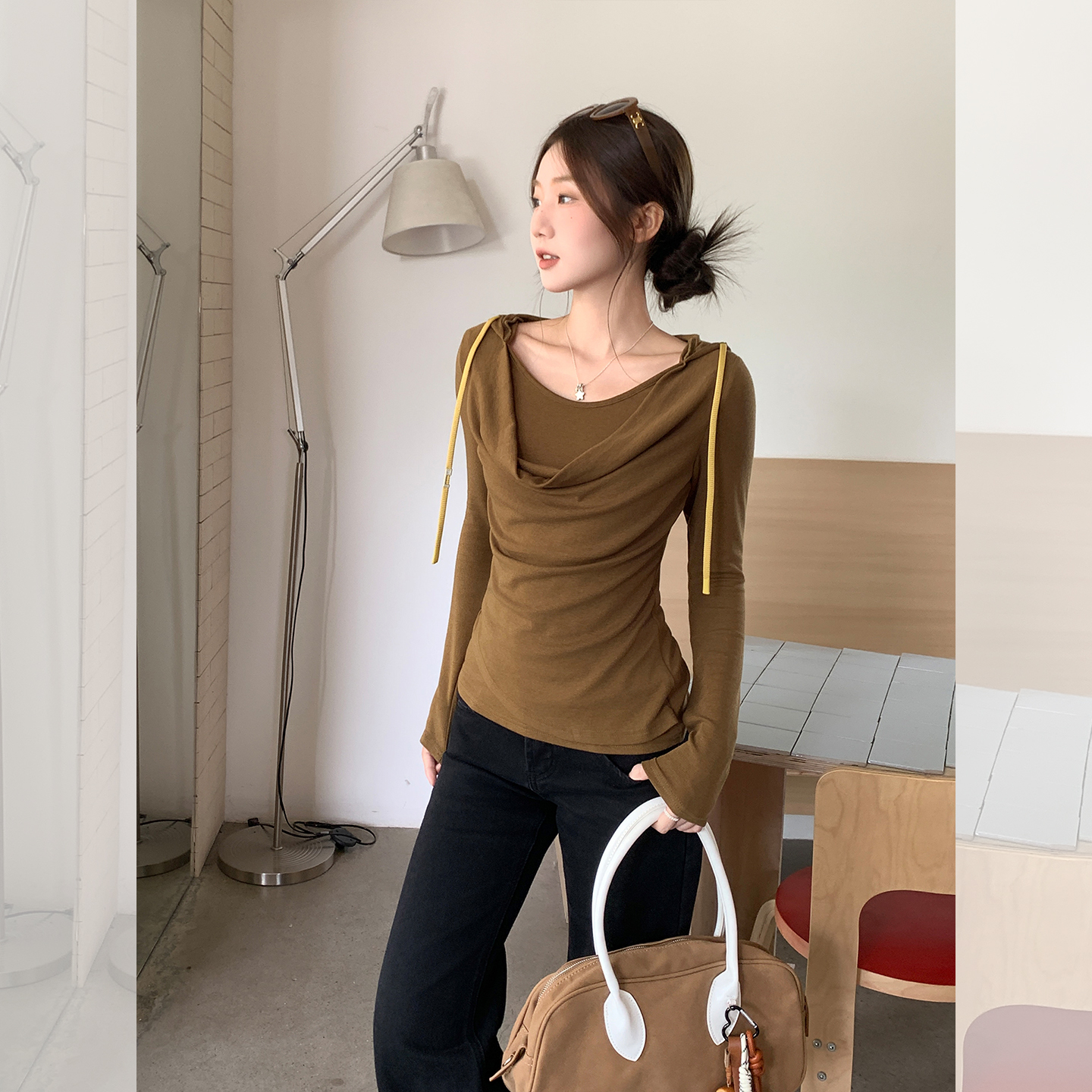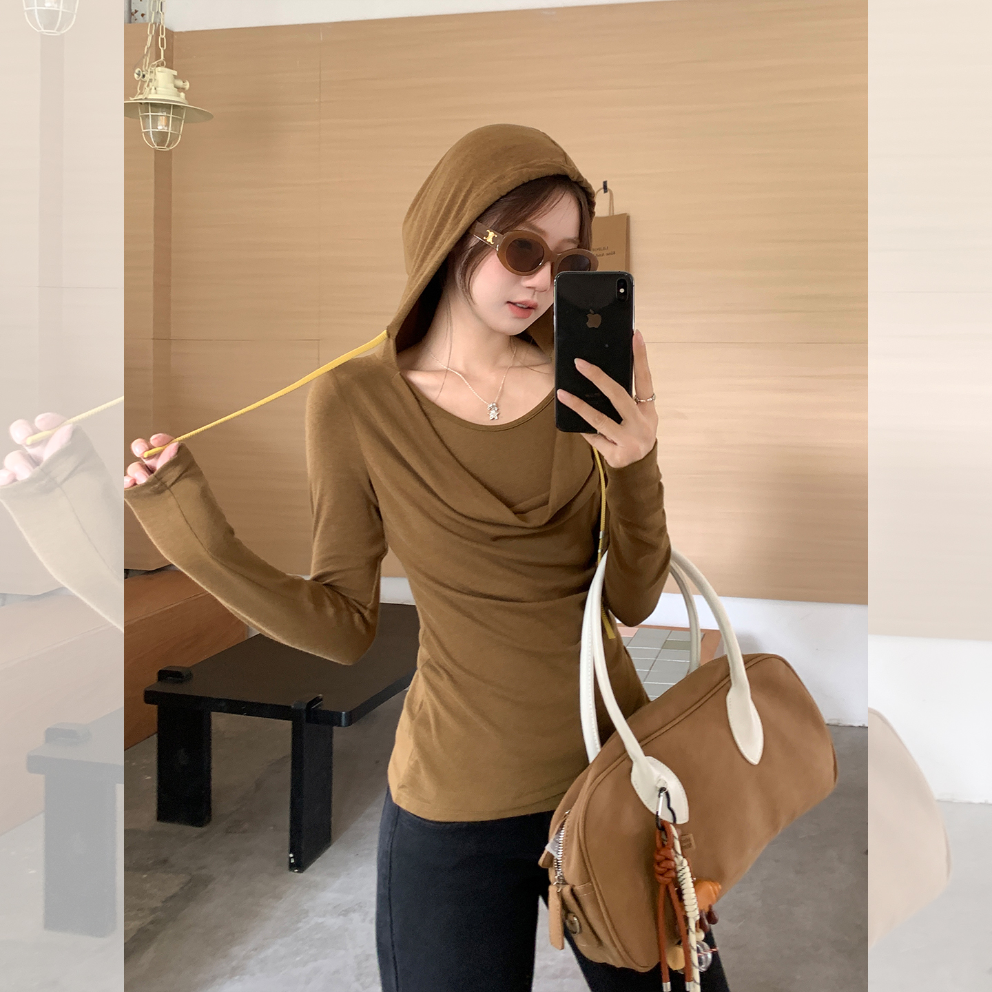 荡领叠穿连帽长袖T恤女秋季纯色收褶设计感修身显瘦上衣 服裝批發女裝批發服飾貨源