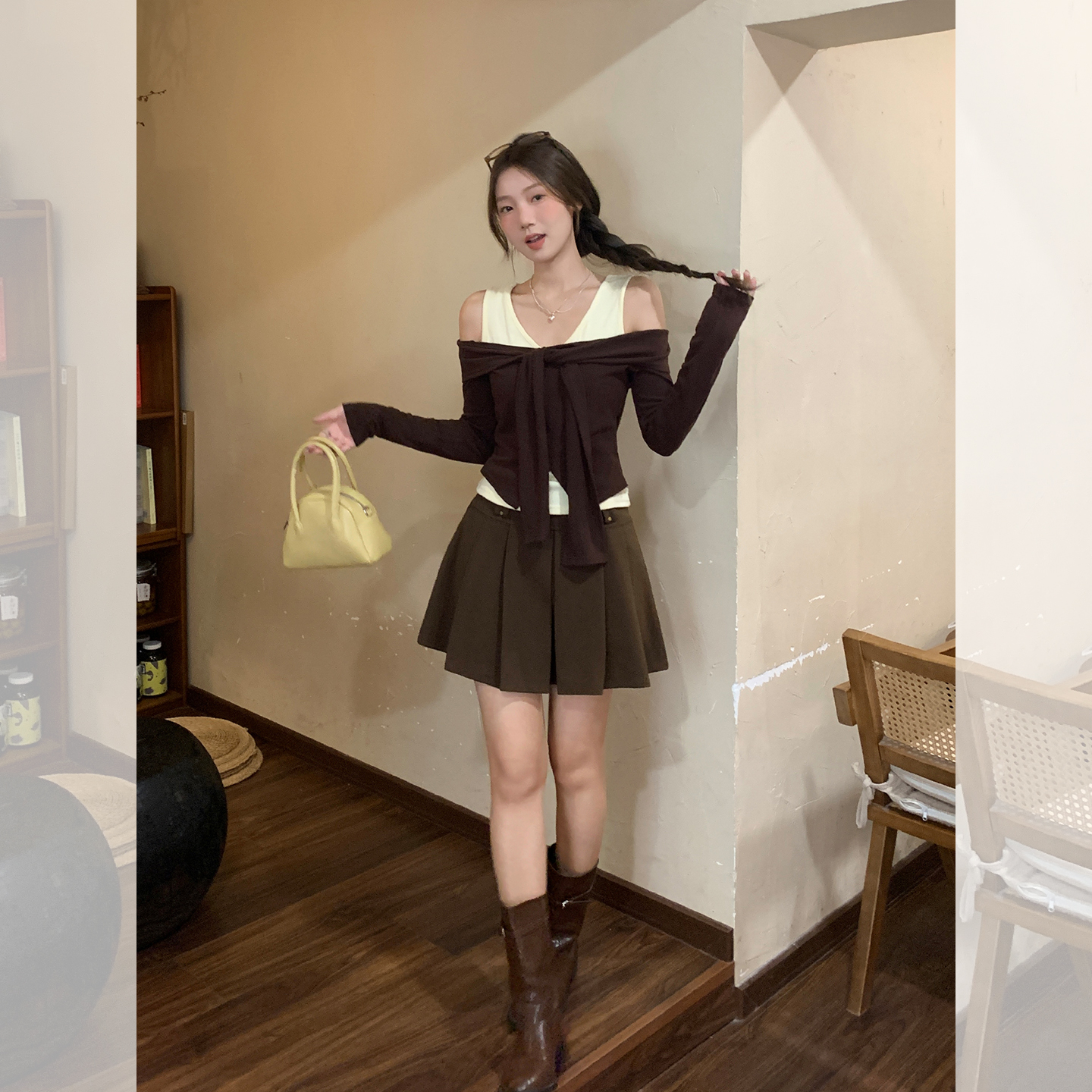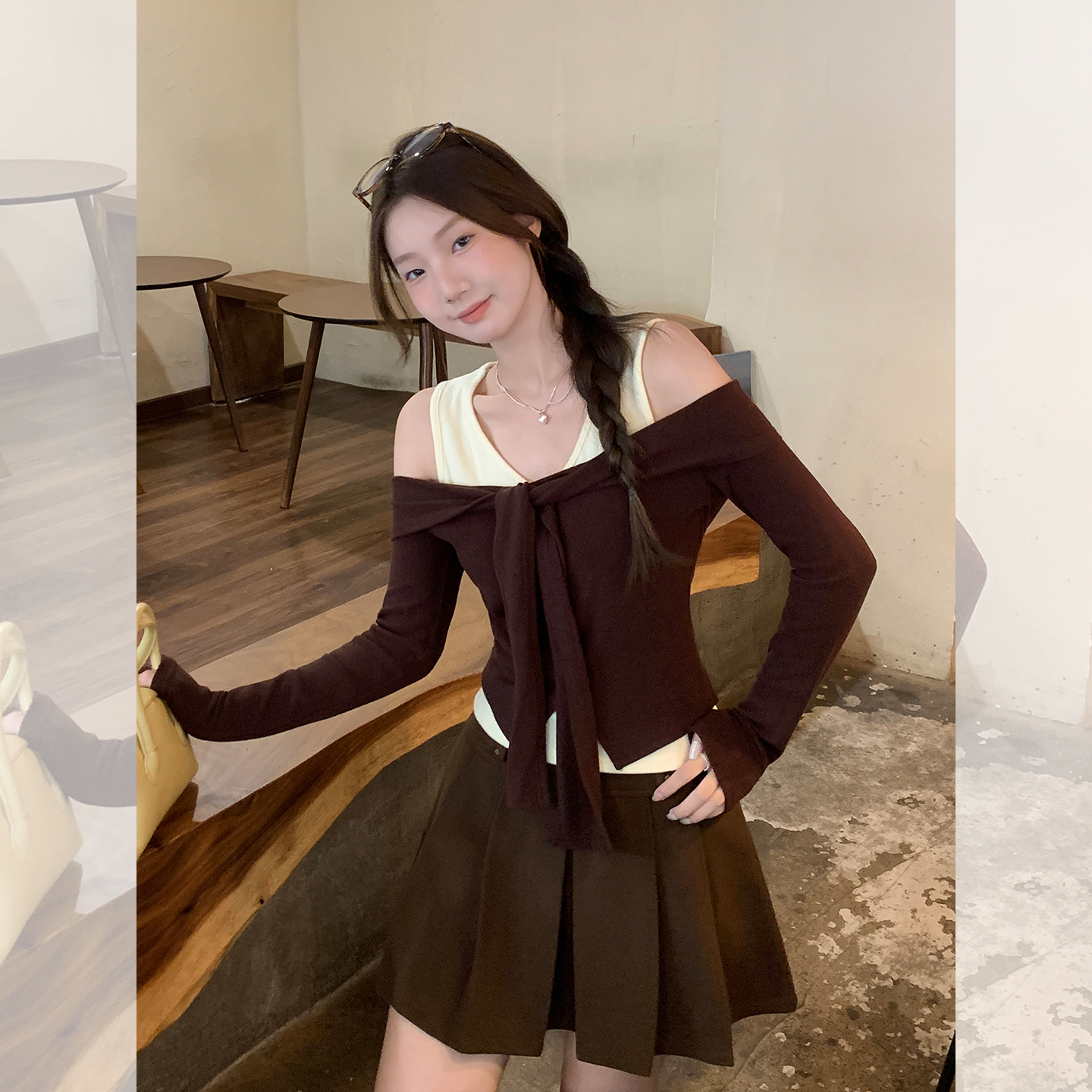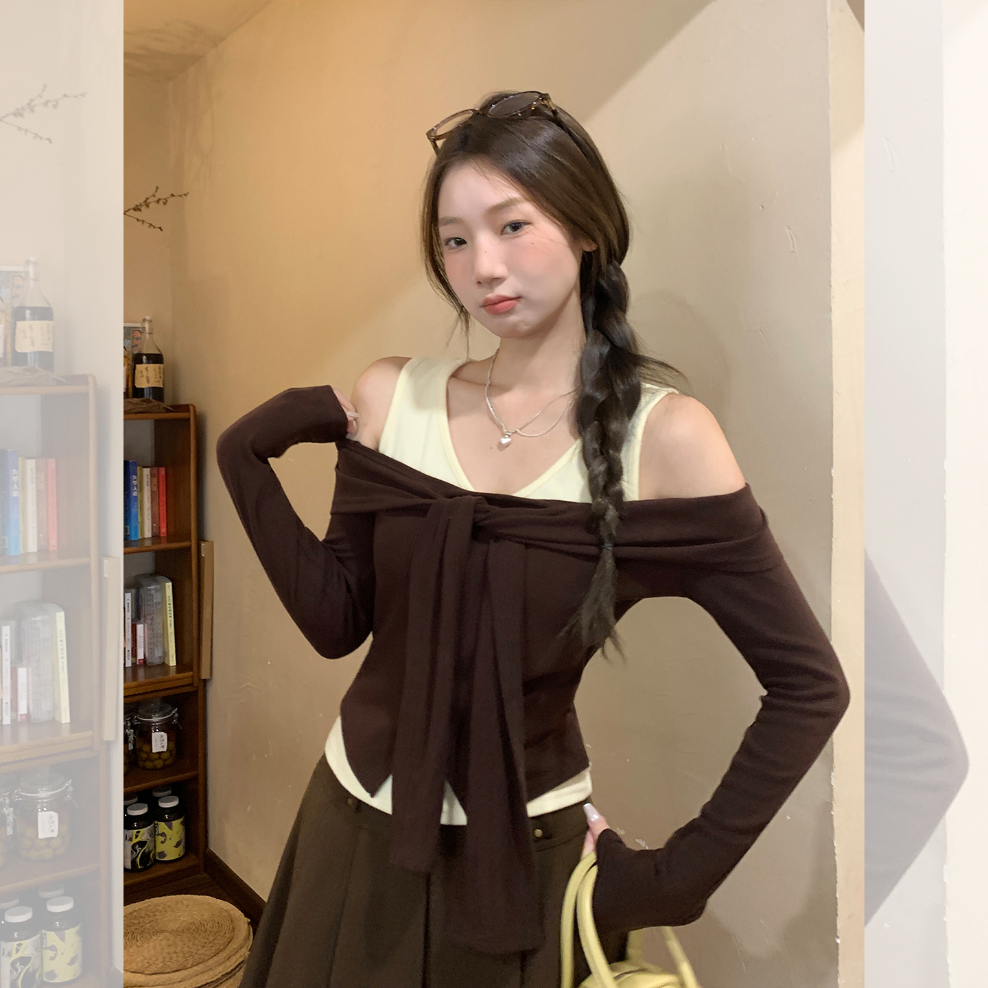 复古V领绑带披肩长袖T恤打底内搭秋修身百搭上衣女假两件 服裝批發女裝批發服飾貨源