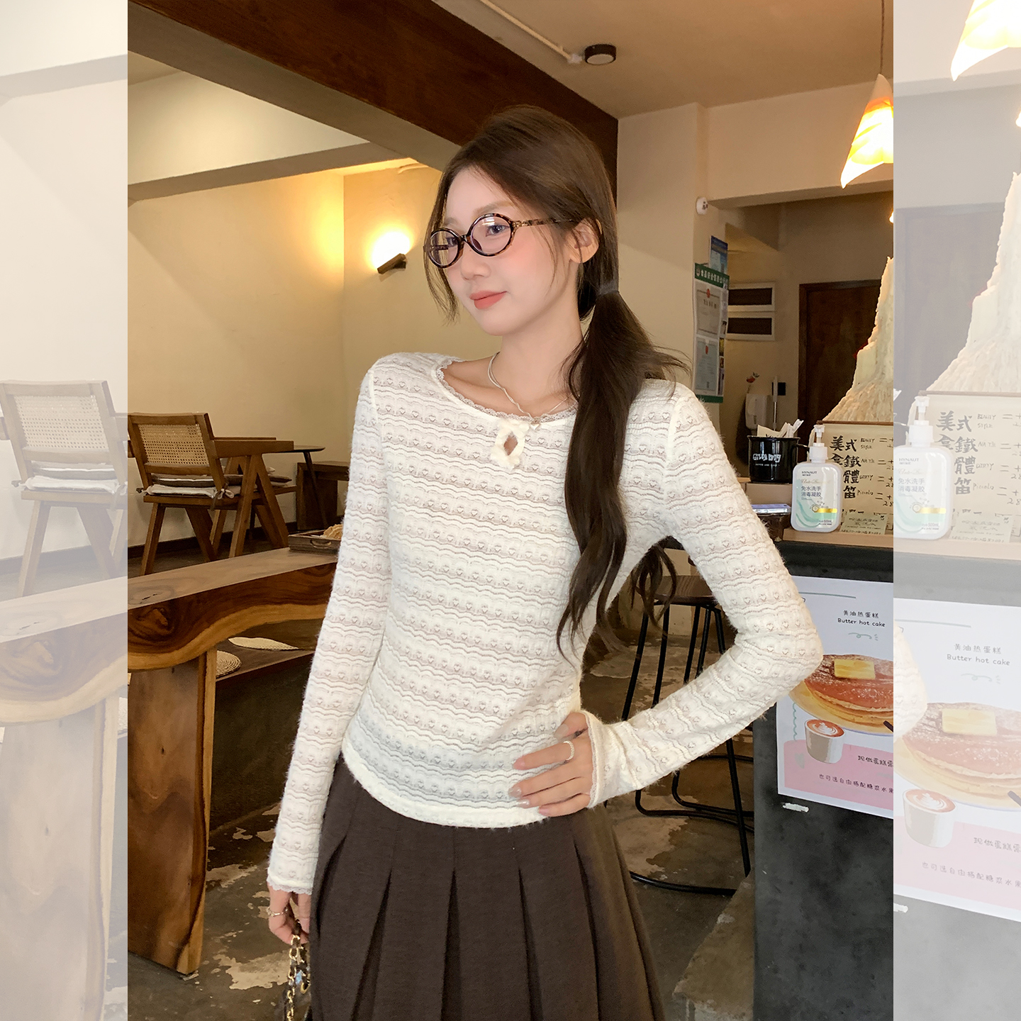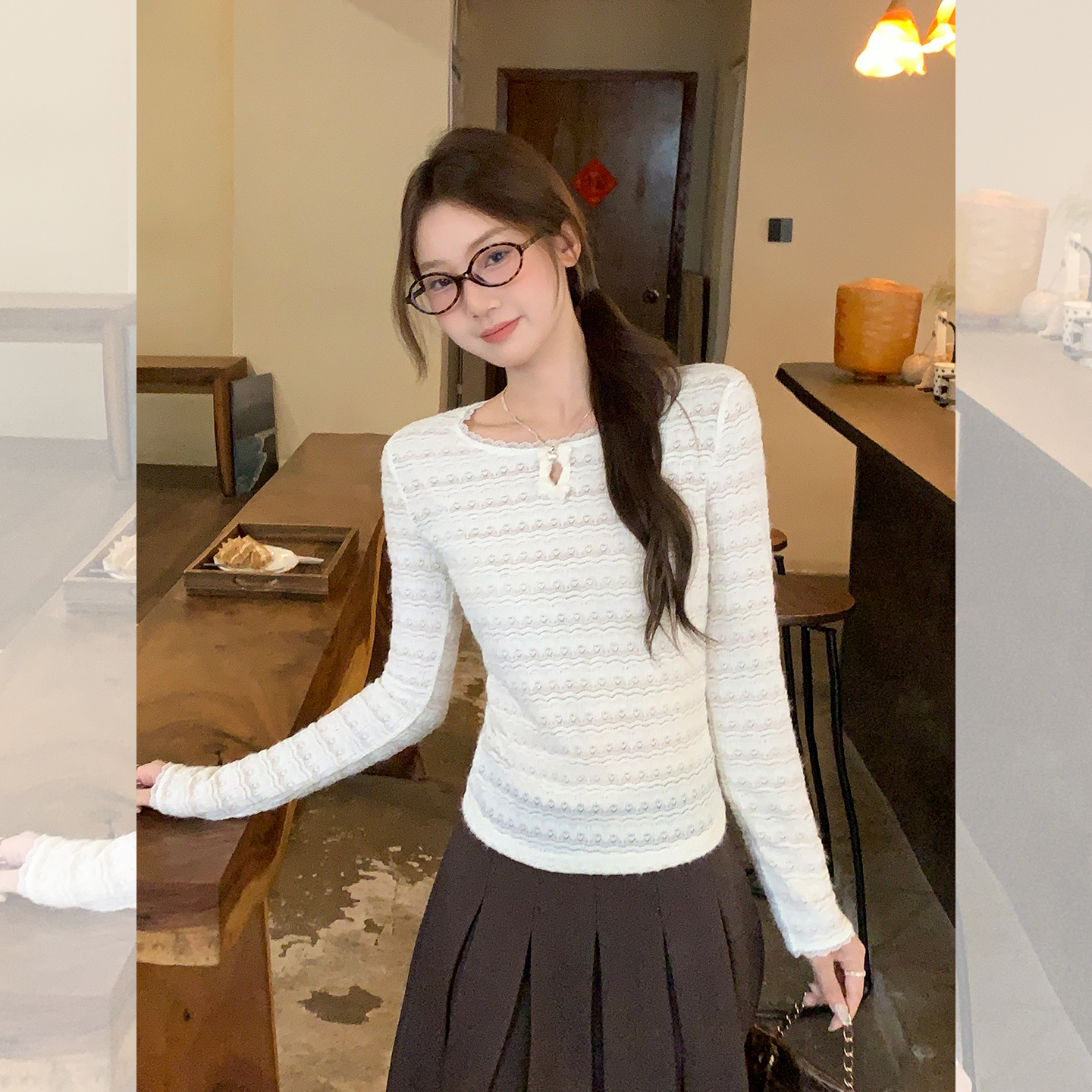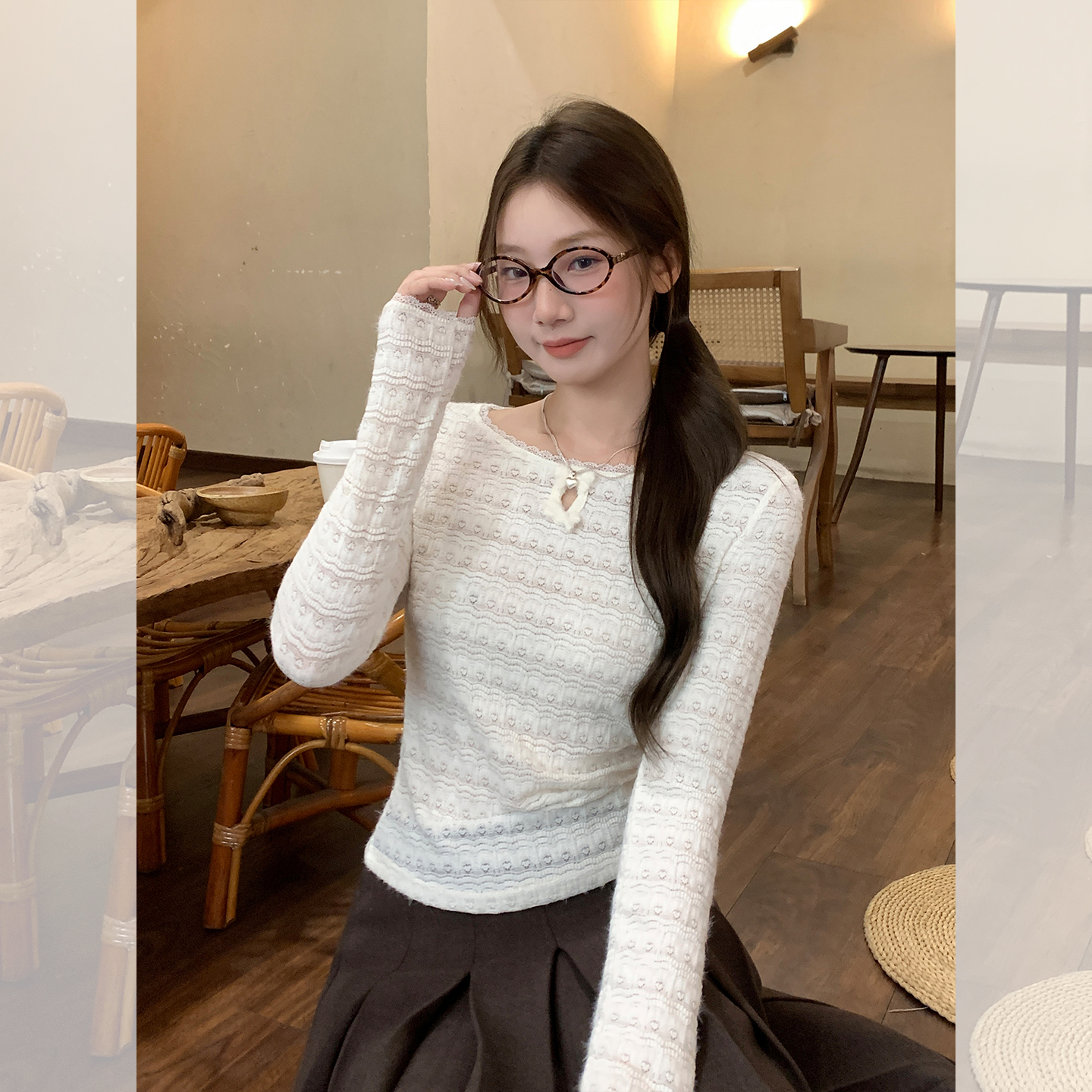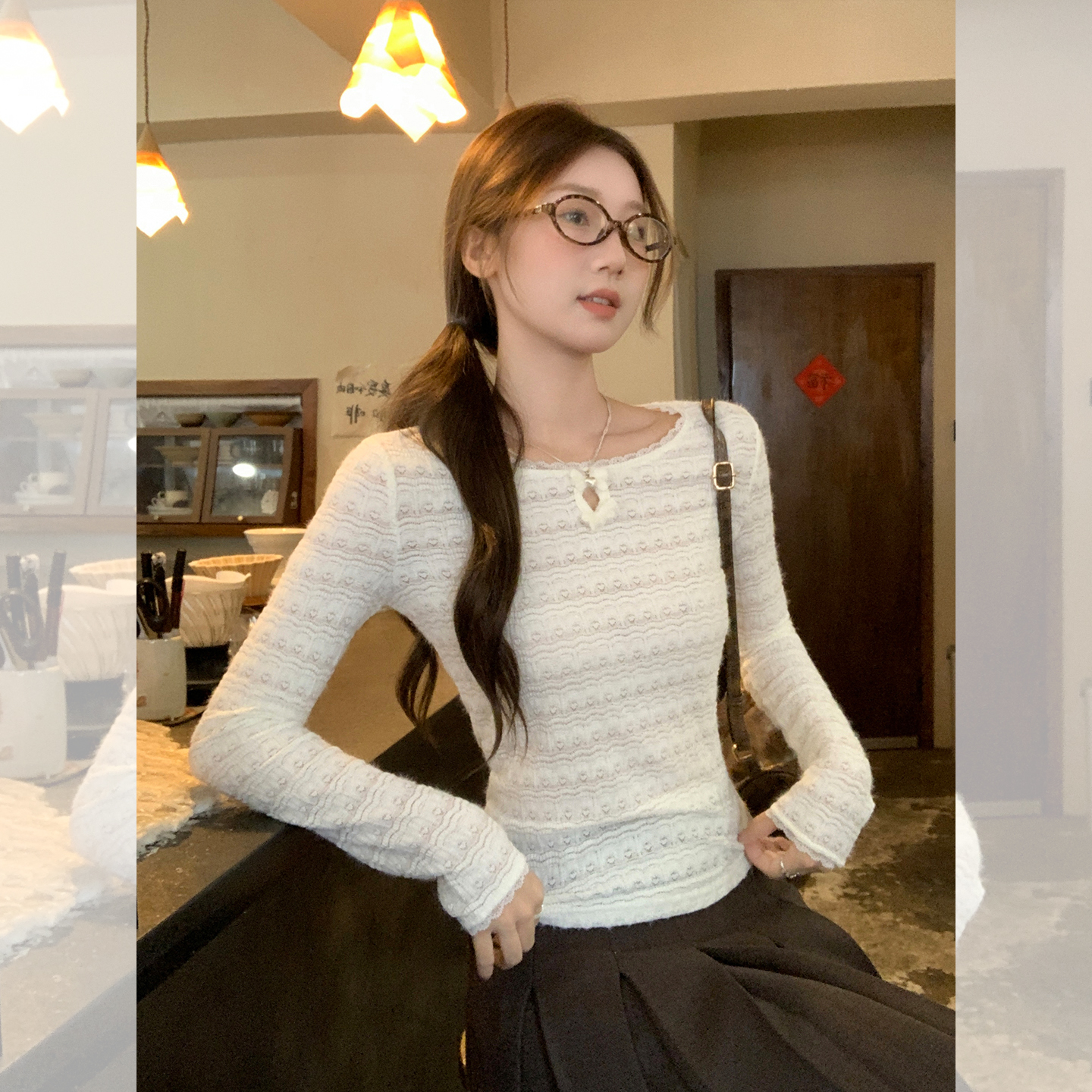 蕾丝镂空纯欲圆领长袖针织衫女秋修身显瘦打底衫上衣 服裝批發女裝批發服飾貨源