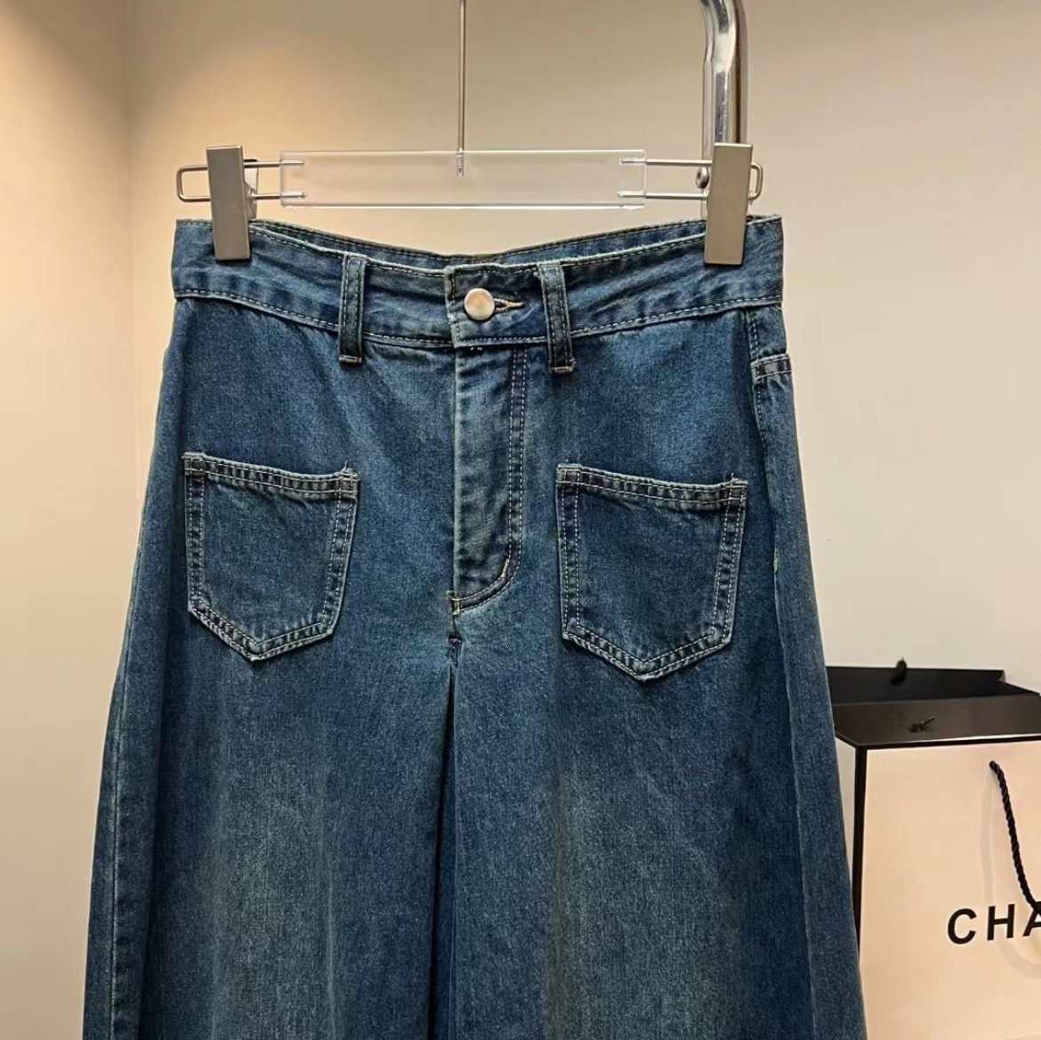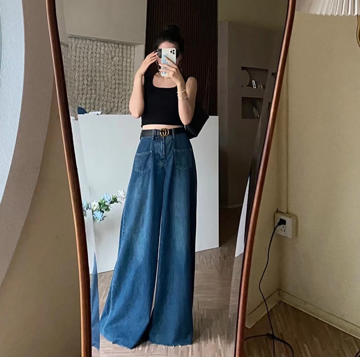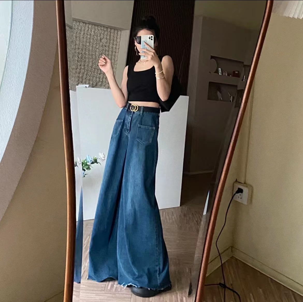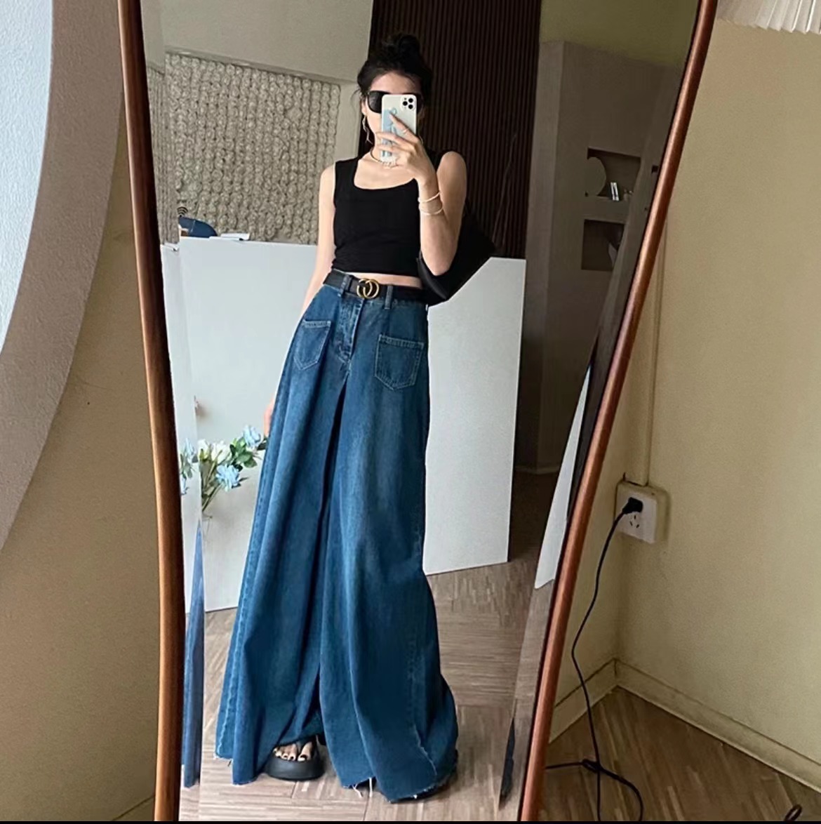 LN76339# 裤裙设计感毛边阔腿牛仔裤夏季薄款宽松垂感拖地裤