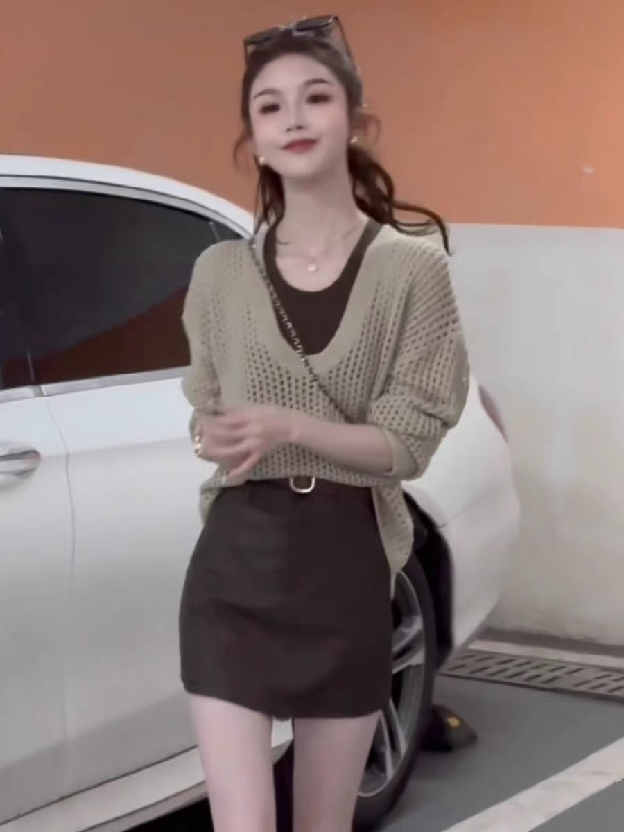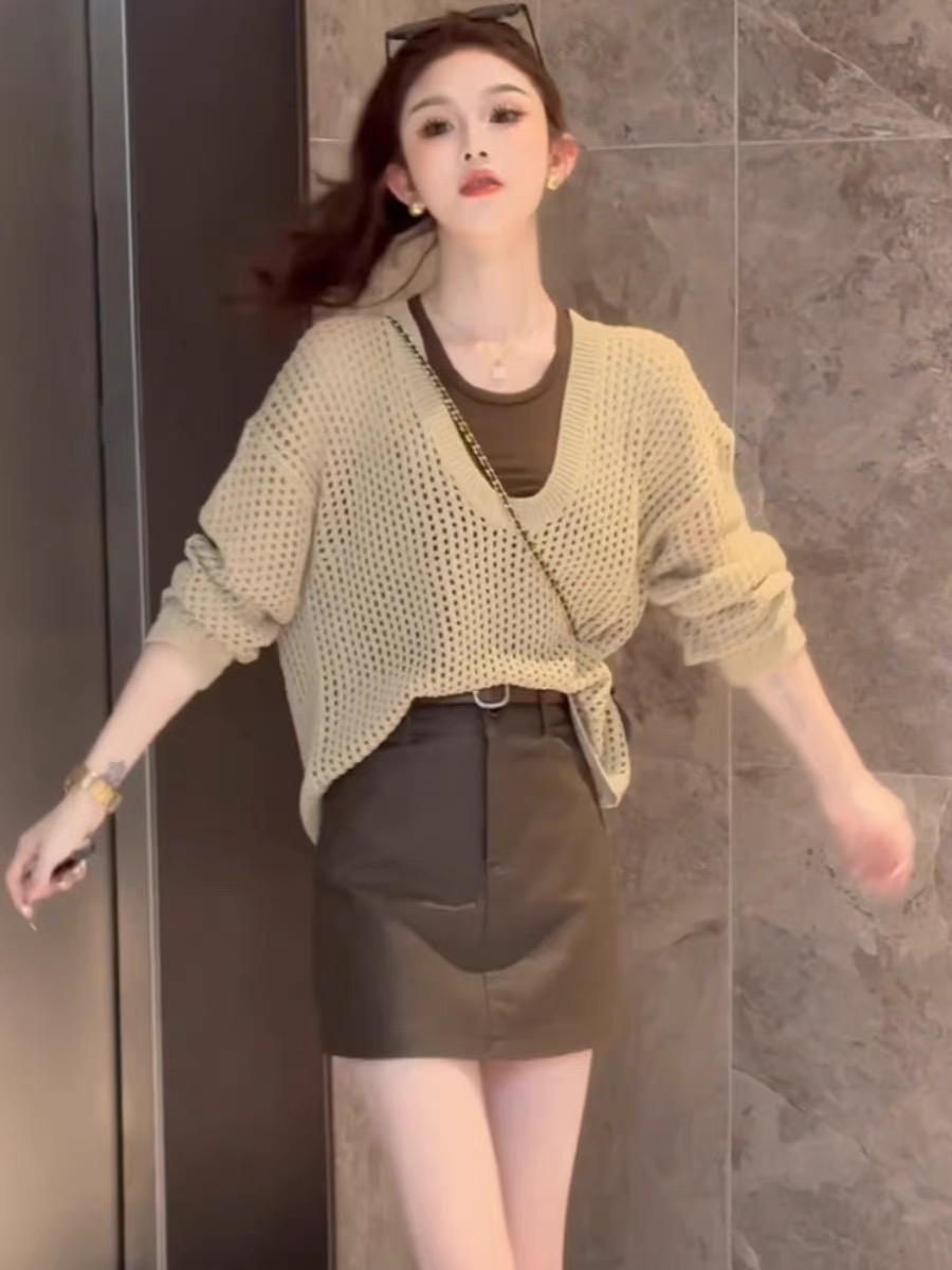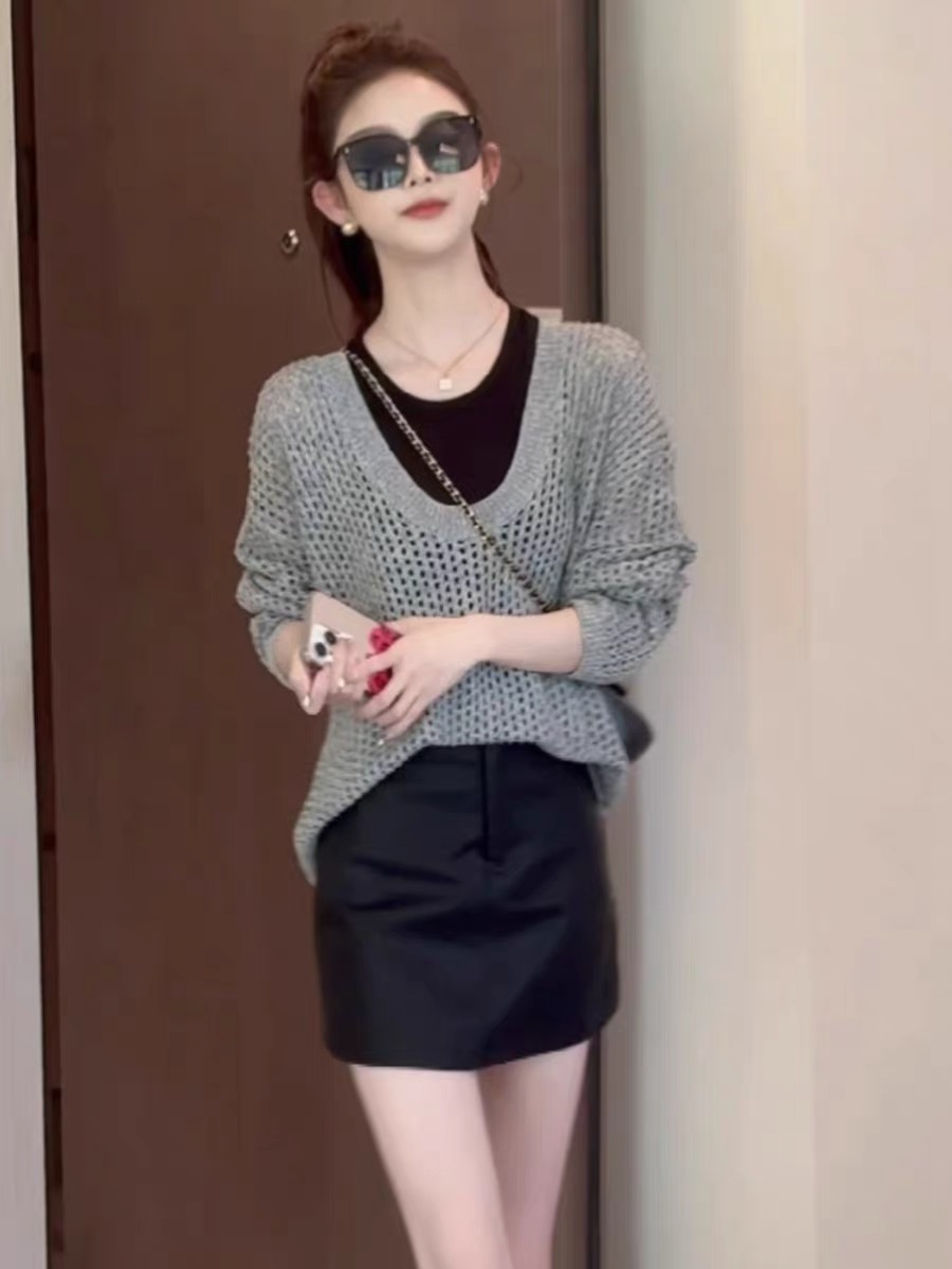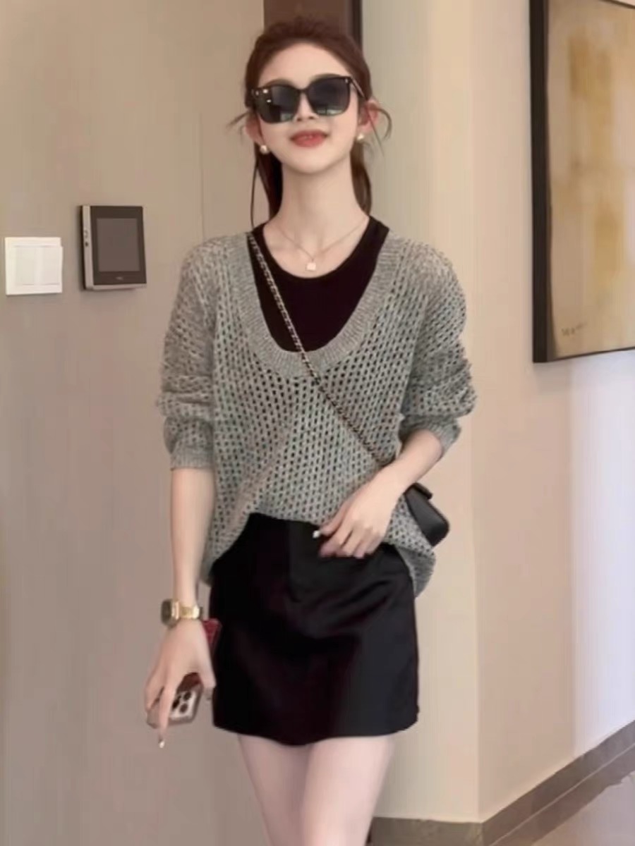 LN76340# 复古镂空后背绑带圆领长袖针织衫女秋季新款时尚休闲显瘦打底上衣