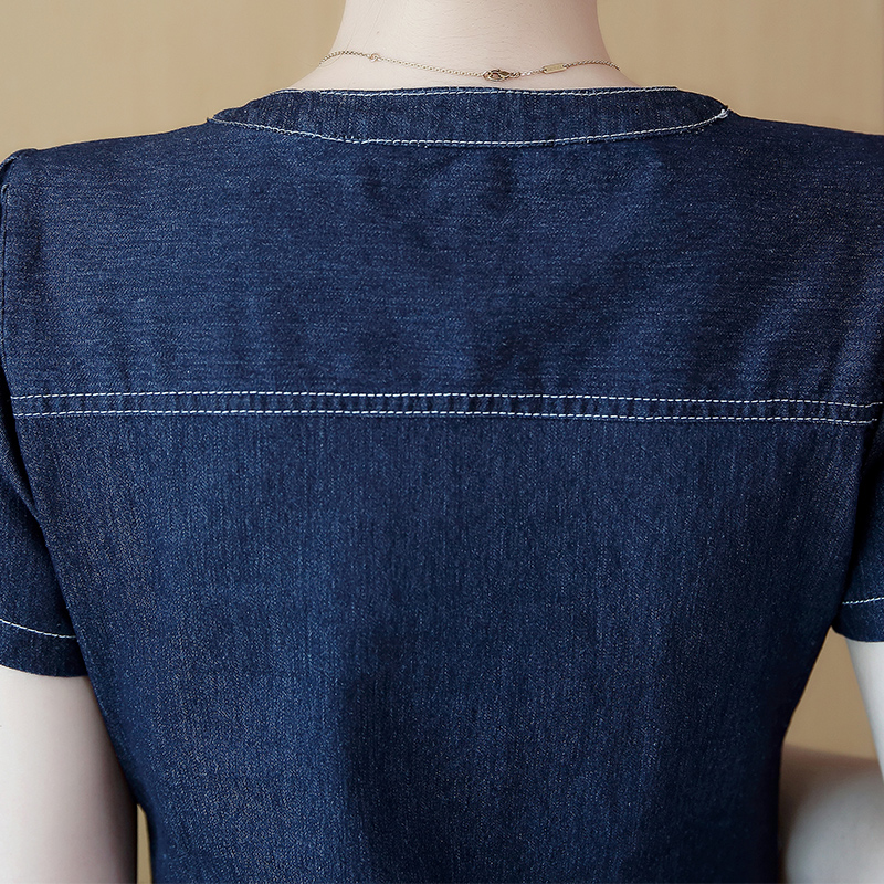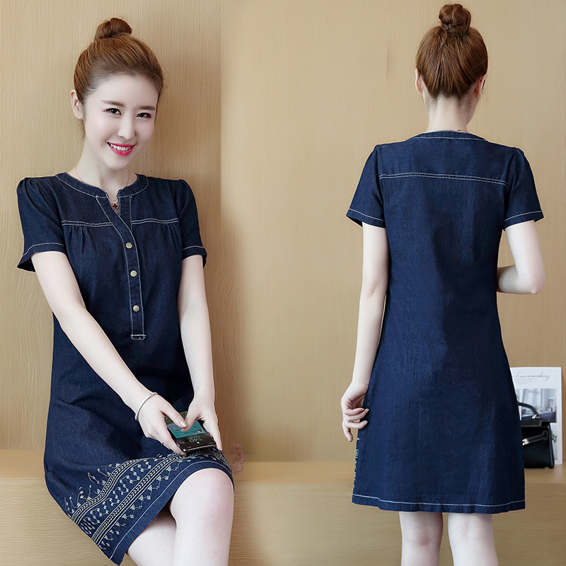 LN76359# 薄款短袖牛仔连衣裙女一步裙修身韩版长裙包臀刺绣牛仔裙