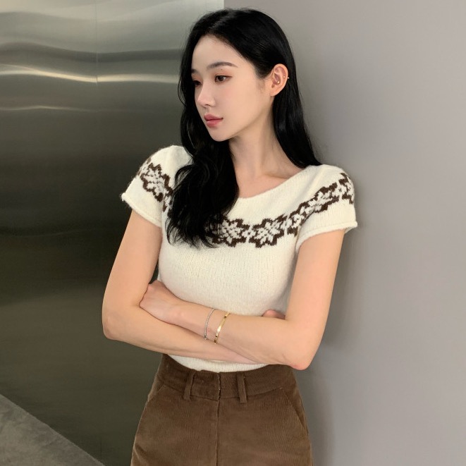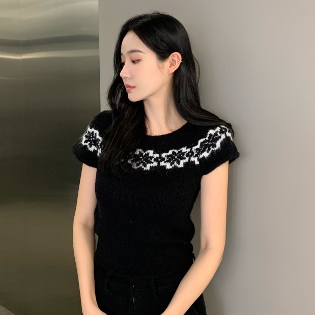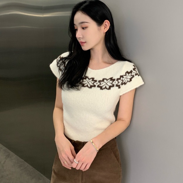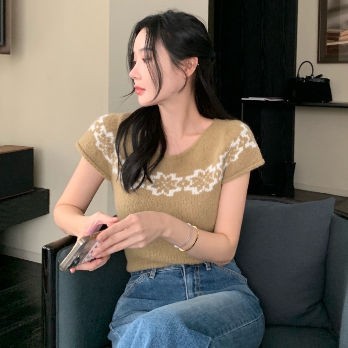 FA47403# 韩国ins软糯锁边提花短袖针织短袖毛衣 服裝批發女裝批發服飾貨源