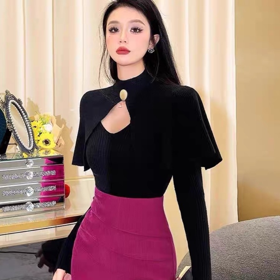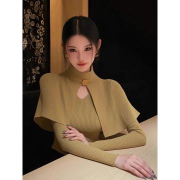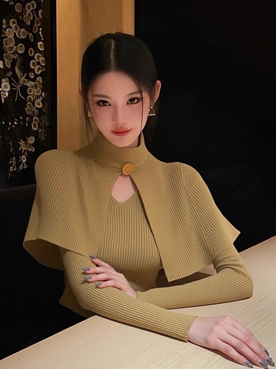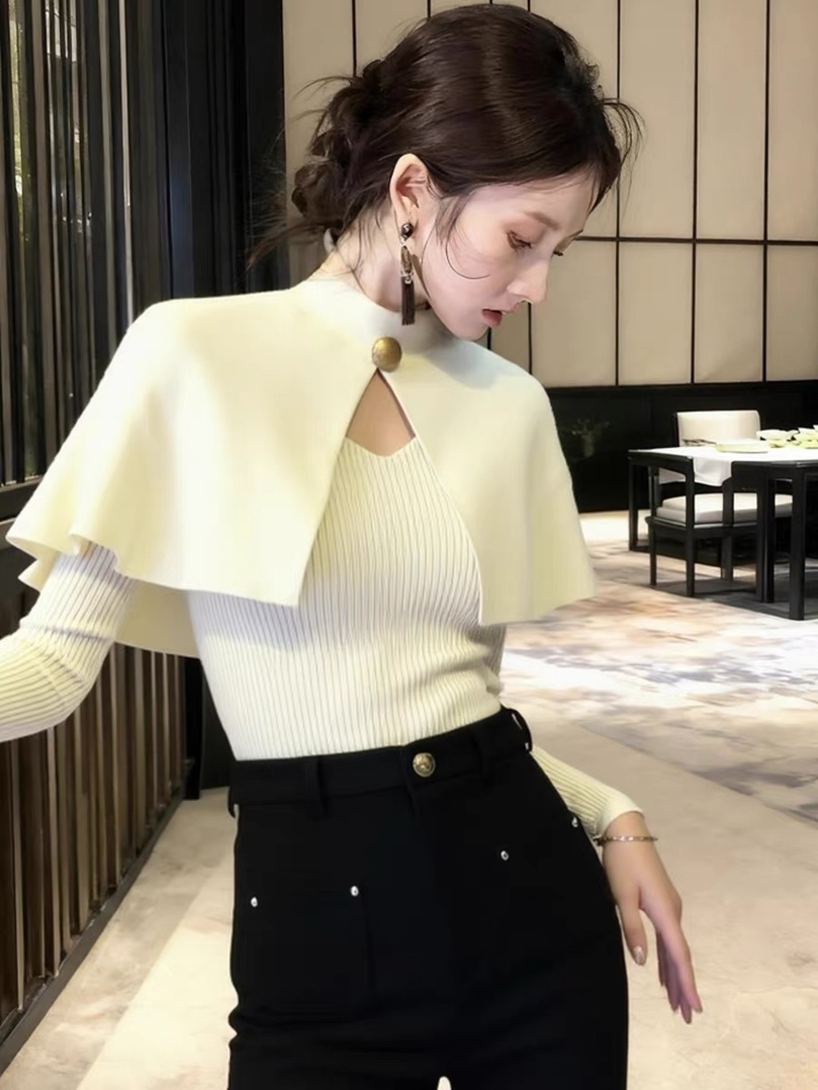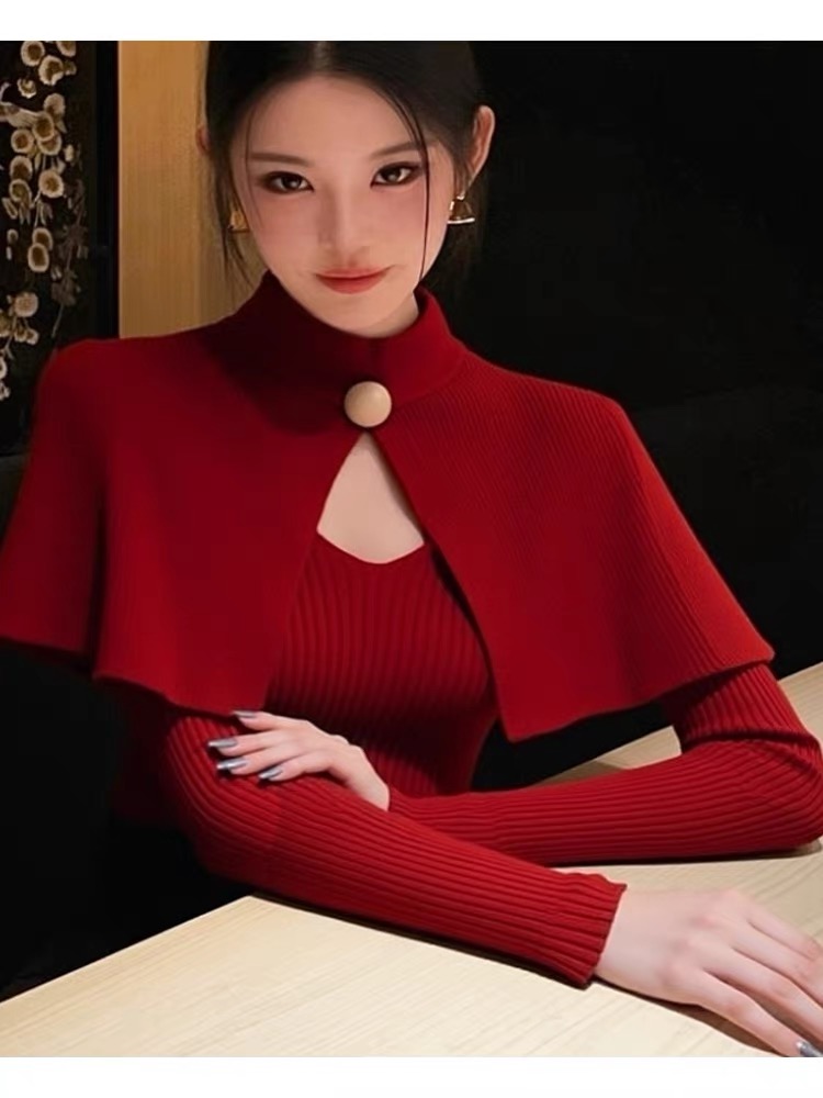 FA47528# 轻熟风假两件红色斗篷披肩针织衫秋季新款小众不撞款绝美上衣 服裝批發女裝批發服飾貨源
