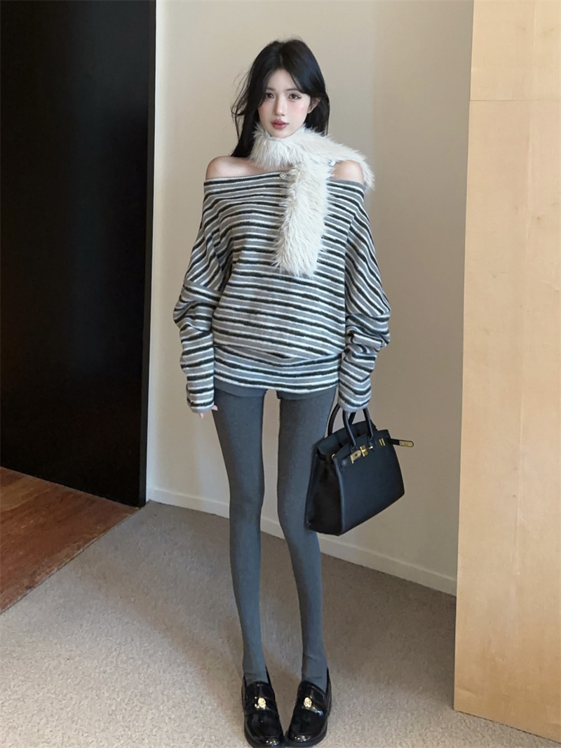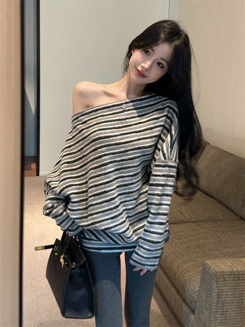 FA47541# 慵懒风柔软斜肩宽松条纹撞色长袖针织上衣 服裝批發女裝批發服飾貨源