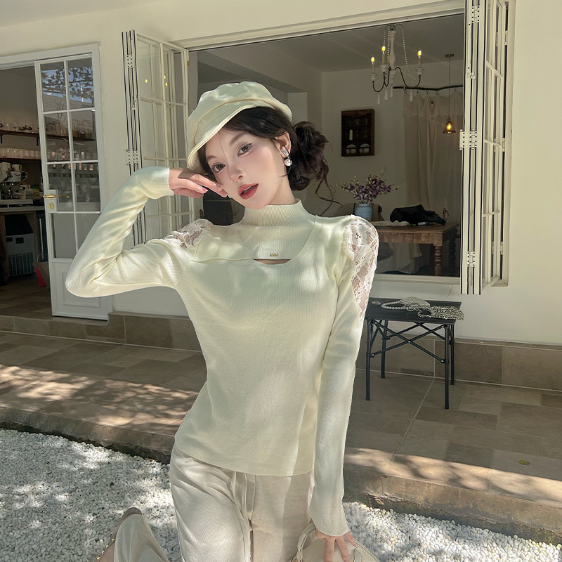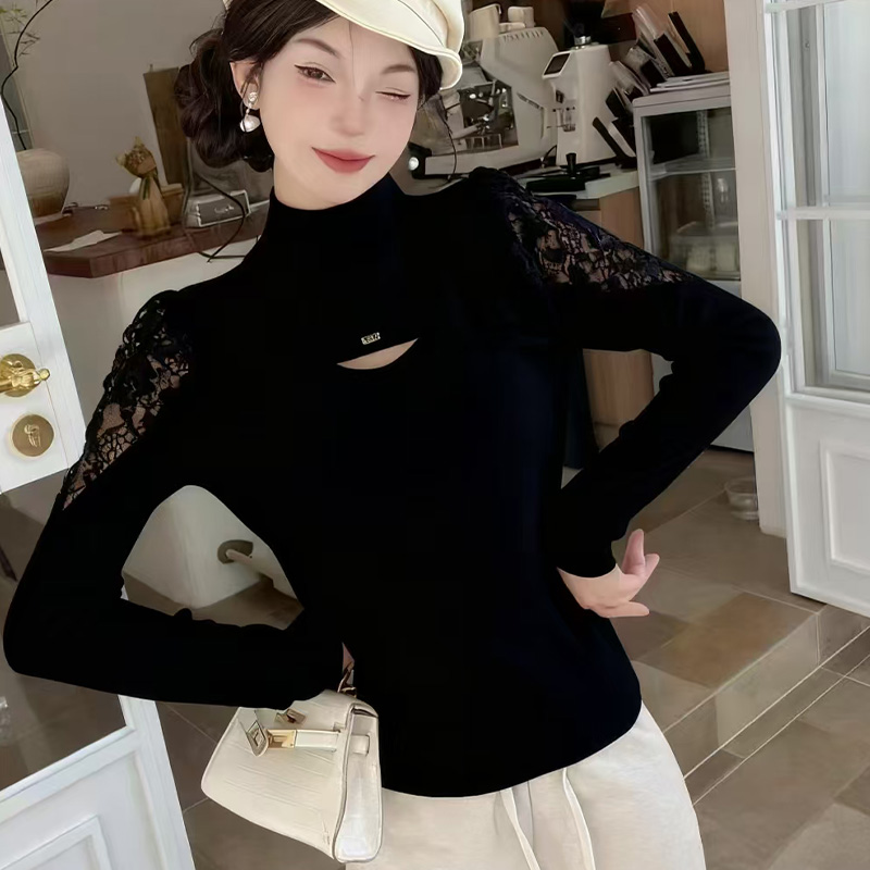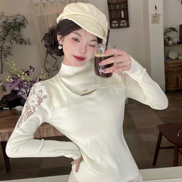 FA47548# 半高领镂空蕾丝拼接长袖毛针织衫女秋冬新款百搭显瘦打底上衣 服裝批發女裝批發服飾貨源
