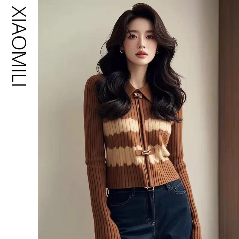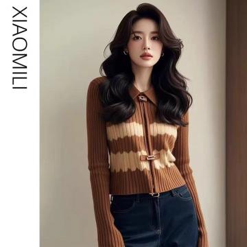 FA47577# 美拉德翻领撞色针织衫女夏季高级感毛衣打底衫复古内搭短款上衣潮 服裝批發女裝批發服飾貨源