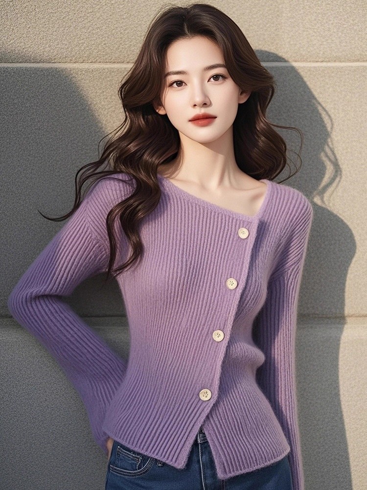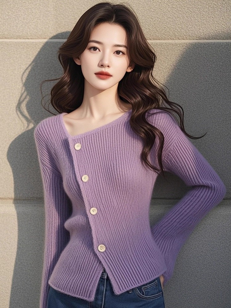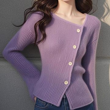 FA47579# 时尚百搭绝美紫色长袖毛衣针织打底衫女秋季款独特高级感好看小衫 服裝批發女裝批發服飾貨源