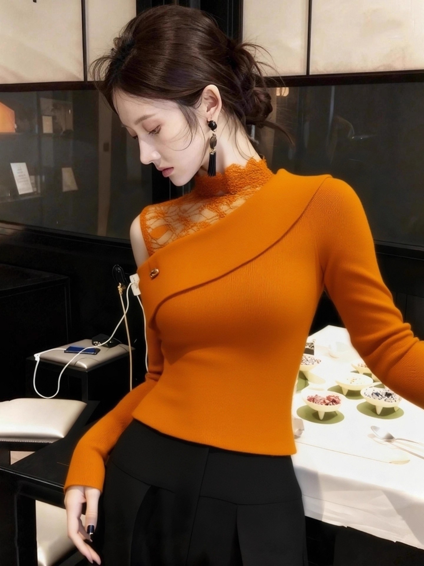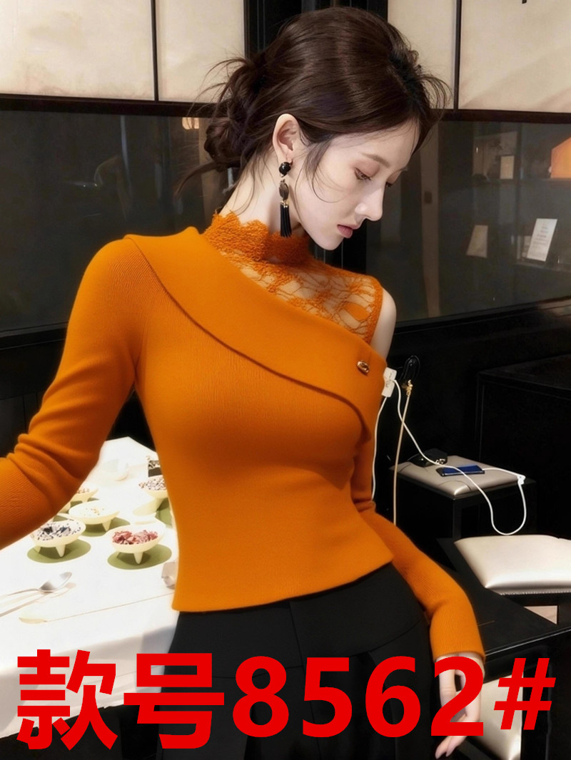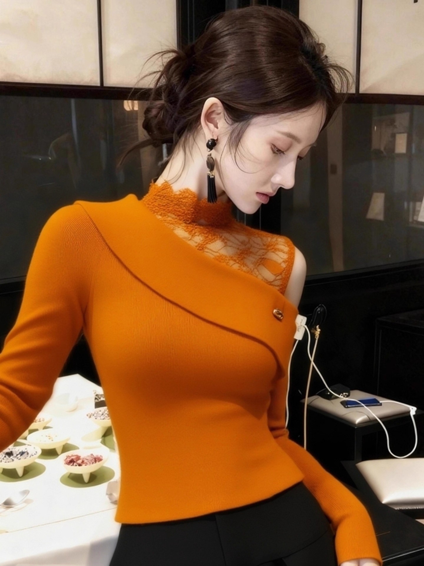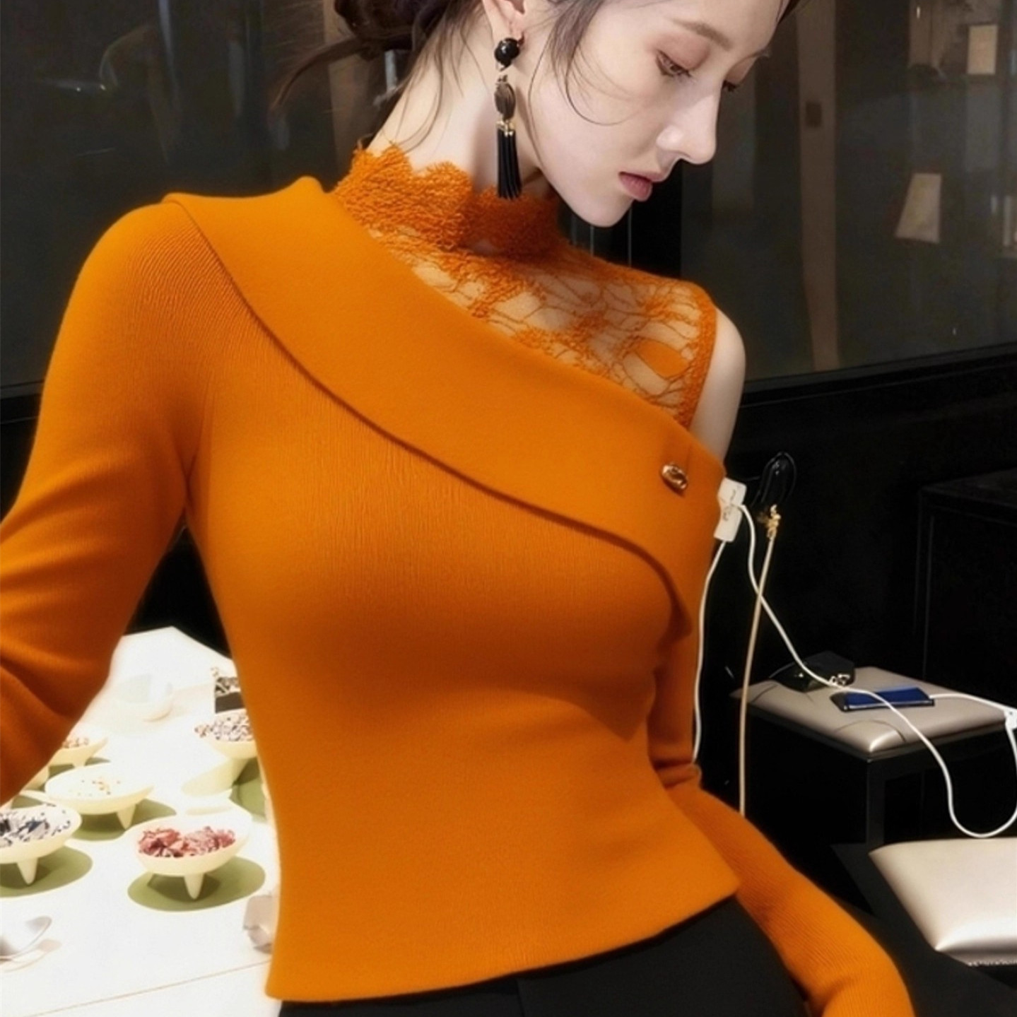 FA47590# 橙色蕾丝拼接露肩上衣女冬季小众不撞款独特漂亮修身显瘦毛衣 服裝批發女裝批發服飾貨源