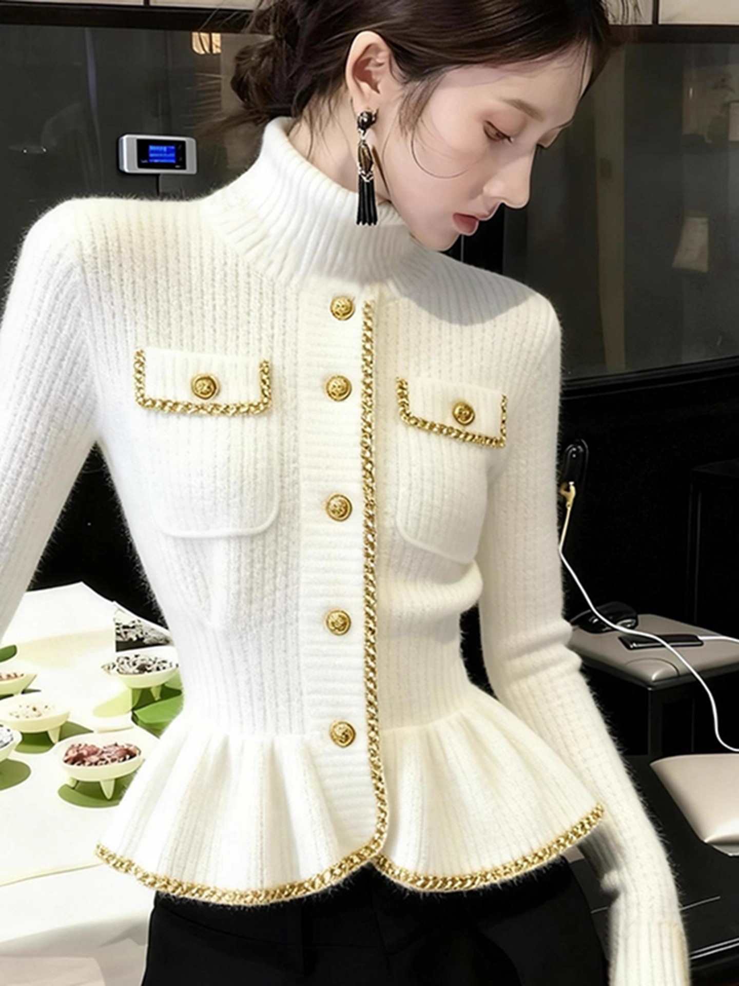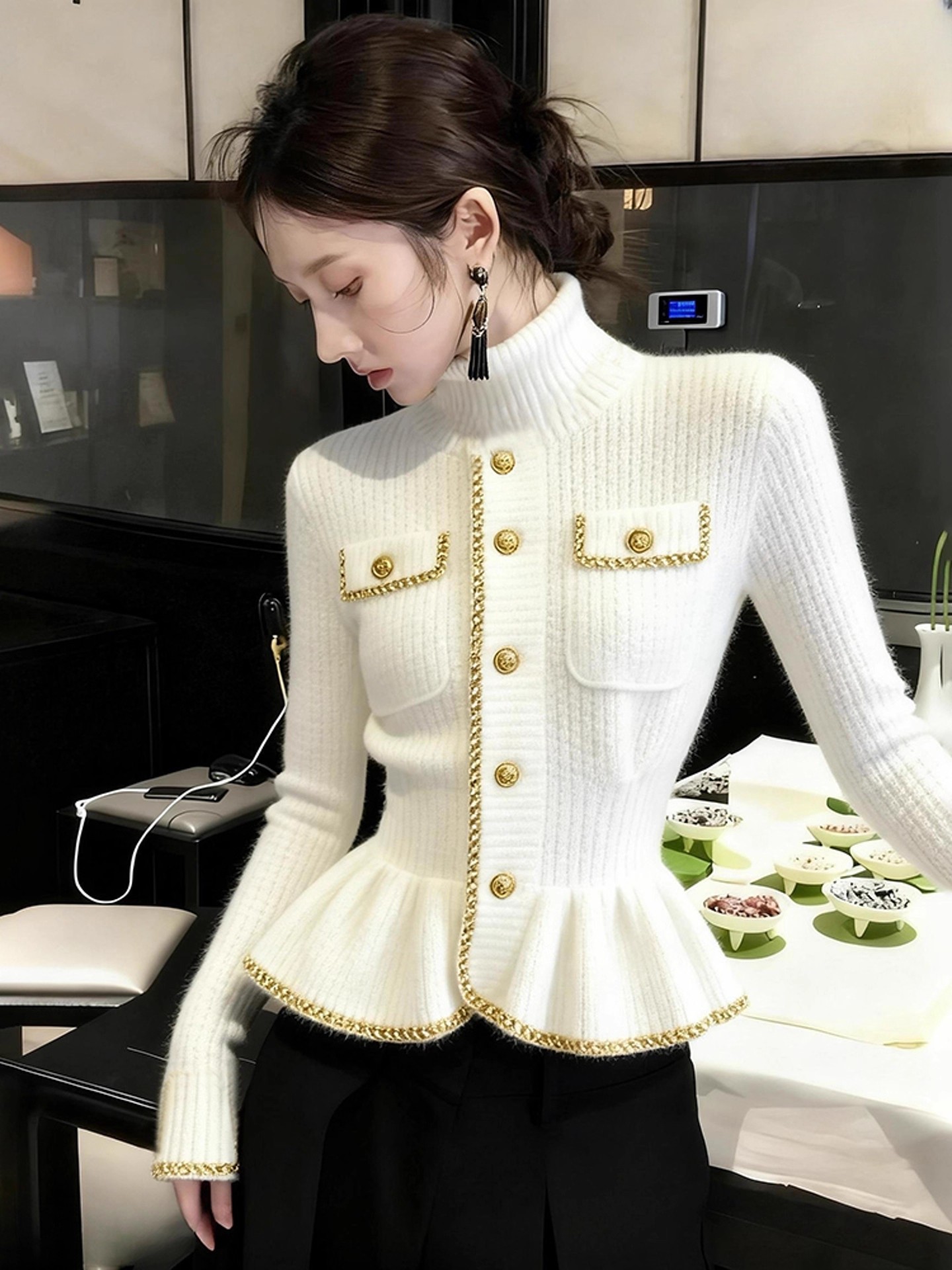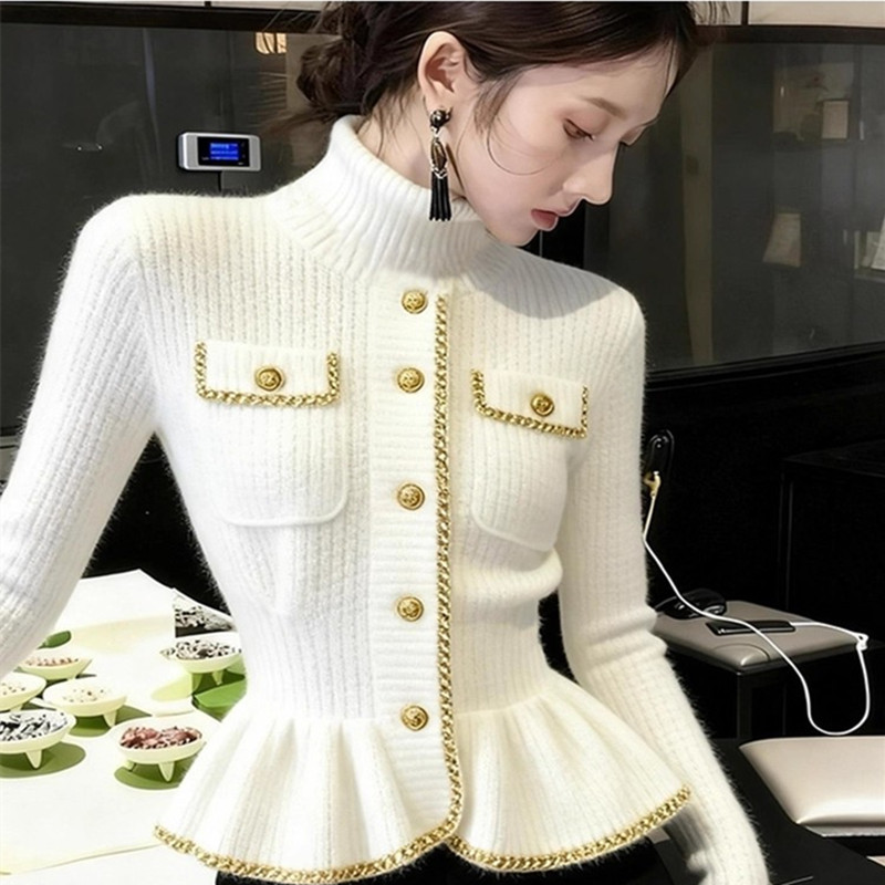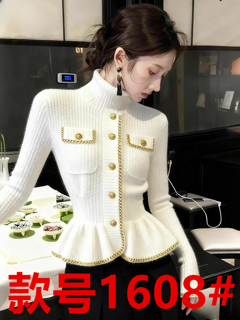 FA47592# 小香风白色高领毛衣女秋冬新款时髦洋气时尚气质掐腰针织上衣 服裝批發女裝批發服飾貨源