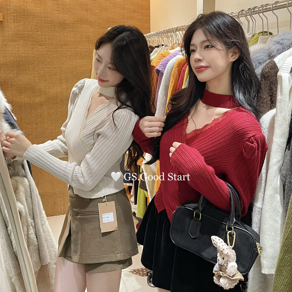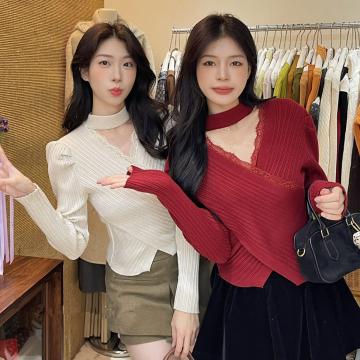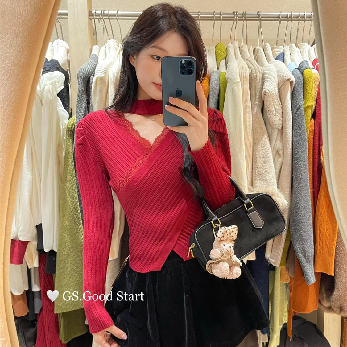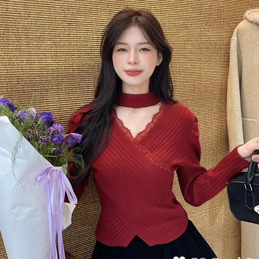 FA47676# 法式设计感蕾丝边镶边V领针织衫女秋冬新年红圣诞长袖毛衣打底衫 服裝批發女裝批發服飾貨源