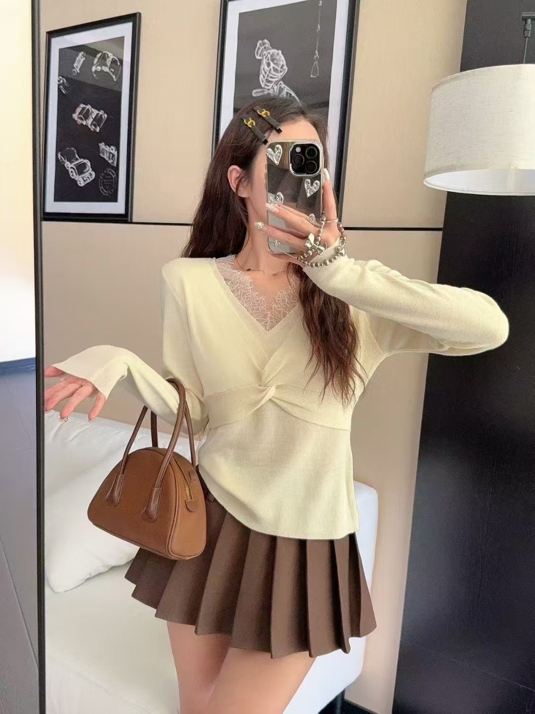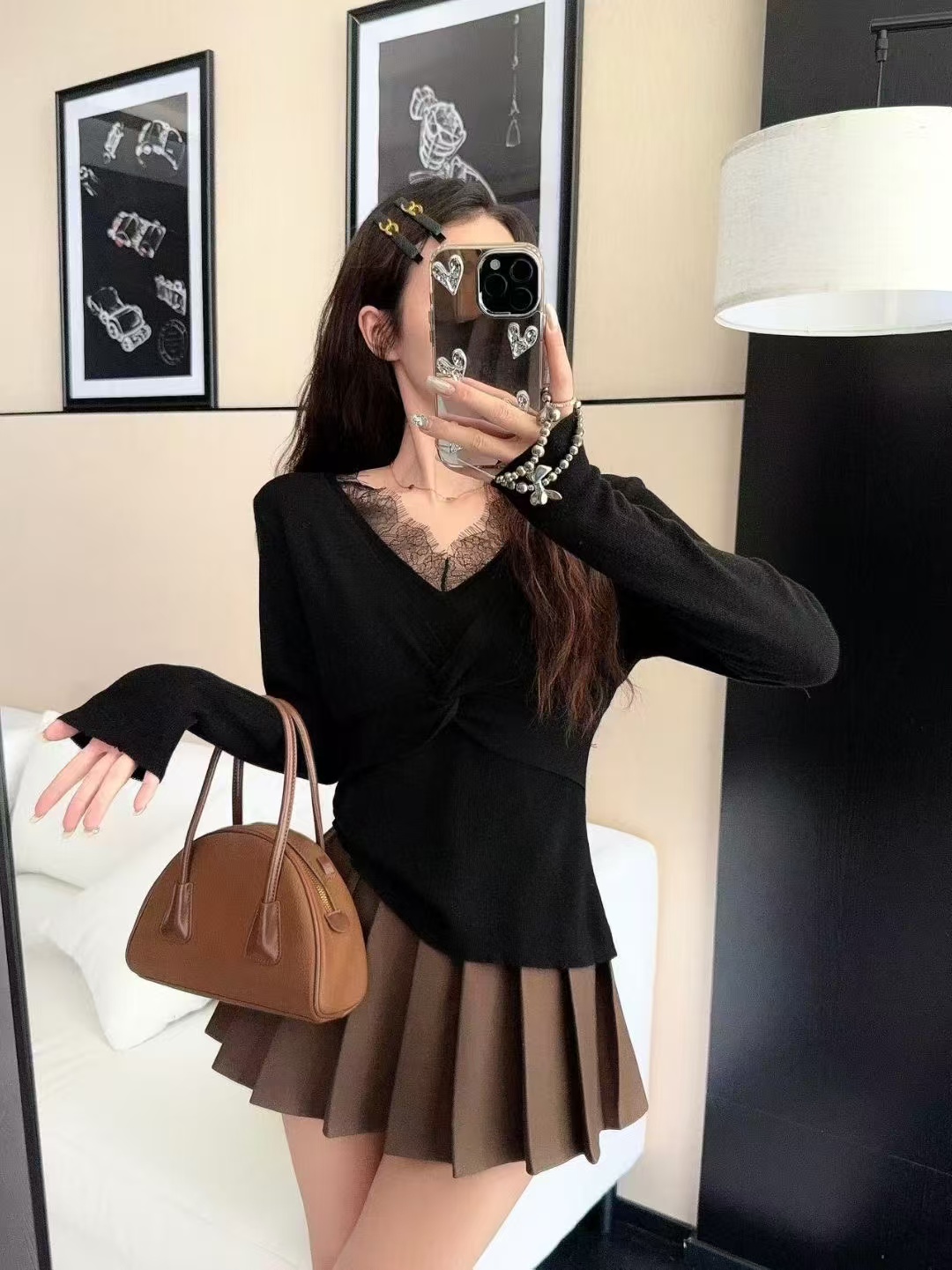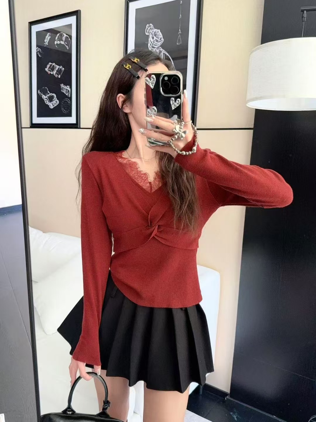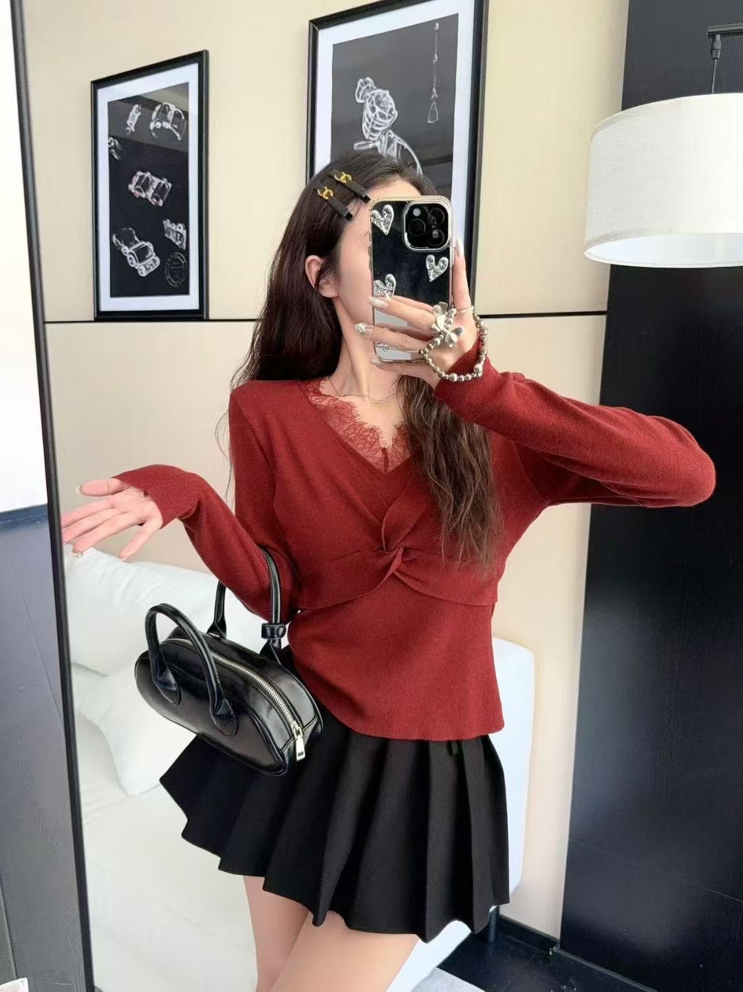 FA47704# 秋冬新款打底针织衫蕾丝拼接V领假两件上衣女修身内搭 服裝批發女裝批發服飾貨源