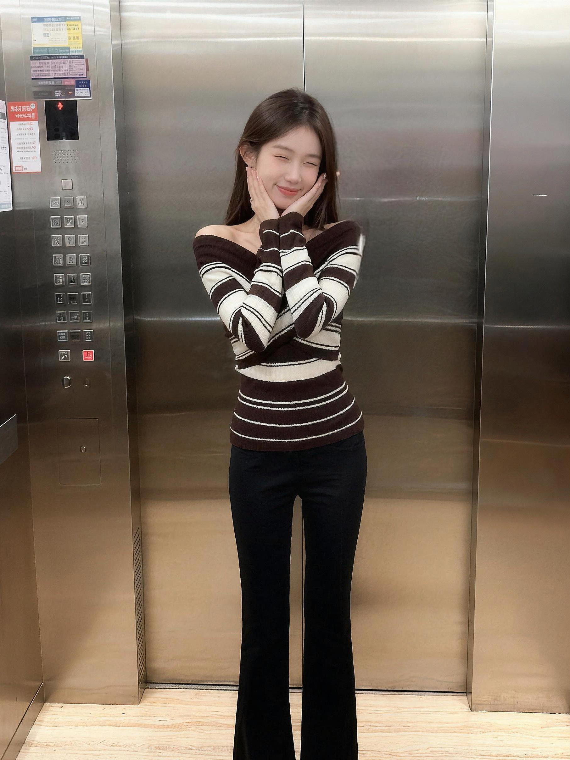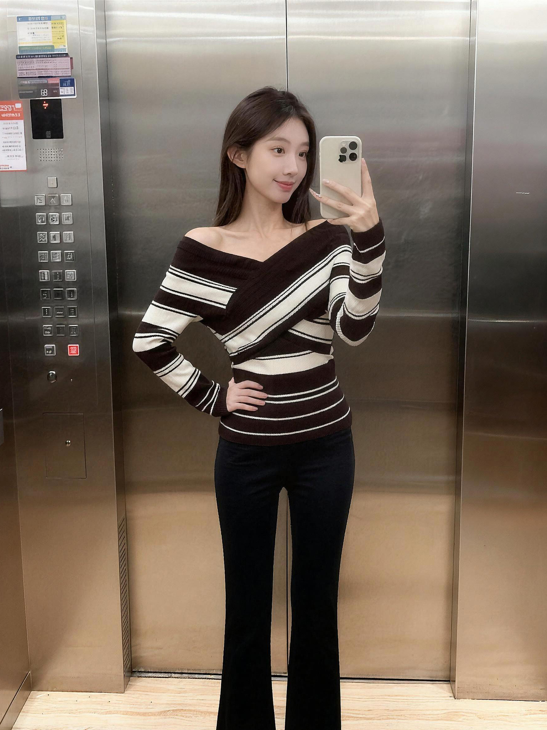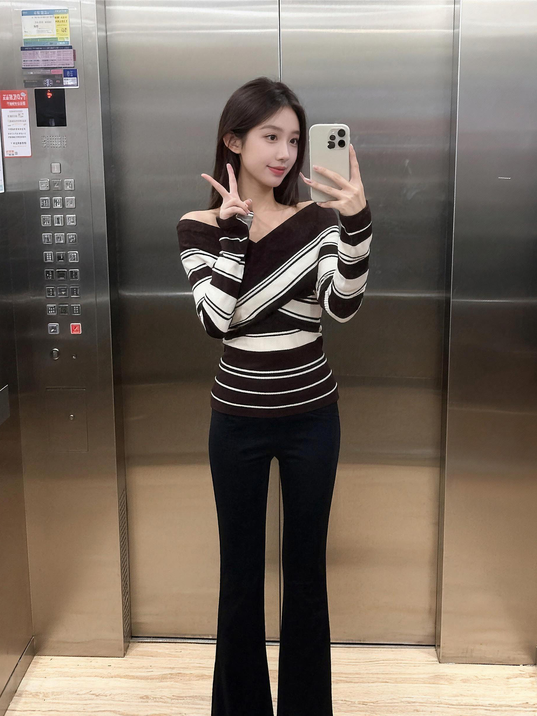 FA47716# 早秋法式交叉V领修身条纹针织衫一字肩毛衣修身上衣女 服裝批發女裝批發服飾貨源