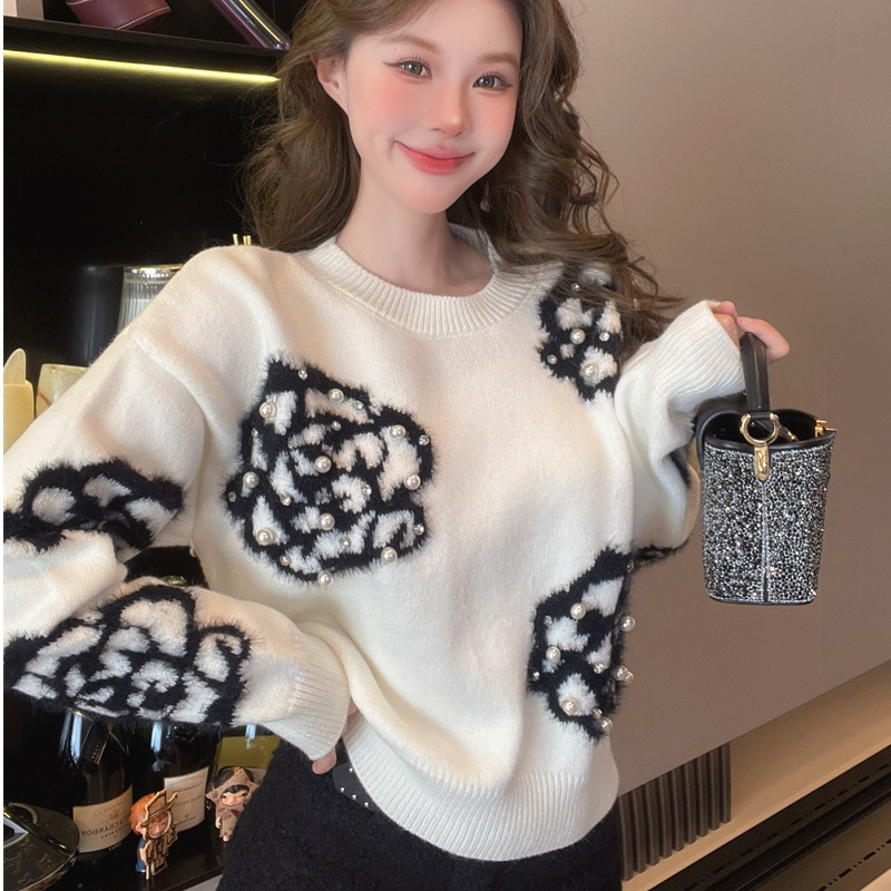 FA47757# 灰色珍珠花纹装饰毛衣女复古小众宽松圆领长袖上衣 服裝批發女裝批發服飾貨源
