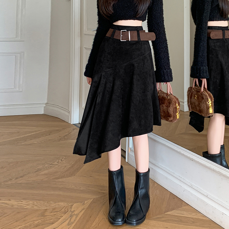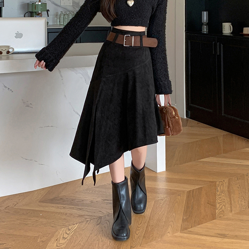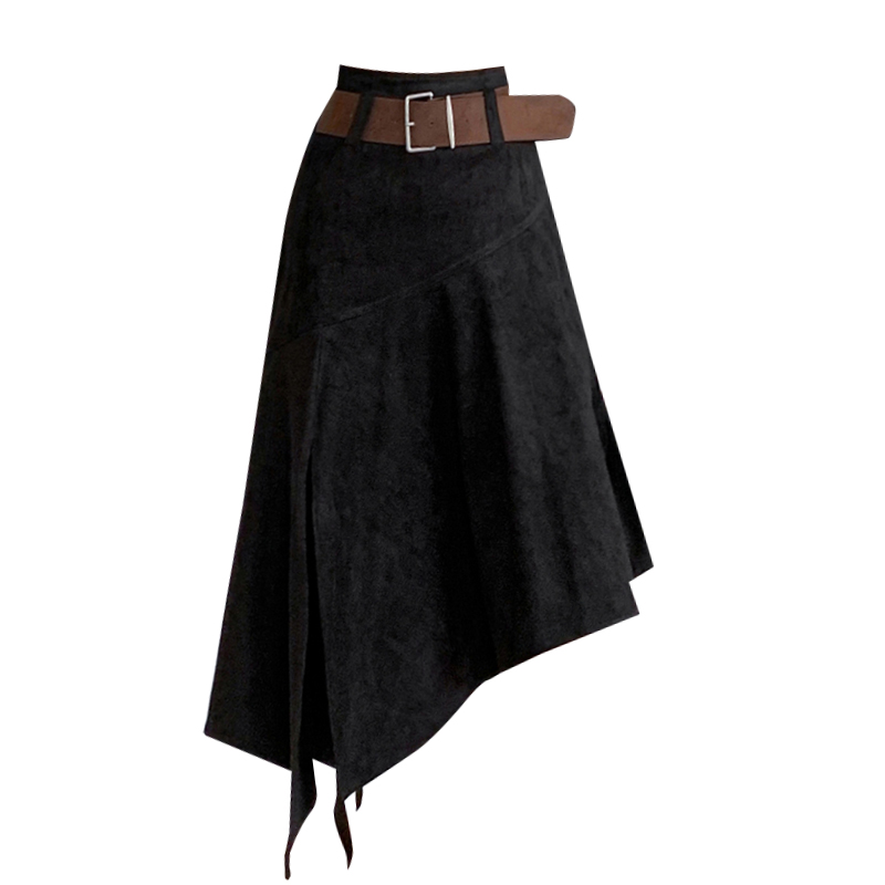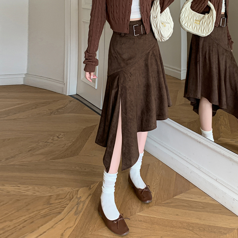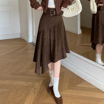 FA51916# 秋冬新款麂皮绒半身裙女老钱风不规则开叉裙摆显瘦中长款半裙 服裝批發女裝批發服飾貨源