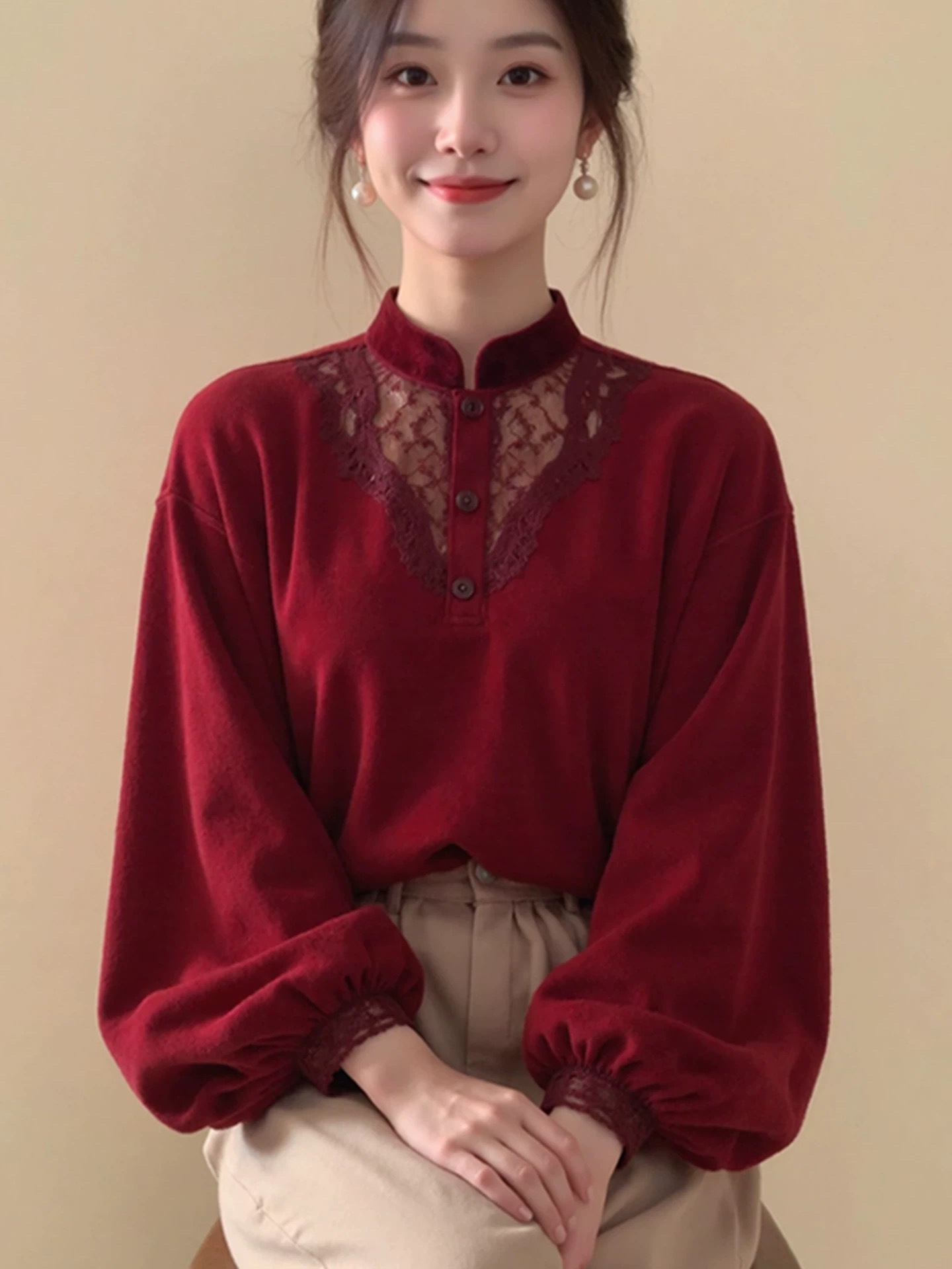 FA53856# 新中式女装红色蕾丝拼接灯笼袖丝绒旗袍上衣25冬季本命年国风外套 服裝批發女裝批發服飾貨源