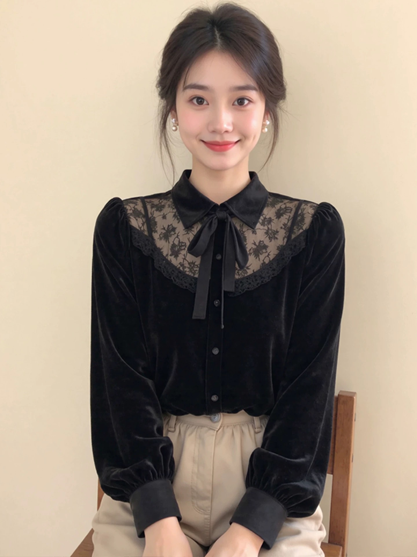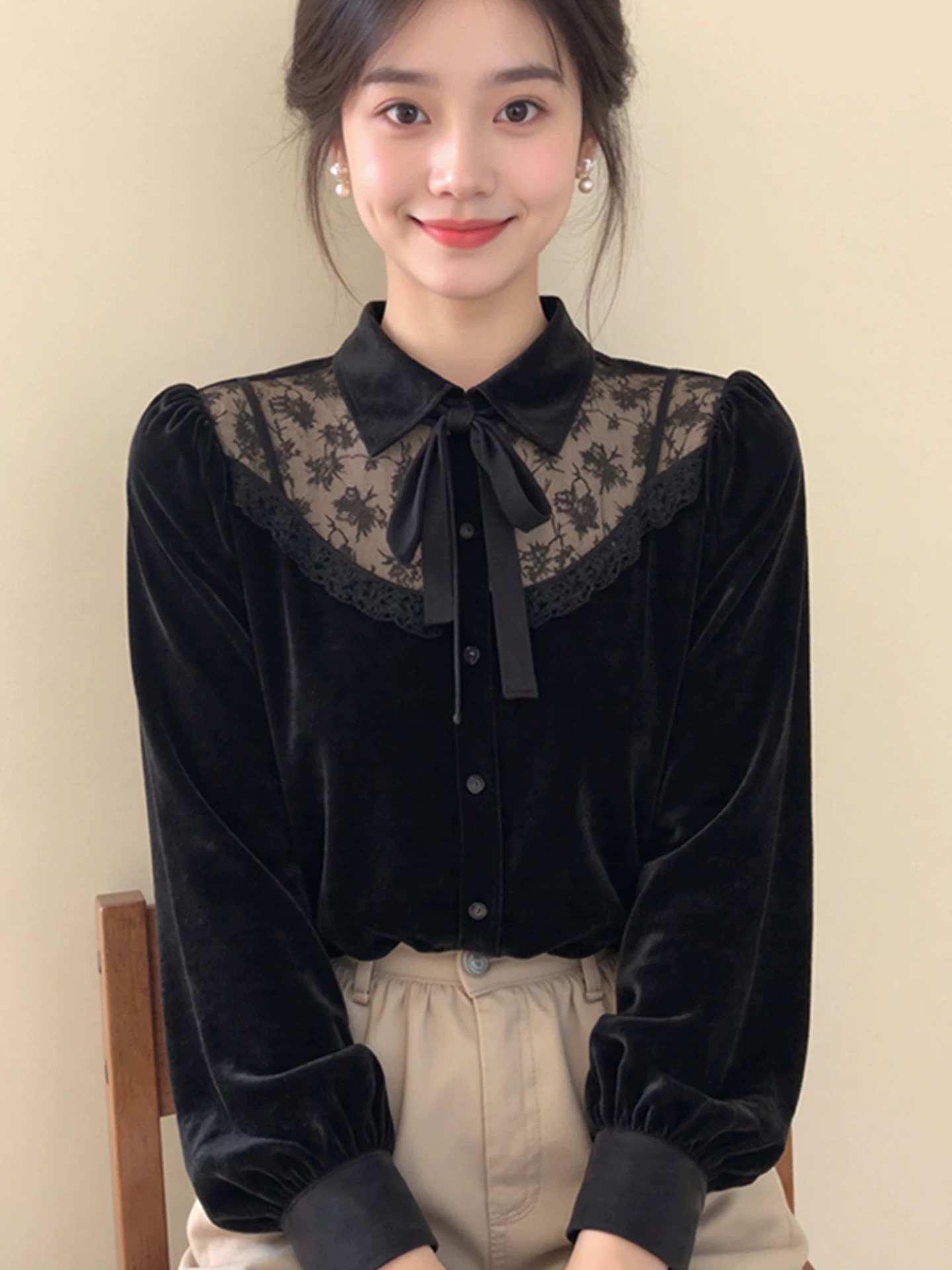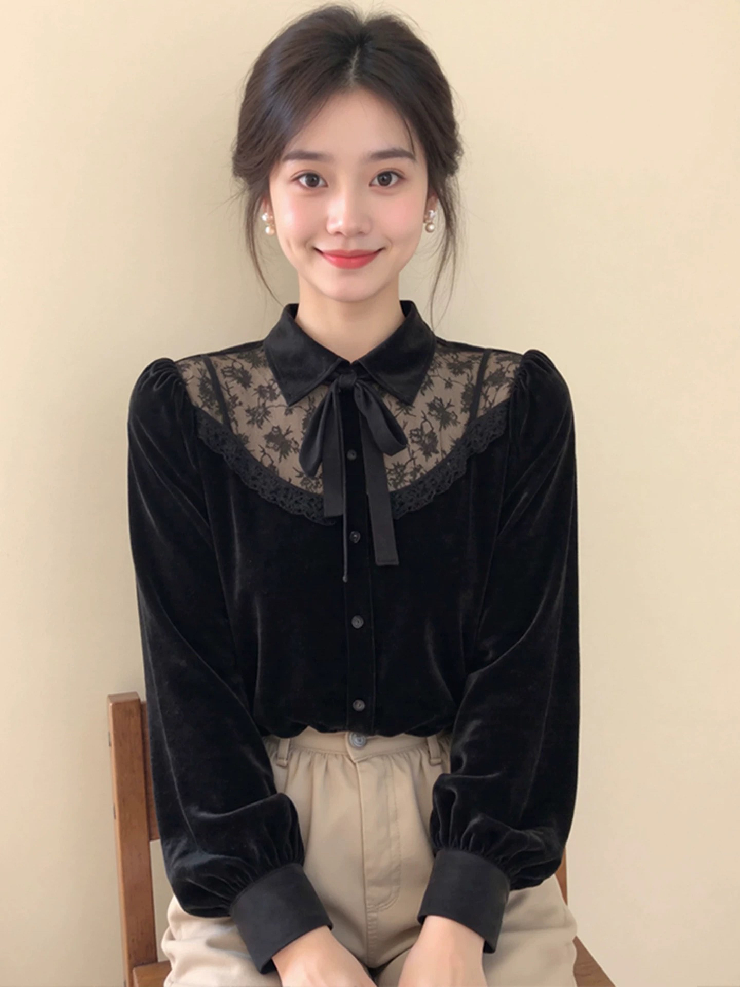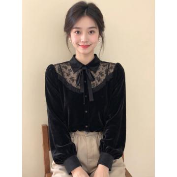 FA53857# 新中式女装黑色蕾丝拼接蝴蝶结丝绒衬衫25冬高级感超好看国风上衣 服裝批發女裝批發服飾貨源